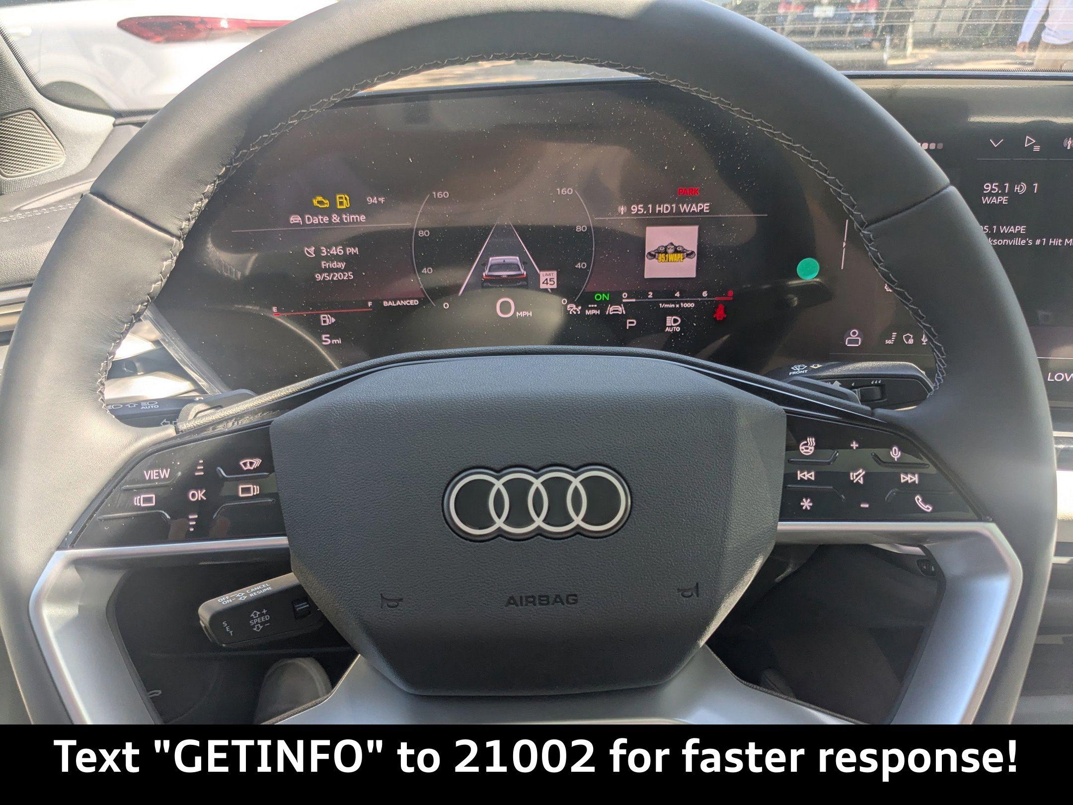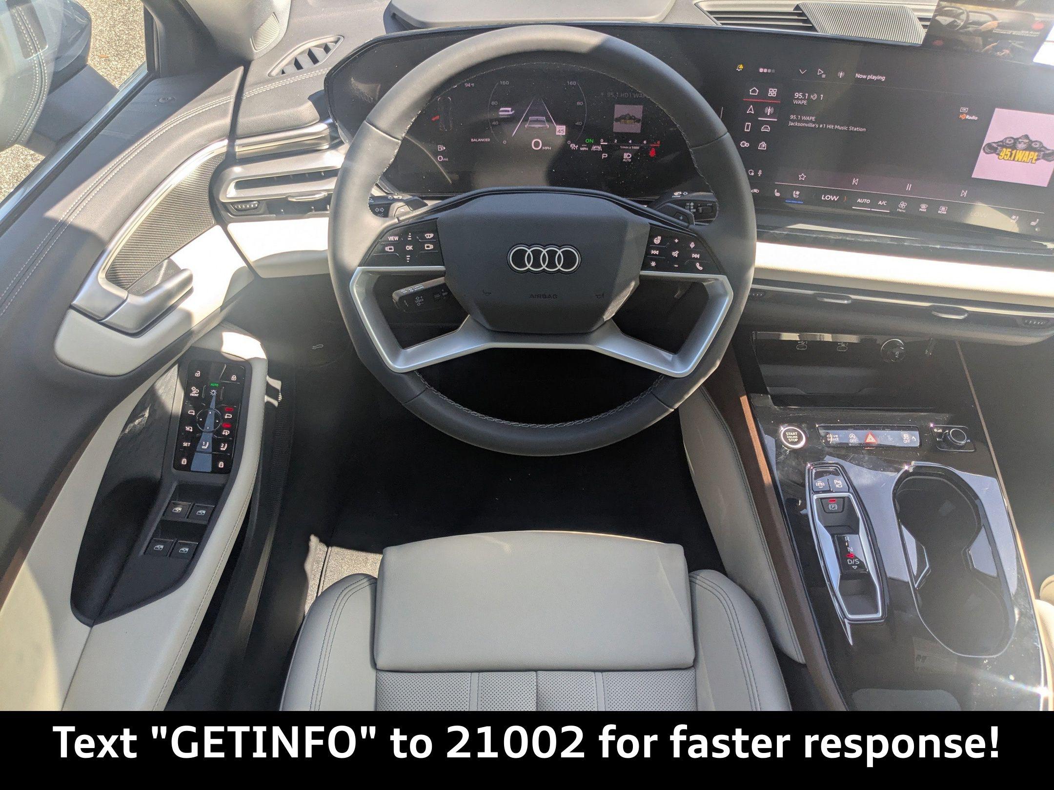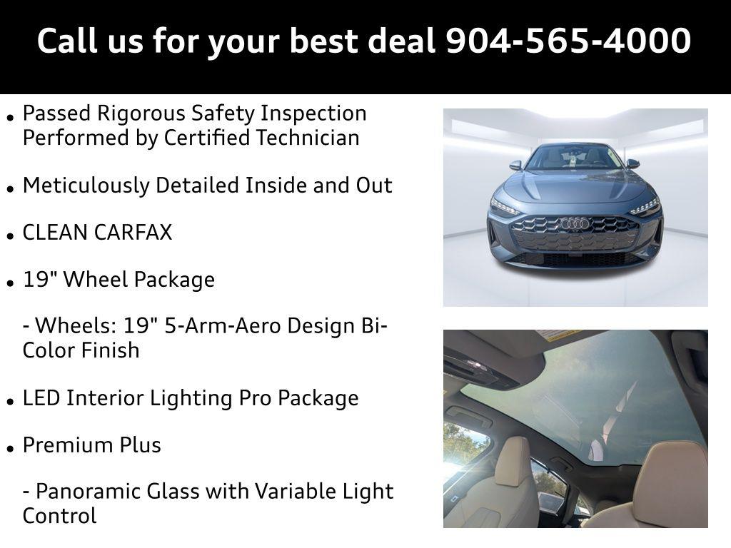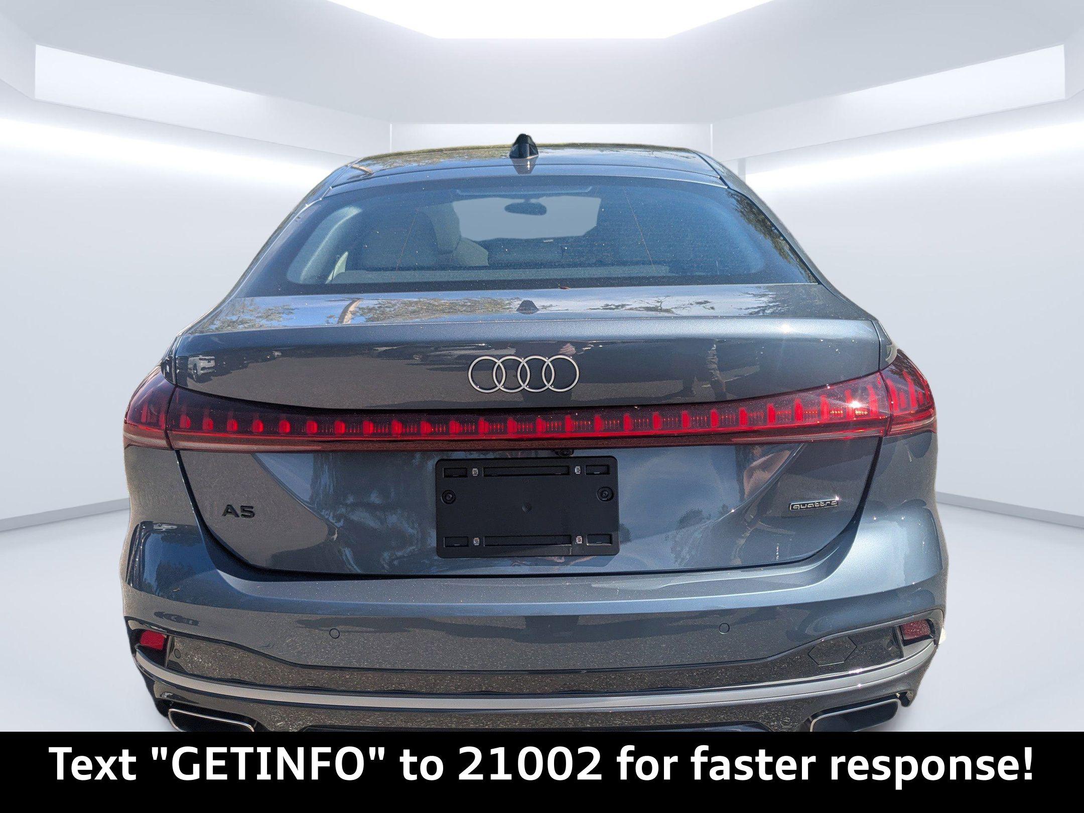 Horizon Blue Metallic 2025 Audi A5 Premium Plus quattro quattro 7-Speed Automatic S tronic 2.0L 4-Cylinder TFSI Passed Rigorous Safety Inspection Performed by Certified Technician, Meticulously Detailed Inside and Out, CLEAN CARFAX, 19"" Wheel Package, Adaptive Cruise Assist, Beige Warm Weather Package, Brown Applewood Natural Wood Inlays, Dynamic Interaction Light, Head-Up Display, LED Interior Lighting Pro Package, Manual Rear Side Window Sunshades, Park Assist Plus, Premium Plus, Top View Camera System, Wheels: 19"" 5-Arm-Aero Design Bi-Color Finish, 10 Speakers, 21"" Alloy wheels, 4-Wheel Disc Brakes, ABS brakes, Air Conditioning, Anti-whiplash front head restraints, Auto High-beam Headlights, Auto-dimming door mirrors, Auto-dimming Rear-View mirror, Automatic temperature control, Brake assist, Bumpers: body-color, Compass, Delay-off headlights, Driver door bin, Driver vanity mirror, Dual front impact airbags, Dual front side impact airbags, Electronic Stability Control, Emergency communication system: Audi connect CARE, Exterior Parking Camera Rear, Four wheel independent suspension, Front anti-roll bar, Front Bucket Seats, Front Center Armrest, Front dual zone A/C, Front fog lights, Front reading lights, Garage door transmitter: HomeLink, Genuine wood dashboard insert, Genuine wood door panel insert, Heated door mirrors, Heated Front Bucket Seats, Heated front seats, Illuminated entry, Knee airbag, Leather Seating Surfaces, Leather steering wheel, Low tire pressure warning, Memory seat, Navigation system: MMI Navigation plus, Occupant sensing airbag, Outside temperature display, Overhead airbag, Overhead console, Panic alarm, Passenger door bin, Passenger vanity mirror, Power adjustable front head restraints, Power door mirrors, Power driver seat, Power Liftgate, Power passenger seat, Power steering, Power windows, Radio data system, Radio: Audi Sound System, Rain sensing wipers, Rear air conditioning, Rear anti-roll bar, Rear reading lights, Rear seat center armrest, Rear window defroster, Remote keyless entry, Security system, Speed control, Speed-sensing steering, Speed-Sensitive Wipers, Split folding rear seat, Steering wheel mounted audio controls, Tachometer, Telescoping steering wheel, Tilt steering wheel, Traction control, Trip computer, Turn signal indicator mirrors, Variably intermittent wipers, Wheels: 18"" 5-Arm-Twist Design, 19"" Wheel Package, Adaptive Cruise Assist, Beige Warm Weather Package, Brown Applewood Natural Wood Inlays, Dynamic Interaction Light, Head-Up Display, LED Interior Lighting Pro Package, Manual Rear Side Window Sunshades, Park Assist Plus, Premium Plus, Top View Camera System, Wheels: 19"" 5-Arm-Aero Design Bi-Color Finish.22/31 City/Highway MPG