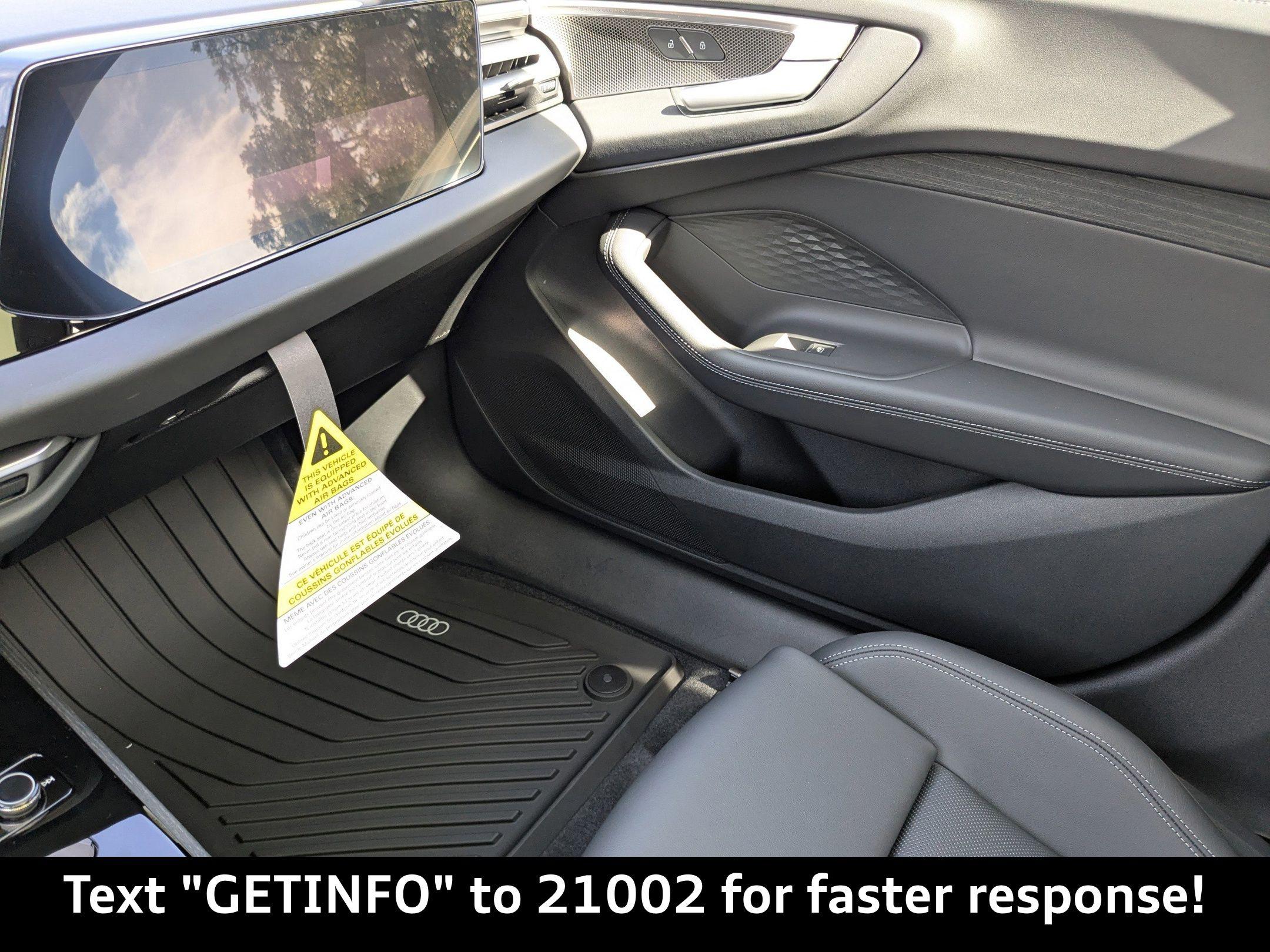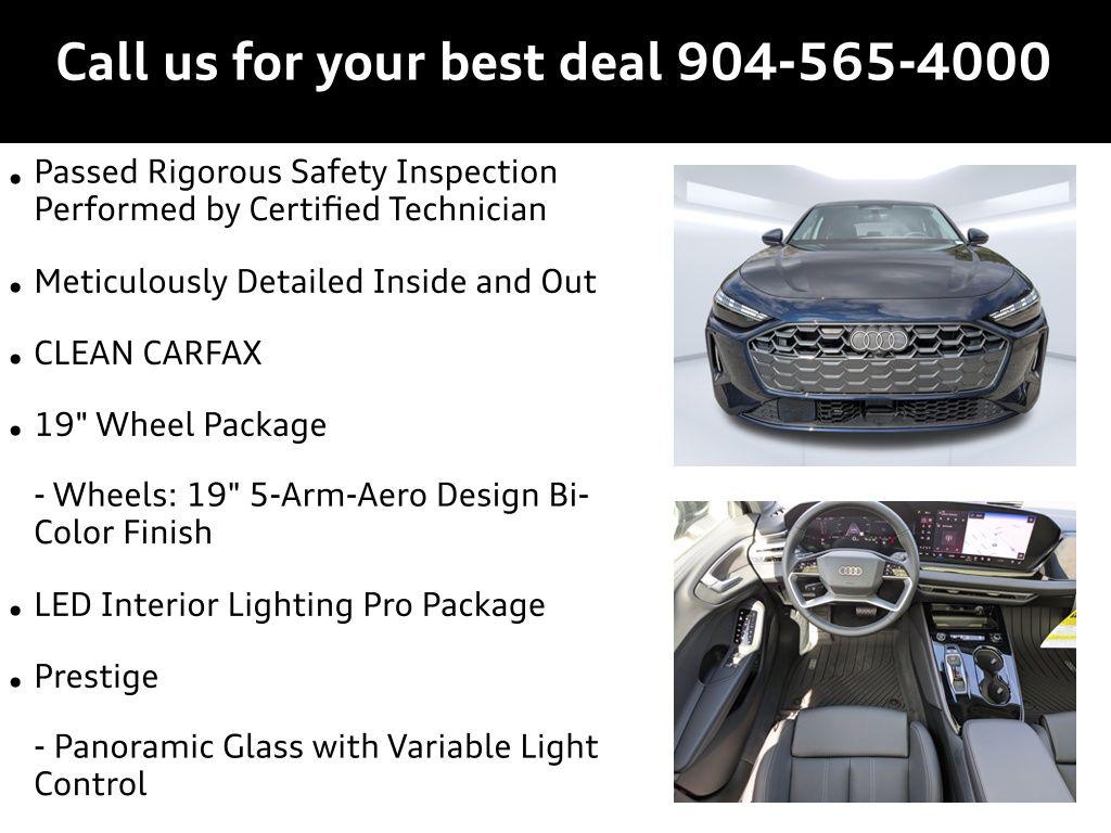 Firmament Blue Metallic 2025 Audi A5 Prestige quattro quattro 7-Speed Automatic S tronic 2.0L 4-Cylinder TFSI Passed Rigorous Safety Inspection Performed by Certified Technician, Meticulously Detailed Inside and Out, CLEAN CARFAX, 19"" Wheel Package, 7 Additional Digital DRL Signatures, Acoustic Front Door Glass, Adaptive Cruise Assist, Bang & Olufsen Front Headrest Speakers, Digital OLED Taillights, Dynamic Interaction Light, Head-Up Display, Headlight Washers, Heated Rear Seats, LED Interior Lighting Pro Package, Manual Rear Side Window Sunshades, Matrix Design LED Headlights, Park Assist Plus, Prestige, Top View Camera System, Wheels: 19"" 5-Arm-Aero Design Bi-Color Finish, 10 Speakers, 21"" Alloy wheels, 4-Wheel Disc Brakes, ABS brakes, Air Conditioning, Anti-whiplash front head restraints, Auto High-beam Headlights, Auto-dimming door mirrors, Auto-dimming Rear-View mirror, Automatic temperature control, Brake assist, Bumpers: body-color, Compass, Delay-off headlights, Driver door bin, Driver vanity mirror, Dual front impact airbags, Dual front side impact airbags, Electronic Stability Control, Emergency communication system: Audi connect CARE, Exterior Parking Camera Rear, Four wheel independent suspension, Front anti-roll bar, Front Bucket Seats, Front Center Armrest, Front dual zone A/C, Front fog lights, Front reading lights, Garage door transmitter: HomeLink, Genuine wood dashboard insert, Genuine wood door panel insert, Heated door mirrors, Heated Front Bucket Seats, Heated front seats, Illuminated entry, Knee airbag, Leather Seating Surfaces, Leather steering wheel, Low tire pressure warning, Memory seat, Navigation system: MMI Navigation plus, Occupant sensing airbag, Outside temperature display, Overhead airbag, Overhead console, Panic alarm, Passenger door bin, Passenger vanity mirror, Power adjustable front head restraints, Power door mirrors, Power driver seat, Power Liftgate, Power passenger seat, Power steering, Power windows, Radio data system, Radio: Audi Sound System, Rain sensing wipers, Rear air conditioning, Rear anti-roll bar, Rear reading lights, Rear seat center armrest, Rear window defroster, Remote keyless entry, Security system, Speed control, Speed-sensing steering, Speed-Sensitive Wipers, Split folding rear seat, Steering wheel mounted audio controls, Tachometer, Telescoping steering wheel, Tilt steering wheel, Traction control, Trip computer, Turn signal indicator mirrors, Variably intermittent wipers, Wheels: 18"" 5-Arm-Twist Design, 19"" Wheel Package, 7 Additional Digital DRL Signatures, Acoustic Front Door Glass, Adaptive Cruise Assist, Bang & Olufsen Front Headrest Speakers, Digital OLED Taillights, Dynamic Interaction Light, Head-Up Display, Headlight Washers, Heated Rear Seats, LED Interior Lighting Pro Package, Manual Rear Side Window Sunshades, Matrix Design LED Headlights, Park Assist Plus, Prestige, Top View Camera System, Wheels: 19"" 5-Arm-Aero Design Bi-Color Finish.22/31 City/Highway MPG