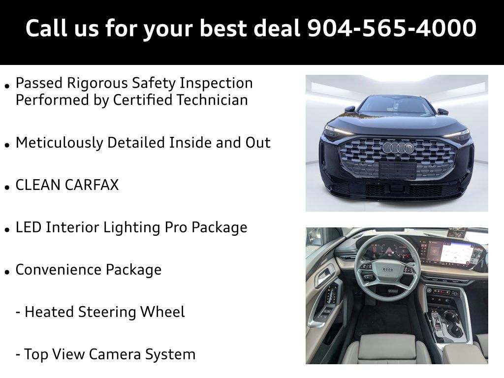Mythos Black Metallic 2025 Audi Q5 Premium Plus quattro quattro 7-Speed Automatic S tronic 2.0L 4-Cylinder TFSI Passed Rigorous Safety Inspection Performed by Certified Technician, Meticulously Detailed Inside and Out, CLEAN CARFAX, Adaptive Cruise Assist, Brown Warm Weather Package, Convenience Package, Dynamic Interaction Light, Head-Up Display, Headlight Washers, Heated Steering Wheel, LED Interior Lighting Pro Package, Light Brown Walnut Trunk Natural Wood Inlays, Manual Rear Side Window Sunshades, Panoramic Sunroof, Premium Plus, Top View Camera System, Ventilated Front Sport Seats, Wheels: 19"" 5-Double-Spoke Design, 10 Speakers, 21"" Alloy wheels, 4-Wheel Disc Brakes, ABS brakes, Air Conditioning, AM/FM radio: SiriusXM w/360L, Auto High-beam Headlights, Auto tilt-away steering wheel, Auto-dimming door mirrors, Auto-dimming Rear-View mirror, Automatic temperature control, Brake assist, Bumpers: body-color, Compass, Delay-off headlights, Driver door bin, Driver vanity mirror, Dual front impact airbags, Dual front side impact airbags, Electronic Stability Control, Emergency communication system: Audi connect CARE, Exterior Parking Camera Rear, Four wheel independent suspension, Front anti-roll bar, Front Bucket Seats, Front Center Armrest, Front dual zone A/C, Front fog lights, Front reading lights, Garage door transmitter: HomeLink, Genuine wood console insert, Genuine wood dashboard insert, Genuine wood door panel insert, Heated door mirrors, Heated Front Bucket Seats, Heated front seats, Illuminated entry, Leather Seating Surfaces, Leather steering wheel, Low tire pressure warning, Memory seat, Navigation system: Audi Navigation Plus, Occupant sensing airbag, Outside temperature display, Overhead airbag, Overhead console, Panic alarm, Passenger door bin, Passenger vanity mirror, Power door mirrors, Power driver seat, Power Liftgate, Power passenger seat, Power steering, Power windows, Radio data system, Radio: MMI Navigation Plus, Rain sensing wipers, Rear air conditioning, Rear anti-roll bar, Rear fog lights, Rear reading lights, Rear seat center armrest, Rear window defroster, Rear window wiper, Remote keyless entry, Roof rack, Security system, Speed control, Speed-sensing steering, Speed-Sensitive Wipers, Split folding rear seat, Spoiler, Steering wheel mounted audio controls, Tachometer, Telescoping steering wheel, Tilt steering wheel, Traction control, Trip computer, Turn signal indicator mirrors, Variably intermittent wipers, Wheels: 18"" 5-Arm-Twist Design, Adaptive Cruise Assist, Brown Warm Weather Package, Convenience Package, Dynamic Interaction Light, Head-Up Display, Headlight Washers, Heated Steering Wheel, LED Interior Lighting Pro Package, Light Brown Walnut Trunk Natural Wood Inlays, Manual Rear Side Window Sunshades, Panoramic Sunroof, Premium Plus, Top View Camera System, Ventilated Front Sport Seats, Wheels: 19"" 5-Double-Spoke Design.22/30 City/Highway MPG