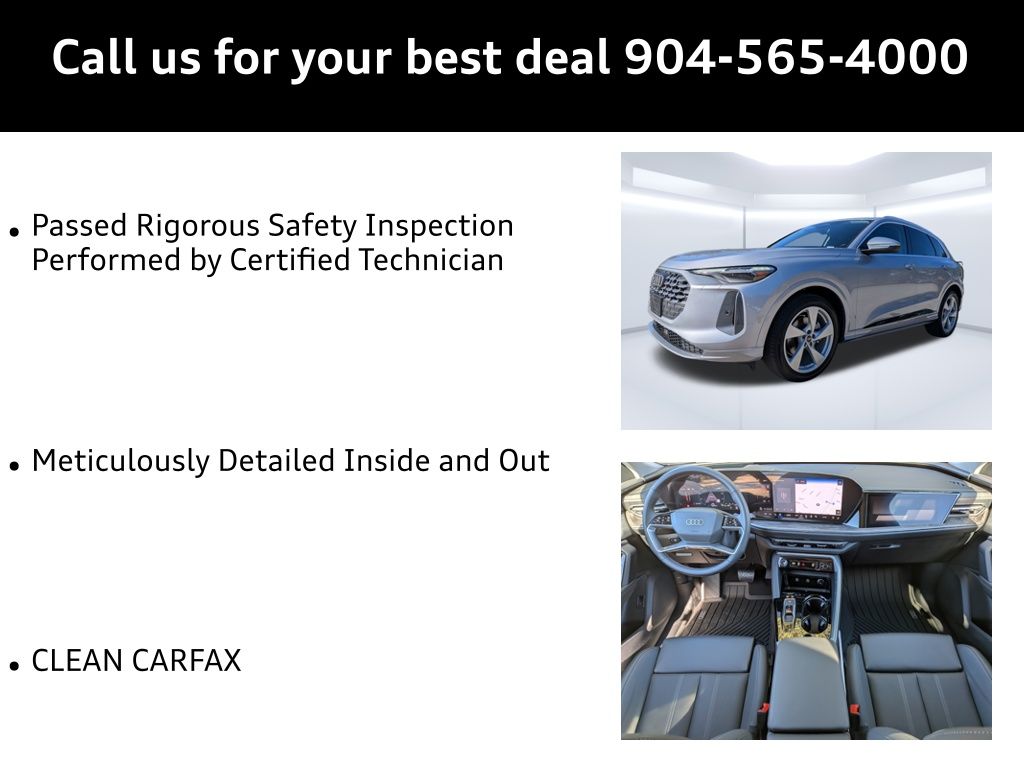 Florett Silver Metallic 2025 Audi Q5 Prestige quattro quattro 7-Speed Automatic S tronic 2.0L 4-Cylinder TFSI Passed Rigorous Safety Inspection Performed by Certified Technician, Meticulously Detailed Inside and Out, CLEAN CARFAX, 10 Speakers, 21"" Alloy wheels, 4-Wheel Disc Brakes, ABS brakes, Air Conditioning, AM/FM radio: SiriusXM w/360L, Auto High-beam Headlights, Auto tilt-away steering wheel, Auto-dimming door mirrors, Auto-dimming Rear-View mirror, Automatic temperature control, Brake assist, Bumpers: body-color, Compass, Delay-off headlights, Driver door bin, Driver vanity mirror, Dual front impact airbags, Dual front side impact airbags, Electronic Stability Control, Emergency communication system: Audi connect CARE, Exterior Parking Camera Rear, Four wheel independent suspension, Front anti-roll bar, Front Bucket Seats, Front Center Armrest, Front dual zone A/C, Front fog lights, Front reading lights, Garage door transmitter: HomeLink, Genuine wood console insert, Genuine wood dashboard insert, Genuine wood door panel insert, Heated door mirrors, Heated Front Bucket Seats, Heated front seats, Illuminated entry, Leather Seating Surfaces, Leather steering wheel, Low tire pressure warning, Memory seat, Navigation system: Audi Navigation Plus, Occupant sensing airbag, Outside temperature display, Overhead airbag, Overhead console, Panic alarm, Passenger door bin, Passenger vanity mirror, Power door mirrors, Power driver seat, Power Liftgate, Power passenger seat, Power steering, Power windows, Radio data system, Radio: MMI Navigation Plus, Rain sensing wipers, Rear air conditioning, Rear anti-roll bar, Rear fog lights, Rear reading lights, Rear seat center armrest, Rear window defroster, Rear window wiper, Remote keyless entry, Roof rack, Security system, Speed control, Speed-sensing steering, Speed-Sensitive Wipers, Split folding rear seat, Spoiler, Steering wheel mounted audio controls, Tachometer, Telescoping steering wheel, Tilt steering wheel, Traction control, Trip computer, Turn signal indicator mirrors, Variably intermittent wipers, Wheels: 18"" 5-Arm-Twist Design.22/30 City/Highway MPG