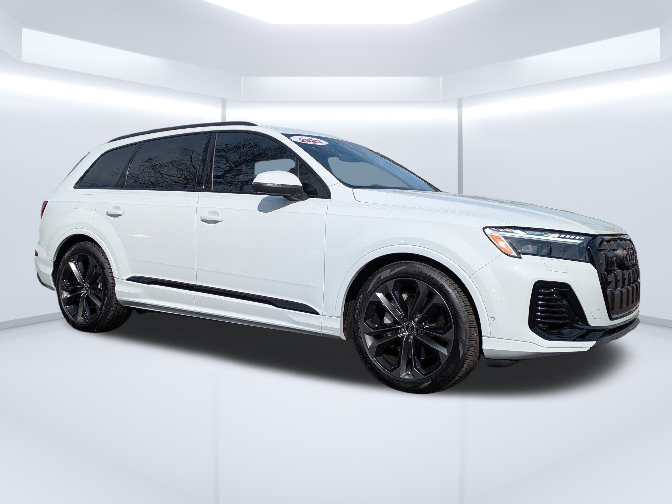 Glacier White Metallic 2025 Audi Q7 Prestige quattro quattro 8-Speed Automatic with Tiptronic 3.0L TFSI Passed Rigorous Safety Inspection Performed by Certified Technician, Meticulously Detailed Inside and Out, CLEAN CARFAX, 10 Speakers, 21"" Alloy wheels, 3rd row seats: bench, 4-Wheel Disc Brakes, ABS brakes, Air Conditioning, AM/FM radio: SiriusXM w/360L, Auto High-beam Headlights, Auto-dimming door mirrors, Auto-dimming Rear-View mirror, Automatic temperature control, Brake assist, Bumpers: body-color, Compass, Delay-off headlights, Driver door bin, Driver vanity mirror, Dual front impact airbags, Dual front side impact airbags, Electronic Stability Control, Emergency communication system: Audi connect CARE, Exterior Parking Camera Rear, Four wheel independent suspension, Front anti-roll bar, Front Bucket Seats, Front Center Armrest, Front dual zone A/C, Front fog lights, Front reading lights, Fully automatic headlights, Garage door transmitter: HomeLink, Genuine wood door panel insert, Heated door mirrors, Heated Front Bucket Seats, Heated front seats, Illuminated entry, Leather Seating Surfaces, Leather Shift Knob, Leather steering wheel, Low tire pressure warning, Memory seat, Navigation system: Audi MMI Navigation plus with Touch Response, Occupant sensing airbag, Outside temperature display, Overhead airbag, Overhead console, Panic alarm, Passenger door bin, Passenger vanity mirror, Power door mirrors, Power driver seat, Power Liftgate, Power moonroof: Panoramic, Power passenger seat, Power steering, Power windows, Radio data system, Radio: Audi Sound System, Rain sensing wipers, Rear air conditioning, Rear anti-roll bar, Rear fog lights, Rear reading lights, Rear seat center armrest, Rear side impact airbag, Rear window defroster, Rear window wiper, Reclining 3rd row seat, Remote keyless entry, Security system, Speed control, Speed-sensing steering, Split folding rear seat, Spoiler, Steering wheel memory, Steering wheel mounted audio controls, Tachometer, Telescoping steering wheel, Tilt steering wheel, Traction control, Trip computer, Turn signal indicator mirrors, Variably intermittent wipers, Wheels: 19"" 5-Arm-Star Design.