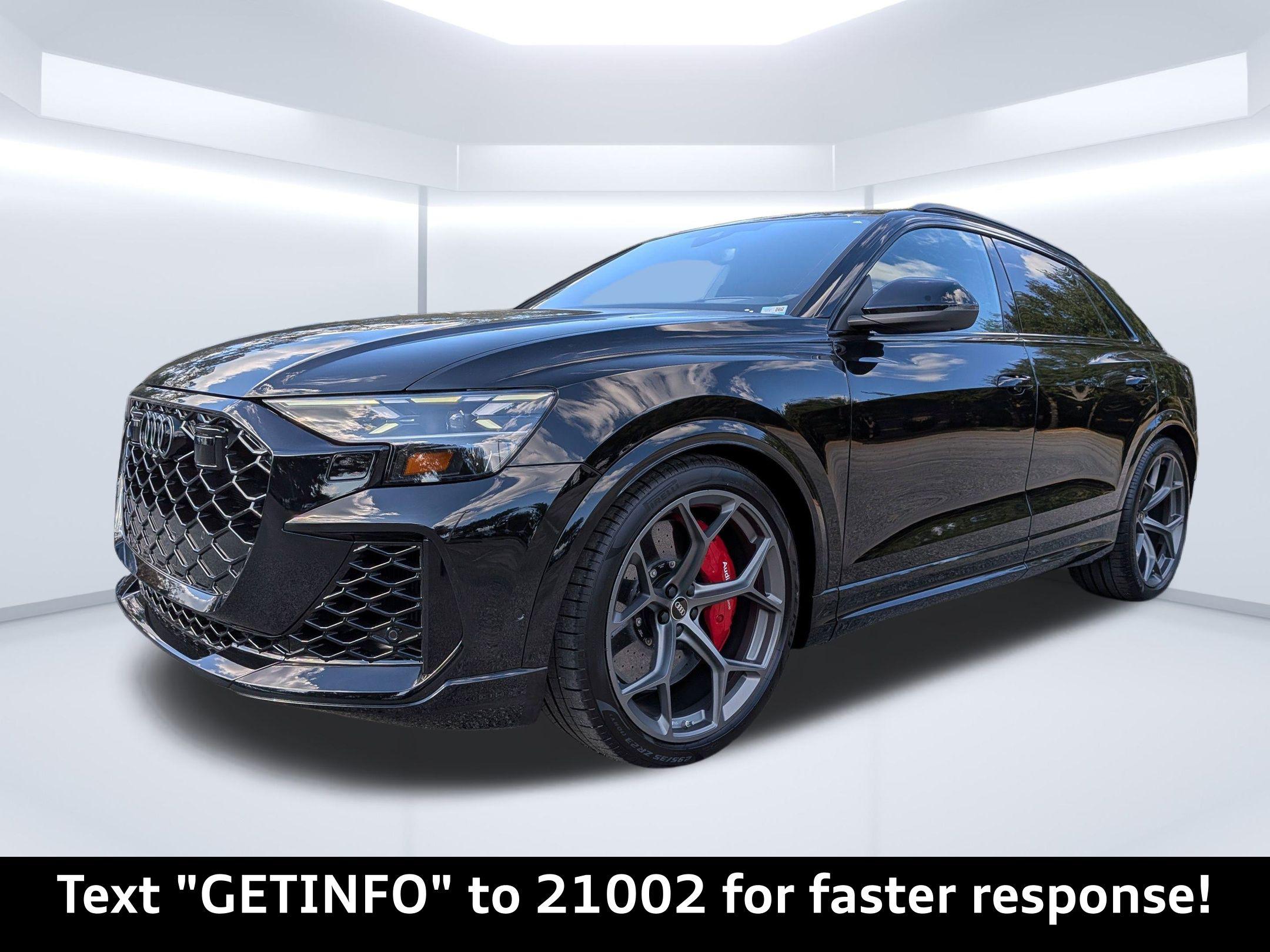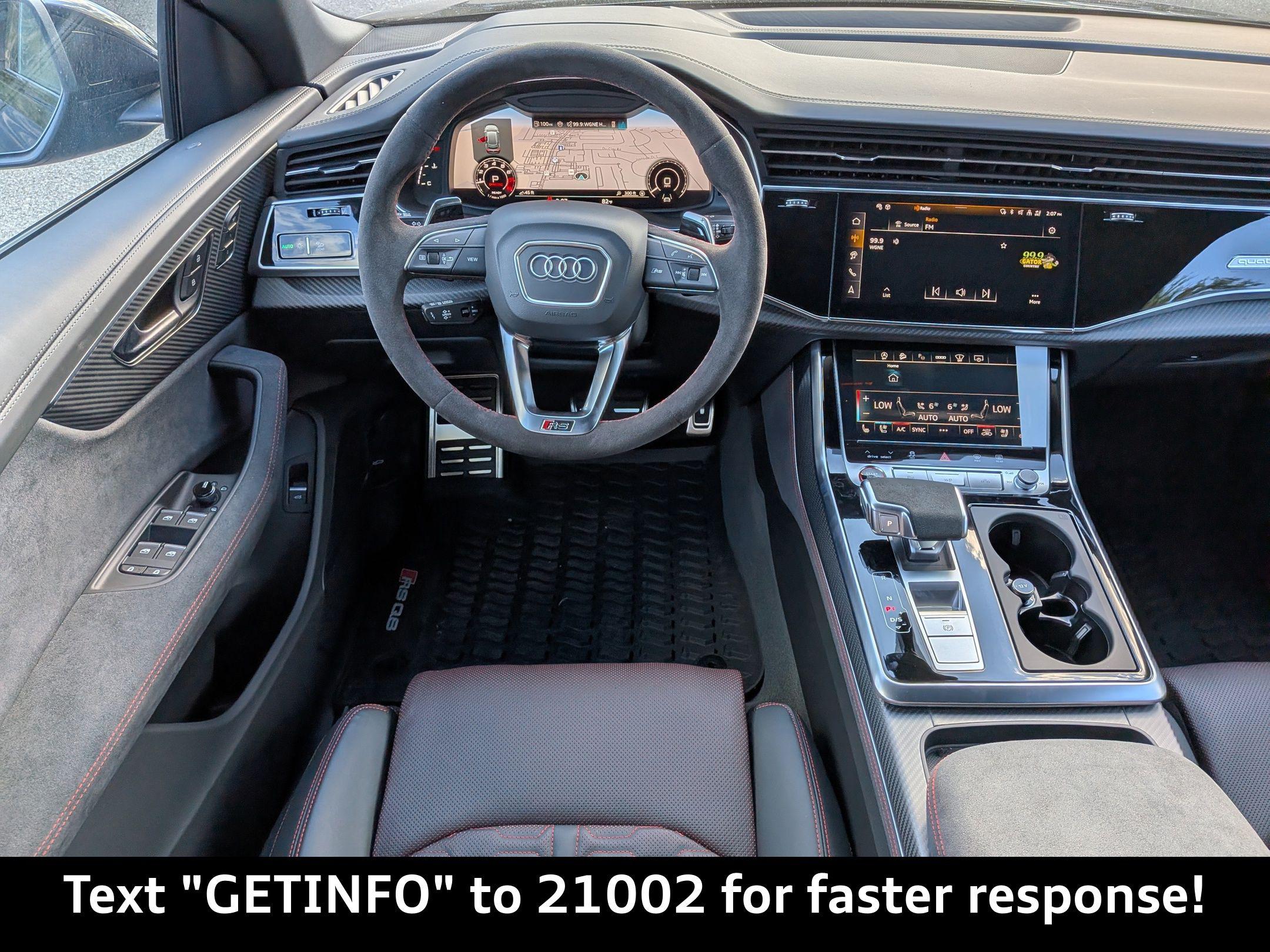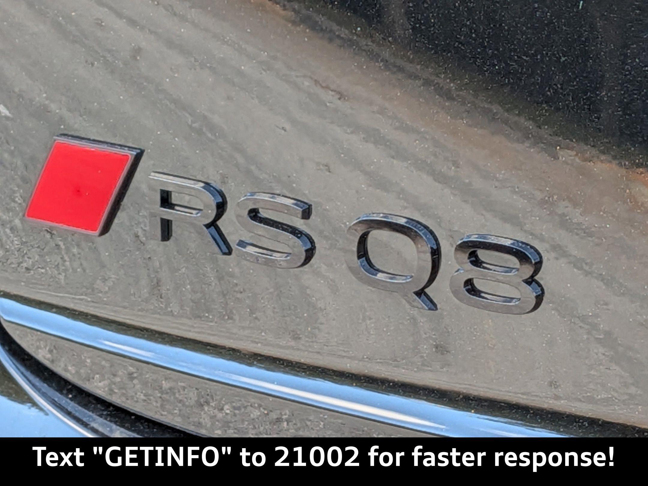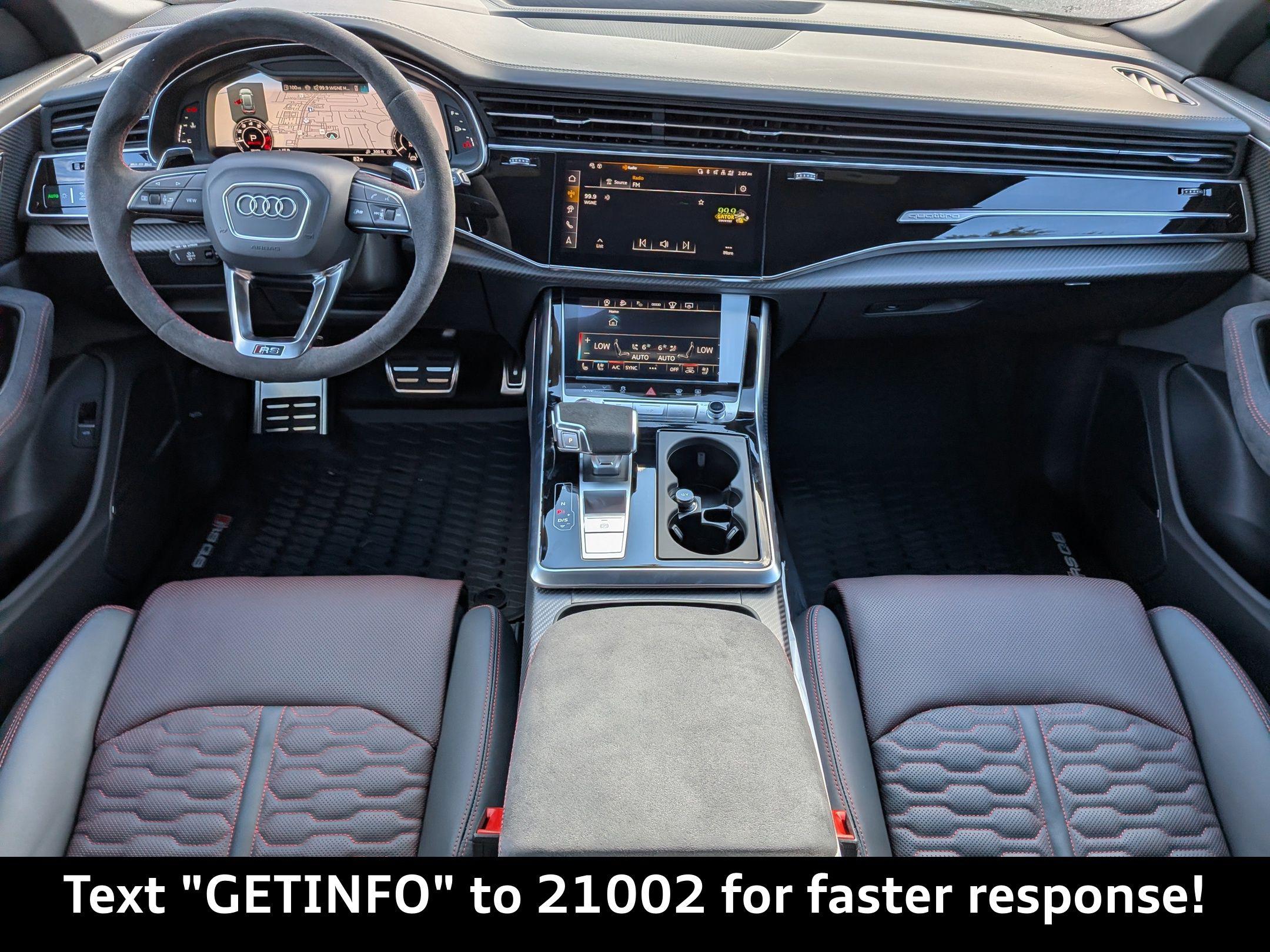 Mythos Black Metallic 2025 Audi RS Q8 performance performance quattro quattro 8-Speed Automatic with Tiptronic 4.0L V8 Turbocharged DOHC 32V LEV3-ULEV125 631hp Passed Rigorous Safety Inspection Performed by Certified Technician, Meticulously Detailed Inside and Out, CLEAN CARFAX, 17 Speakers, 21"" Alloy wheels, 4-Wheel Disc Brakes, ABS brakes, Adaptive suspension, Air Conditioning, AM/FM radio: SiriusXM w/360L, Auto High-beam Headlights, Auto-dimming door mirrors, Auto-dimming Rear-View mirror, Auto-leveling suspension, Automatic temperature control, Bang & Olufsen Premium Sound System with 3D Sound, Brake assist, Bumpers: body-color, Ceramic disc brakes: front and rear, Compass, Delay-off headlights, Driver door bin, Driver vanity mirror, Dual front impact airbags, Dual front side impact airbags, Electronic Stability Control, Emergency communication system: Audi connect CARE, Exterior Parking Camera Rear, Four wheel independent suspension, Front anti-roll bar, Front Bucket Seats, Front Center Armrest, Front dual zone A/C, Front fog lights, Front reading lights, Fully automatic headlights, Garage door transmitter: HomeLink, Headlight cleaning, Heated and Ventilated Sports Seats Plus, Heated door mirrors, Heated front seats, Heated steering wheel, Illuminated entry, Leather Shift Knob, Leather steering wheel, Low tire pressure warning, Memory seat, Navigation system: Audi MMI Navigation plus with Touch Response, Occupant sensing airbag, Outside temperature display, Overhead airbag, Overhead console, Panic alarm, Passenger door bin, Passenger vanity mirror, Power door mirrors, Power driver seat, Power Liftgate, Power moonroof: Panoramic, Power passenger seat, Power steering, Power windows, Radio data system, Radio: MMI Navigation Plus, Rain sensing wipers, Rear air conditioning, Rear anti-roll bar, Rear dual zone A/C, Rear fog lights, Rear reading lights, Rear seat center armrest, Rear side impact airbag, Rear Window Blind, Rear window defroster, Rear window wiper, Remote keyless entry, Security system, Speed control, Speed-sensing steering, Split folding rear seat, Spoiler, Steering wheel memory, Steering wheel mounted audio controls, Tachometer, Telescoping steering wheel, Tilt steering wheel, Traction control, Trip computer, Turn signal indicator mirrors, Valcona Leather Seating Surfaces, Variably intermittent wipers, Ventilated front seats, Wheels: 22"" 10-Spoke-Star Design.