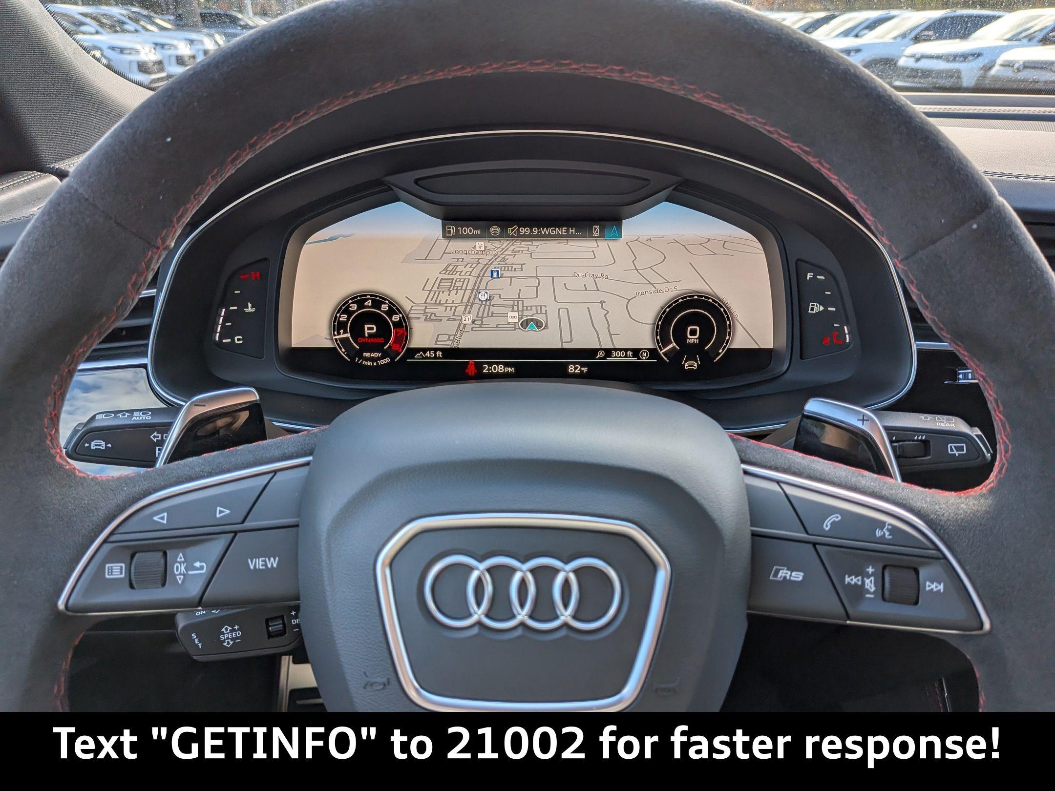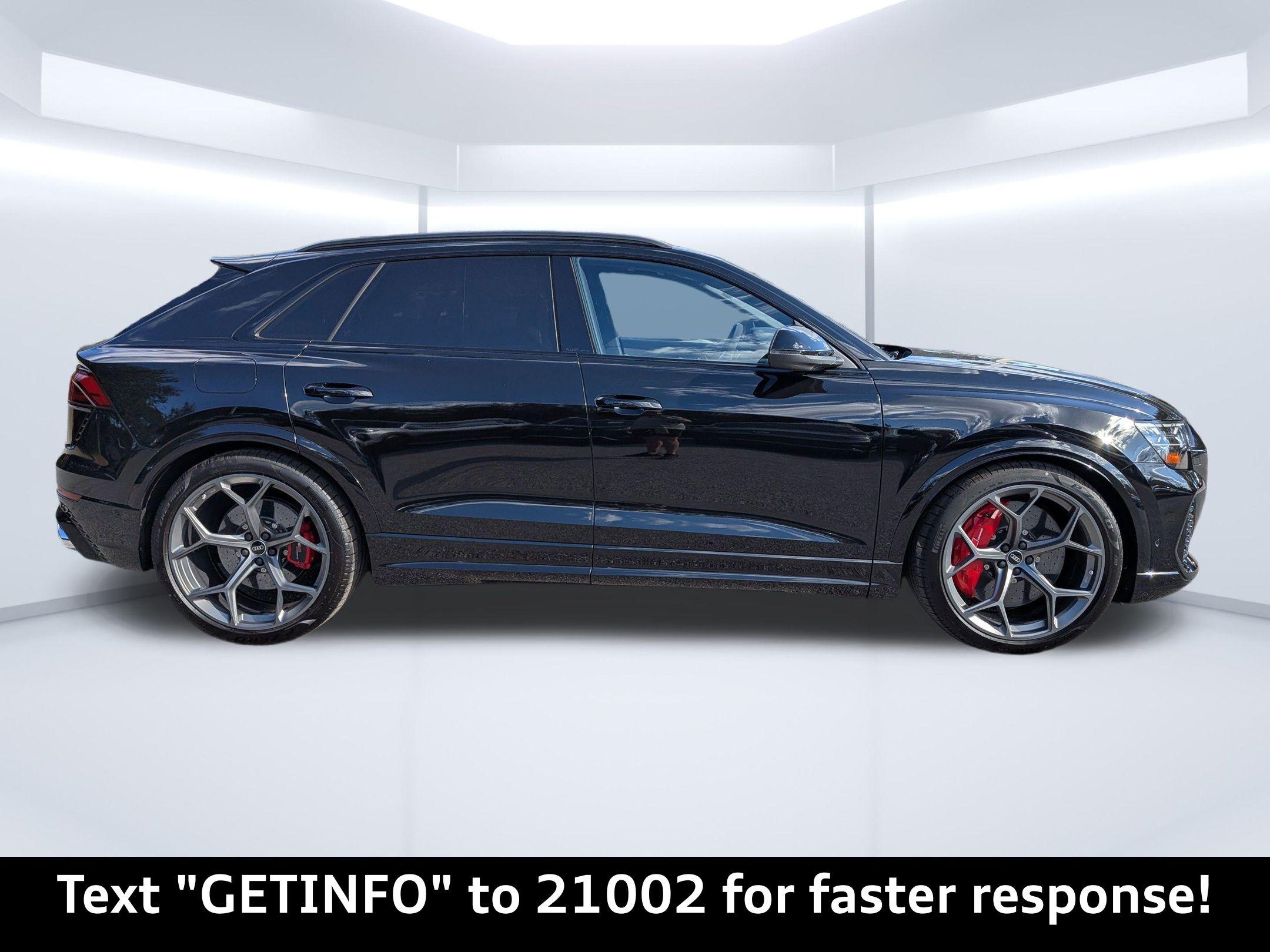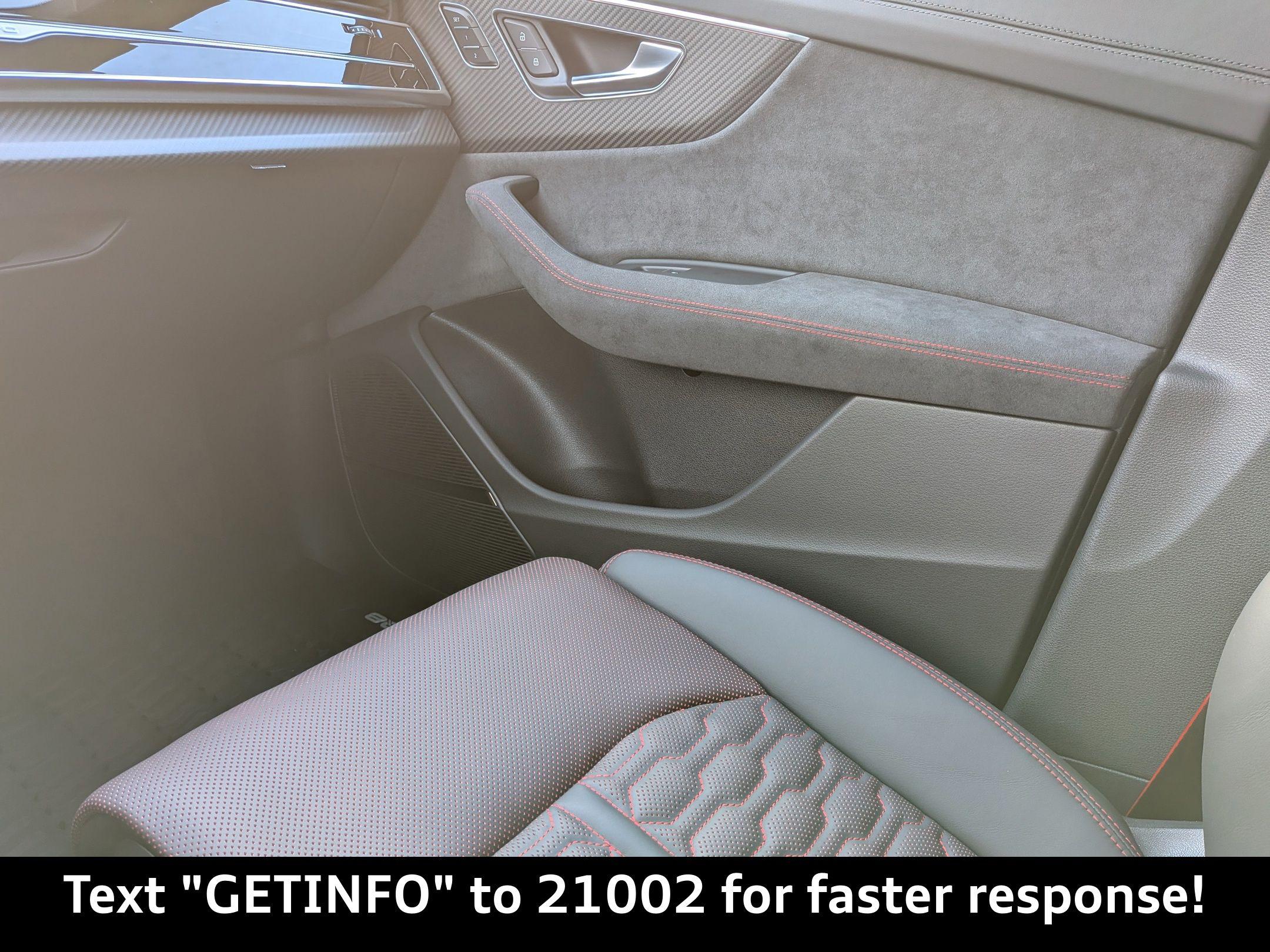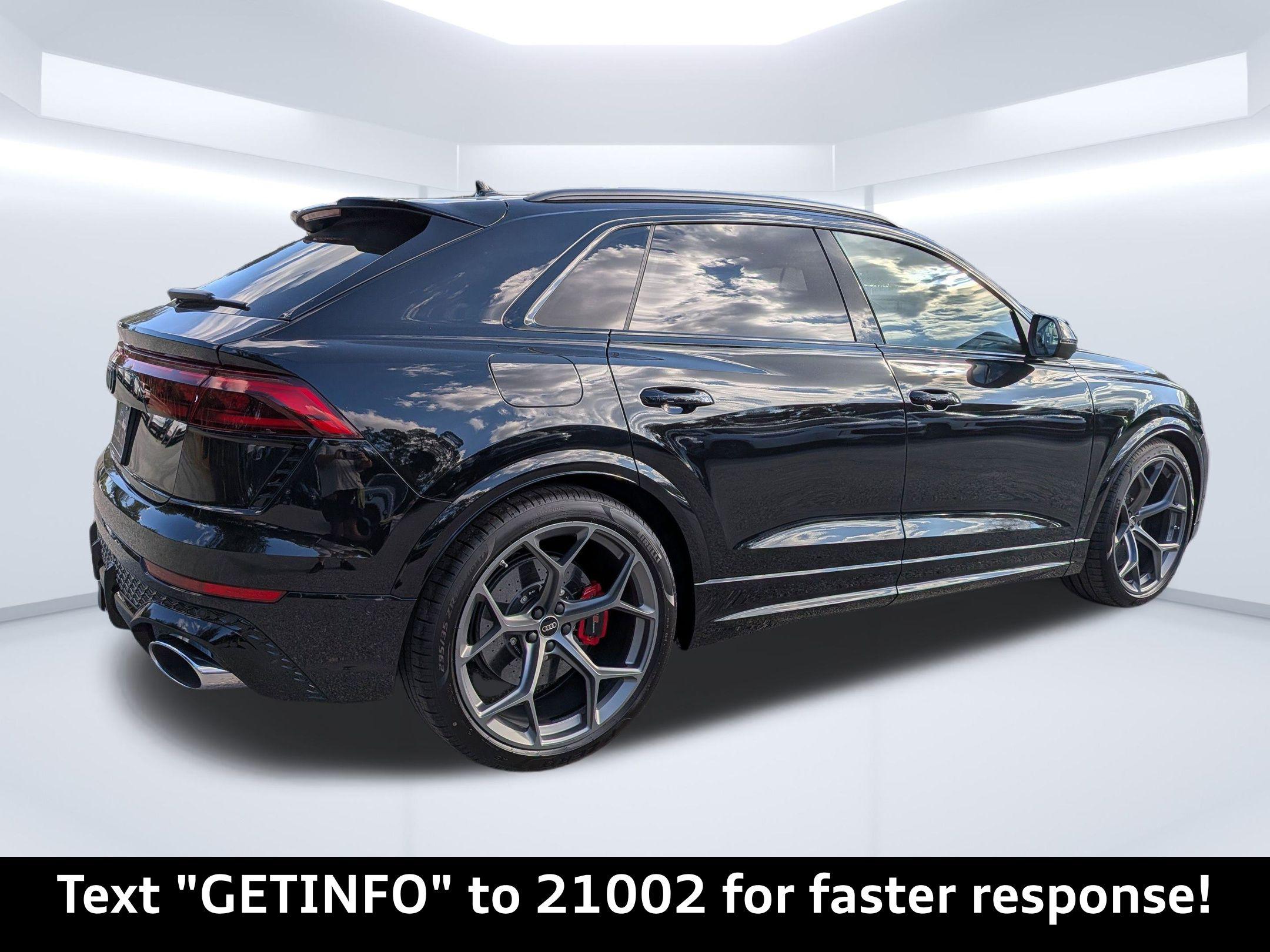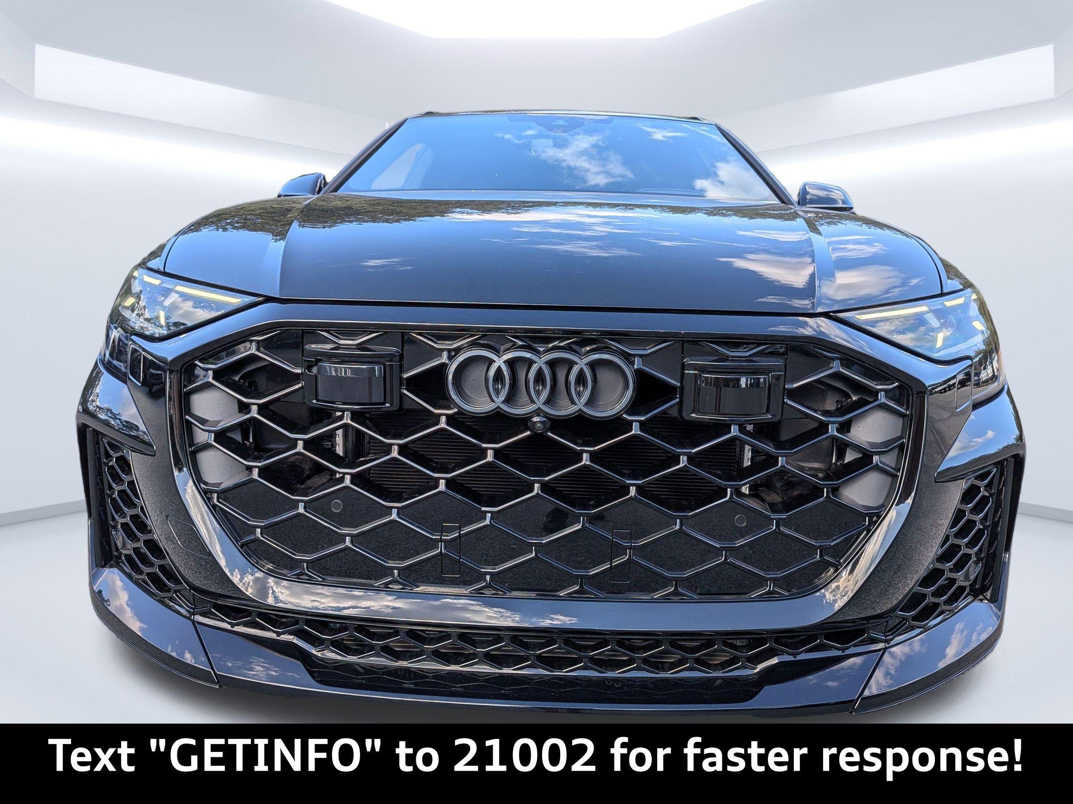 Mythos Black Metallic 2025 Audi RS Q8 performance performance quattro quattro 8-Speed Automatic with Tiptronic 4.0L V8 Turbocharged DOHC 32V LEV3-ULEV125 631hp Passed Rigorous Safety Inspection Performed by Certified Technician, Meticulously Detailed Inside and Out, CLEAN CARFAX, 17 Speakers, 21"" Alloy wheels, 4-Wheel Disc Brakes, ABS brakes, Adaptive suspension, Air Conditioning, AM/FM radio: SiriusXM w/360L, Auto High-beam Headlights, Auto-dimming door mirrors, Auto-dimming Rear-View mirror, Auto-leveling suspension, Automatic temperature control, Bang & Olufsen Premium Sound System with 3D Sound, Brake assist, Bumpers: body-color, Ceramic disc brakes: front and rear, Compass, Delay-off headlights, Driver door bin, Driver vanity mirror, Dual front impact airbags, Dual front side impact airbags, Electronic Stability Control, Emergency communication system: Audi connect CARE, Exterior Parking Camera Rear, Four wheel independent suspension, Front anti-roll bar, Front Bucket Seats, Front Center Armrest, Front dual zone A/C, Front fog lights, Front reading lights, Fully automatic headlights, Garage door transmitter: HomeLink, Headlight cleaning, Heated and Ventilated Sports Seats Plus, Heated door mirrors, Heated front seats, Heated steering wheel, Illuminated entry, Leather Shift Knob, Leather steering wheel, Low tire pressure warning, Memory seat, Navigation system: Audi MMI Navigation plus with Touch Response, Occupant sensing airbag, Outside temperature display, Overhead airbag, Overhead console, Panic alarm, Passenger door bin, Passenger vanity mirror, Power door mirrors, Power driver seat, Power Liftgate, Power moonroof: Panoramic, Power passenger seat, Power steering, Power windows, Radio data system, Radio: MMI Navigation Plus, Rain sensing wipers, Rear air conditioning, Rear anti-roll bar, Rear dual zone A/C, Rear fog lights, Rear reading lights, Rear seat center armrest, Rear side impact airbag, Rear Window Blind, Rear window defroster, Rear window wiper, Remote keyless entry, Security system, Speed control, Speed-sensing steering, Split folding rear seat, Spoiler, Steering wheel memory, Steering wheel mounted audio controls, Tachometer, Telescoping steering wheel, Tilt steering wheel, Traction control, Trip computer, Turn signal indicator mirrors, Valcona Leather Seating Surfaces, Variably intermittent wipers, Ventilated front seats, Wheels: 22"" 10-Spoke-Star Design.