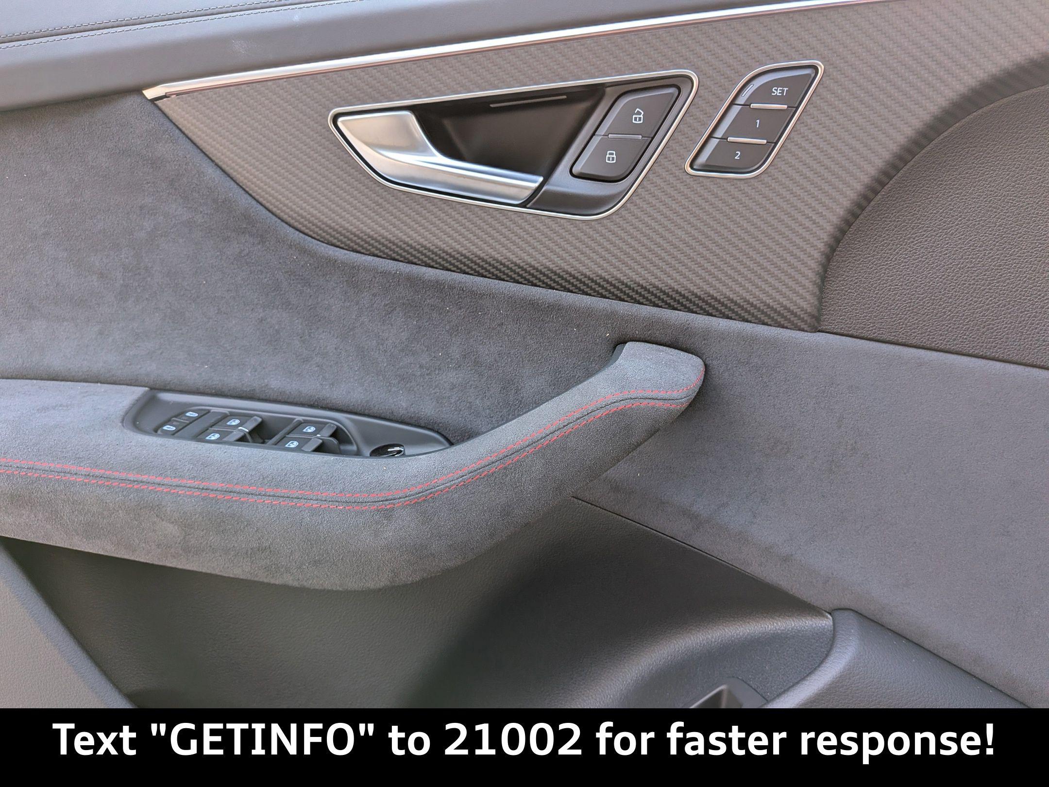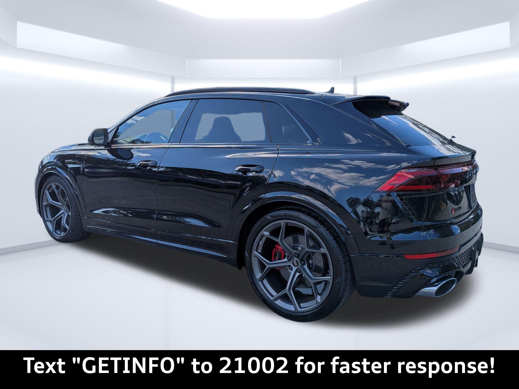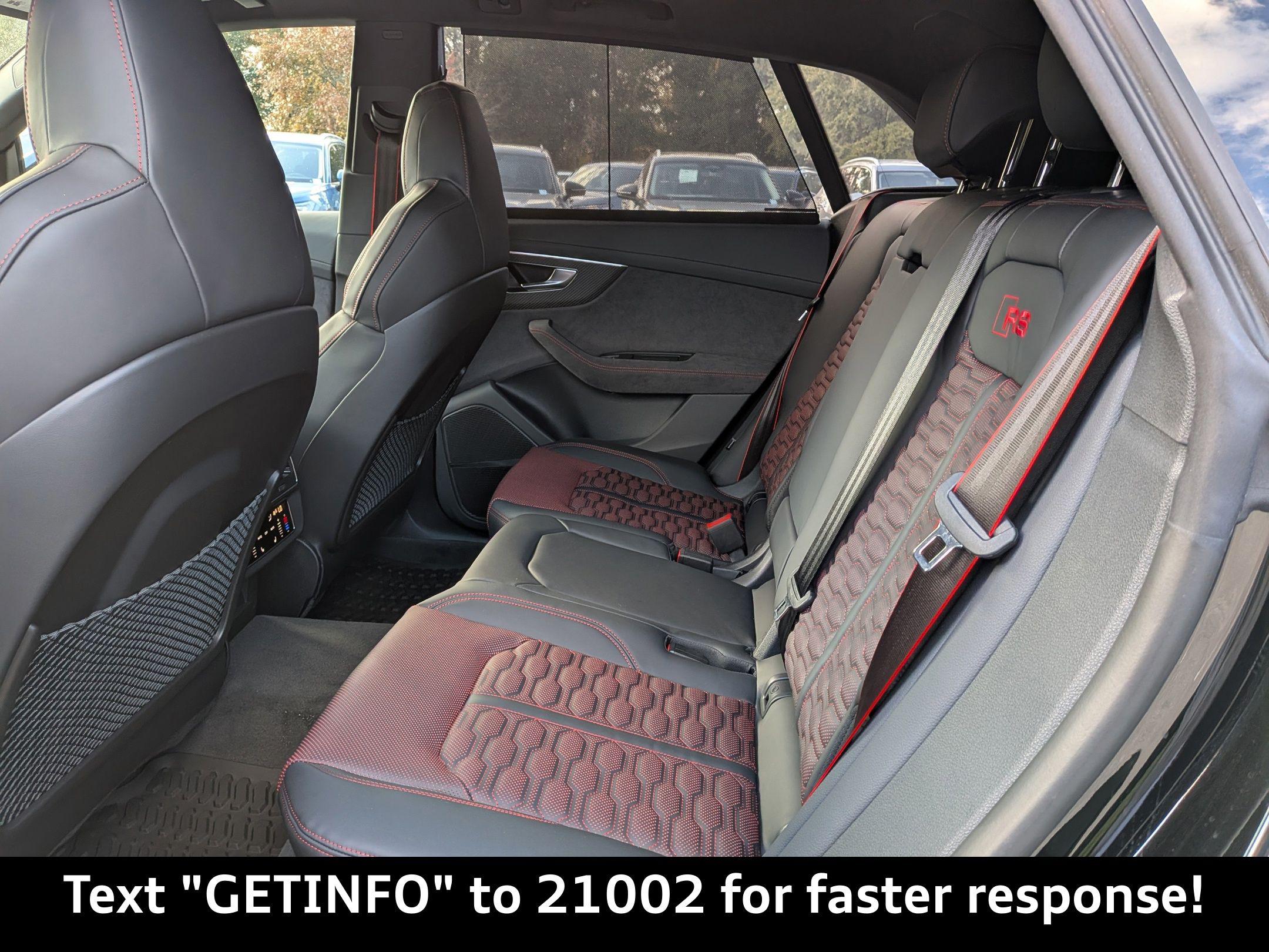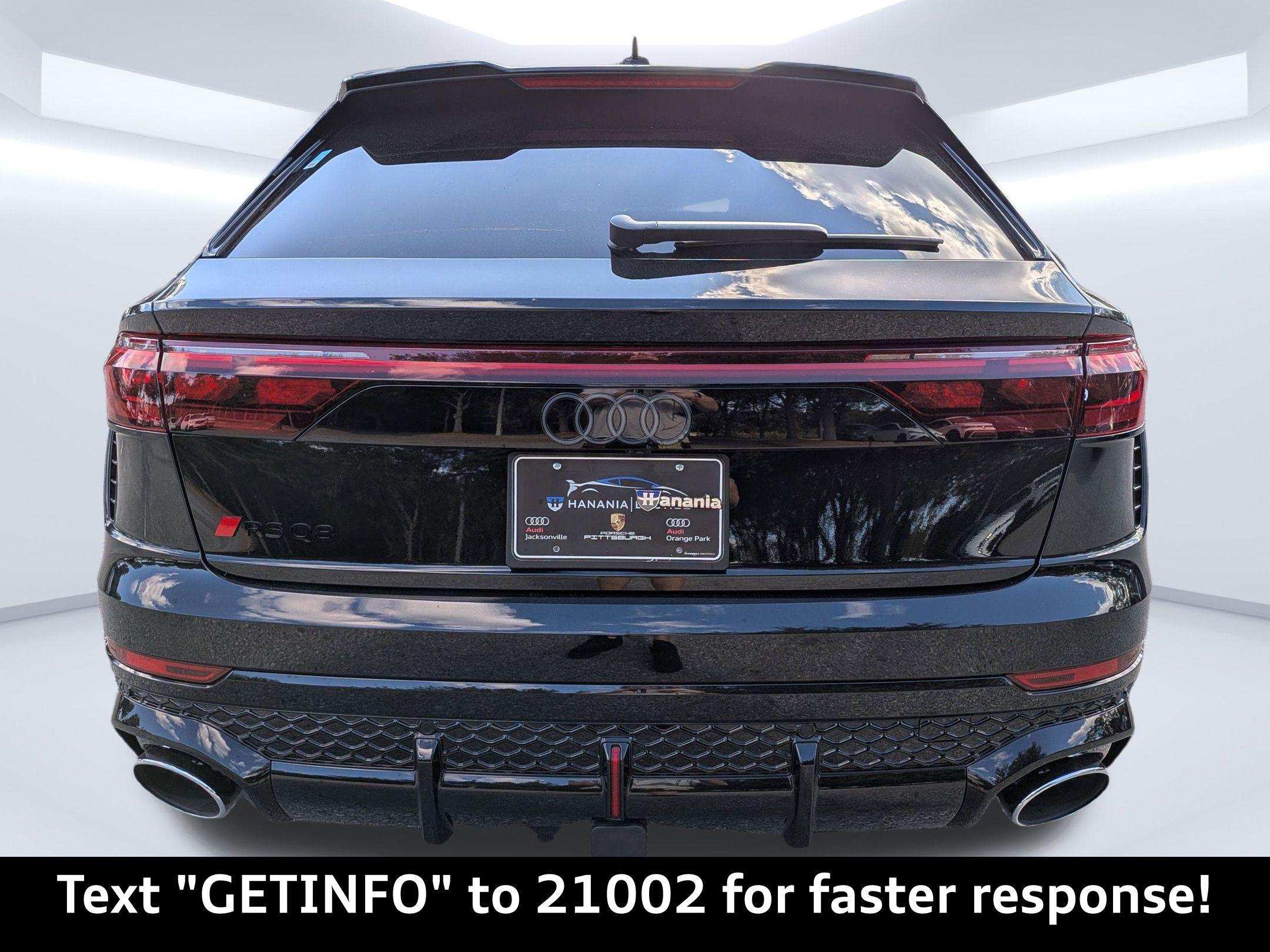 Mythos Black Metallic 2025 Audi RS Q8 performance performance quattro quattro 8-Speed Automatic with Tiptronic 4.0L V8 Turbocharged DOHC 32V LEV3-ULEV125 631hp Passed Rigorous Safety Inspection Performed by Certified Technician, Meticulously Detailed Inside and Out, CLEAN CARFAX, 17 Speakers, 21"" Alloy wheels, 4-Wheel Disc Brakes, ABS brakes, Adaptive suspension, Air Conditioning, AM/FM radio: SiriusXM w/360L, Auto High-beam Headlights, Auto-dimming door mirrors, Auto-dimming Rear-View mirror, Auto-leveling suspension, Automatic temperature control, Bang & Olufsen Premium Sound System with 3D Sound, Brake assist, Bumpers: body-color, Ceramic disc brakes: front and rear, Compass, Delay-off headlights, Driver door bin, Driver vanity mirror, Dual front impact airbags, Dual front side impact airbags, Electronic Stability Control, Emergency communication system: Audi connect CARE, Exterior Parking Camera Rear, Four wheel independent suspension, Front anti-roll bar, Front Bucket Seats, Front Center Armrest, Front dual zone A/C, Front fog lights, Front reading lights, Fully automatic headlights, Garage door transmitter: HomeLink, Headlight cleaning, Heated and Ventilated Sports Seats Plus, Heated door mirrors, Heated front seats, Heated steering wheel, Illuminated entry, Leather Shift Knob, Leather steering wheel, Low tire pressure warning, Memory seat, Navigation system: Audi MMI Navigation plus with Touch Response, Occupant sensing airbag, Outside temperature display, Overhead airbag, Overhead console, Panic alarm, Passenger door bin, Passenger vanity mirror, Power door mirrors, Power driver seat, Power Liftgate, Power moonroof: Panoramic, Power passenger seat, Power steering, Power windows, Radio data system, Radio: MMI Navigation Plus, Rain sensing wipers, Rear air conditioning, Rear anti-roll bar, Rear dual zone A/C, Rear fog lights, Rear reading lights, Rear seat center armrest, Rear side impact airbag, Rear Window Blind, Rear window defroster, Rear window wiper, Remote keyless entry, Security system, Speed control, Speed-sensing steering, Split folding rear seat, Spoiler, Steering wheel memory, Steering wheel mounted audio controls, Tachometer, Telescoping steering wheel, Tilt steering wheel, Traction control, Trip computer, Turn signal indicator mirrors, Valcona Leather Seating Surfaces, Variably intermittent wipers, Ventilated front seats, Wheels: 22"" 10-Spoke-Star Design.