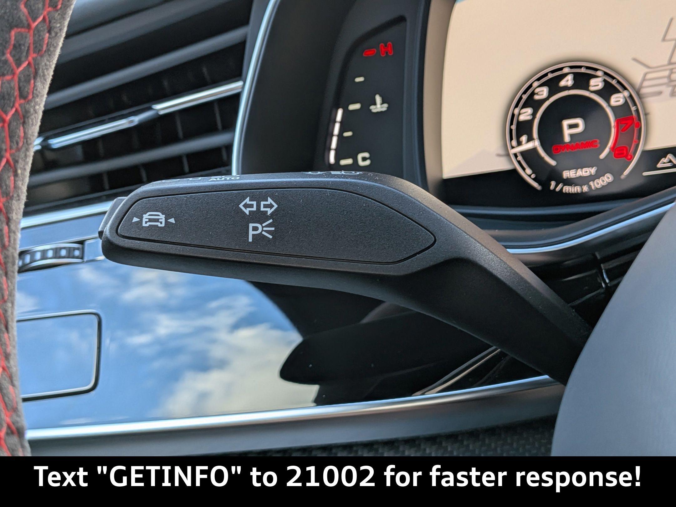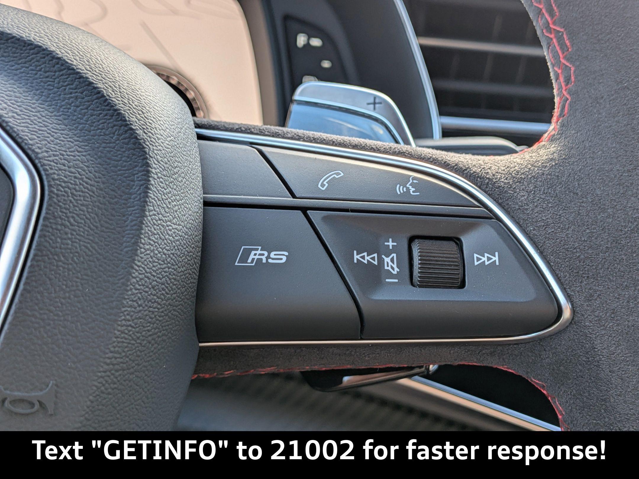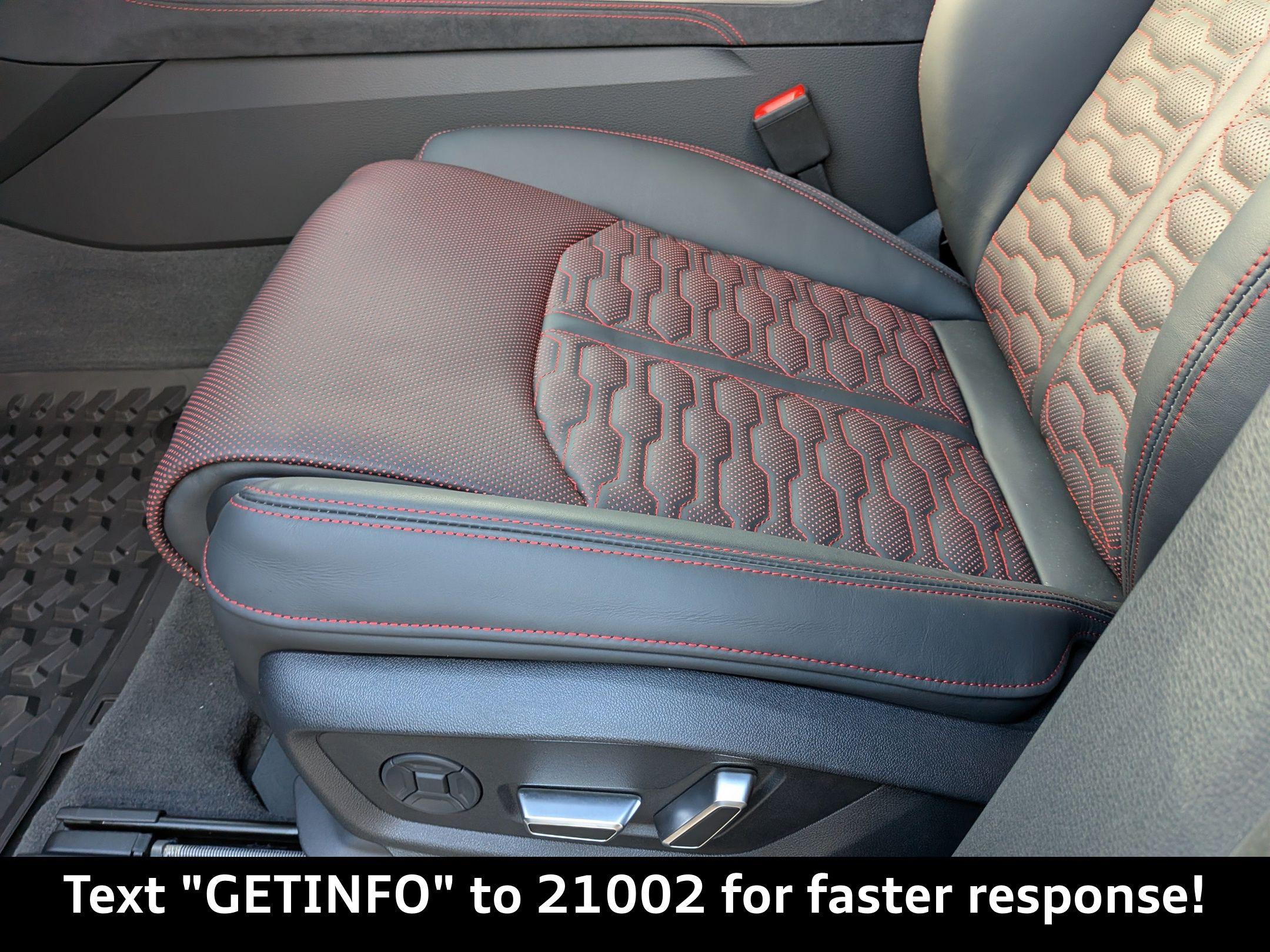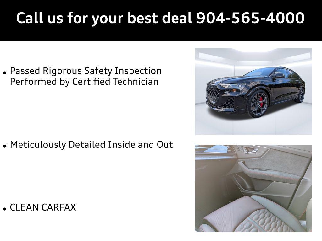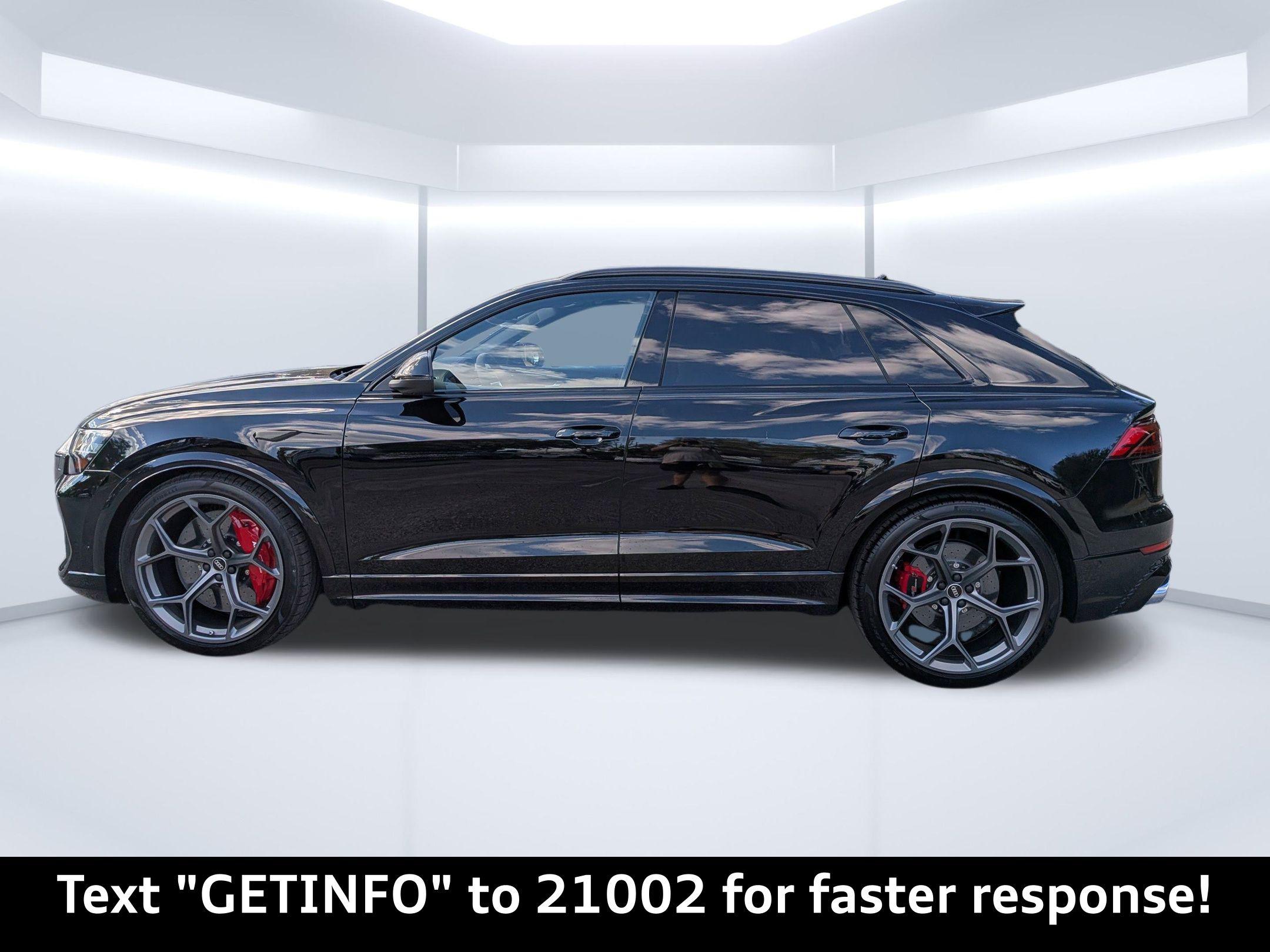 Mythos Black Metallic 2025 Audi RS Q8 performance performance quattro quattro 8-Speed Automatic with Tiptronic 4.0L V8 Turbocharged DOHC 32V LEV3-ULEV125 631hp Passed Rigorous Safety Inspection Performed by Certified Technician, Meticulously Detailed Inside and Out, CLEAN CARFAX, 17 Speakers, 21"" Alloy wheels, 4-Wheel Disc Brakes, ABS brakes, Adaptive suspension, Air Conditioning, AM/FM radio: SiriusXM w/360L, Auto High-beam Headlights, Auto-dimming door mirrors, Auto-dimming Rear-View mirror, Auto-leveling suspension, Automatic temperature control, Bang & Olufsen Premium Sound System with 3D Sound, Brake assist, Bumpers: body-color, Ceramic disc brakes: front and rear, Compass, Delay-off headlights, Driver door bin, Driver vanity mirror, Dual front impact airbags, Dual front side impact airbags, Electronic Stability Control, Emergency communication system: Audi connect CARE, Exterior Parking Camera Rear, Four wheel independent suspension, Front anti-roll bar, Front Bucket Seats, Front Center Armrest, Front dual zone A/C, Front fog lights, Front reading lights, Fully automatic headlights, Garage door transmitter: HomeLink, Headlight cleaning, Heated and Ventilated Sports Seats Plus, Heated door mirrors, Heated front seats, Heated steering wheel, Illuminated entry, Leather Shift Knob, Leather steering wheel, Low tire pressure warning, Memory seat, Navigation system: Audi MMI Navigation plus with Touch Response, Occupant sensing airbag, Outside temperature display, Overhead airbag, Overhead console, Panic alarm, Passenger door bin, Passenger vanity mirror, Power door mirrors, Power driver seat, Power Liftgate, Power moonroof: Panoramic, Power passenger seat, Power steering, Power windows, Radio data system, Radio: MMI Navigation Plus, Rain sensing wipers, Rear air conditioning, Rear anti-roll bar, Rear dual zone A/C, Rear fog lights, Rear reading lights, Rear seat center armrest, Rear side impact airbag, Rear Window Blind, Rear window defroster, Rear window wiper, Remote keyless entry, Security system, Speed control, Speed-sensing steering, Split folding rear seat, Spoiler, Steering wheel memory, Steering wheel mounted audio controls, Tachometer, Telescoping steering wheel, Tilt steering wheel, Traction control, Trip computer, Turn signal indicator mirrors, Valcona Leather Seating Surfaces, Variably intermittent wipers, Ventilated front seats, Wheels: 22"" 10-Spoke-Star Design.