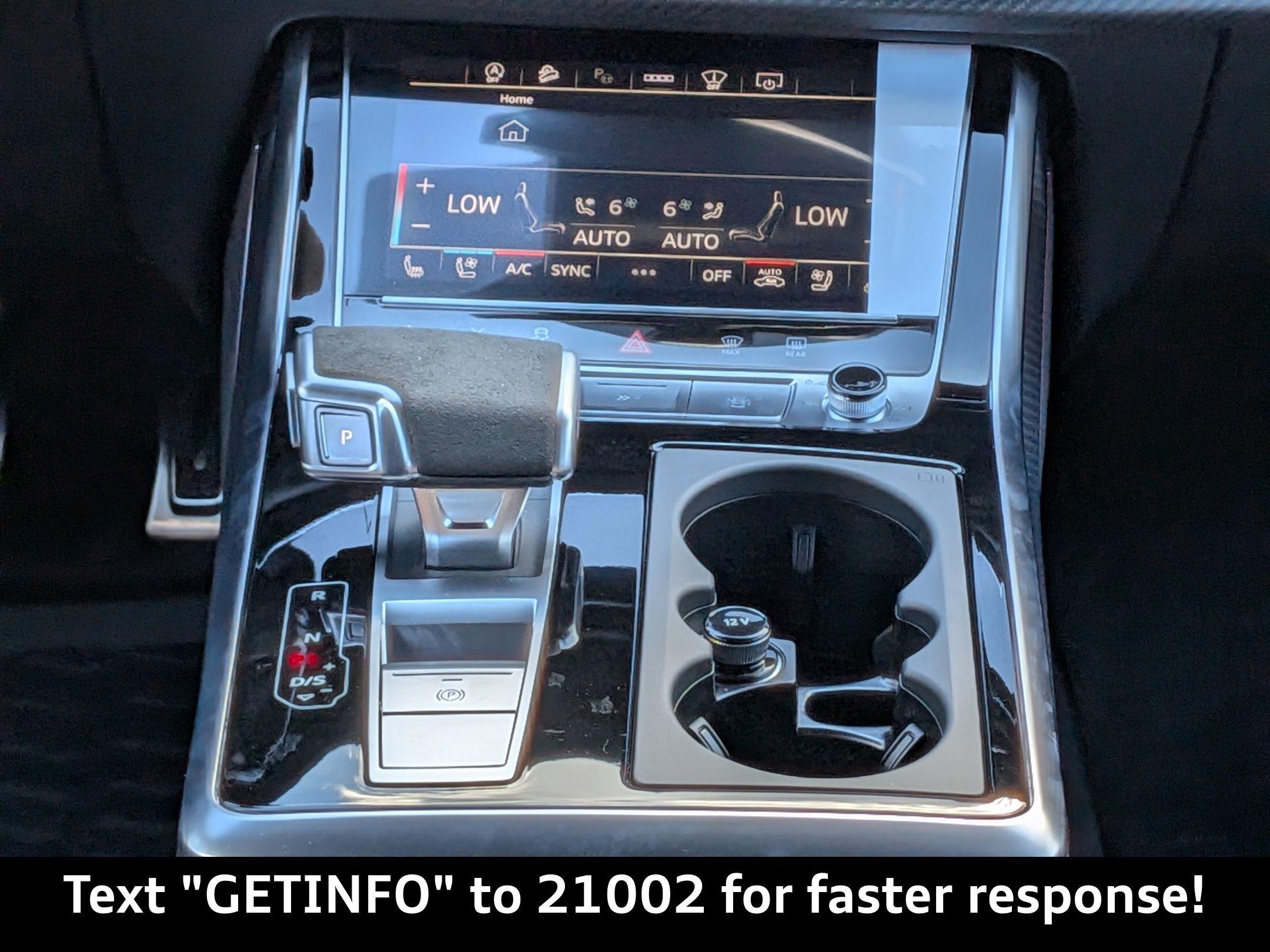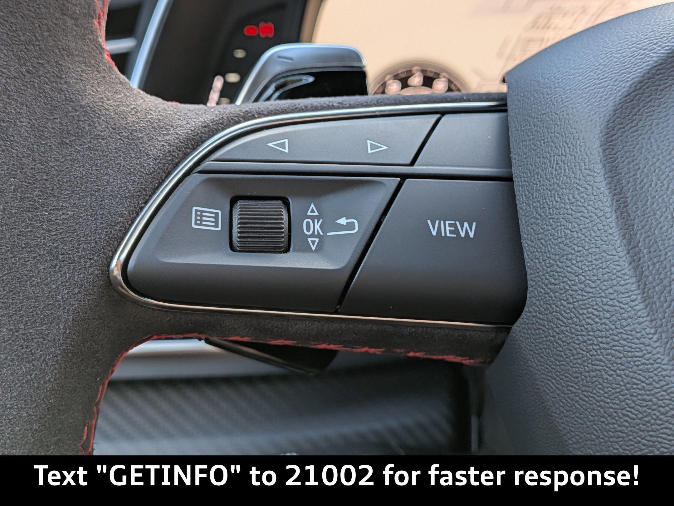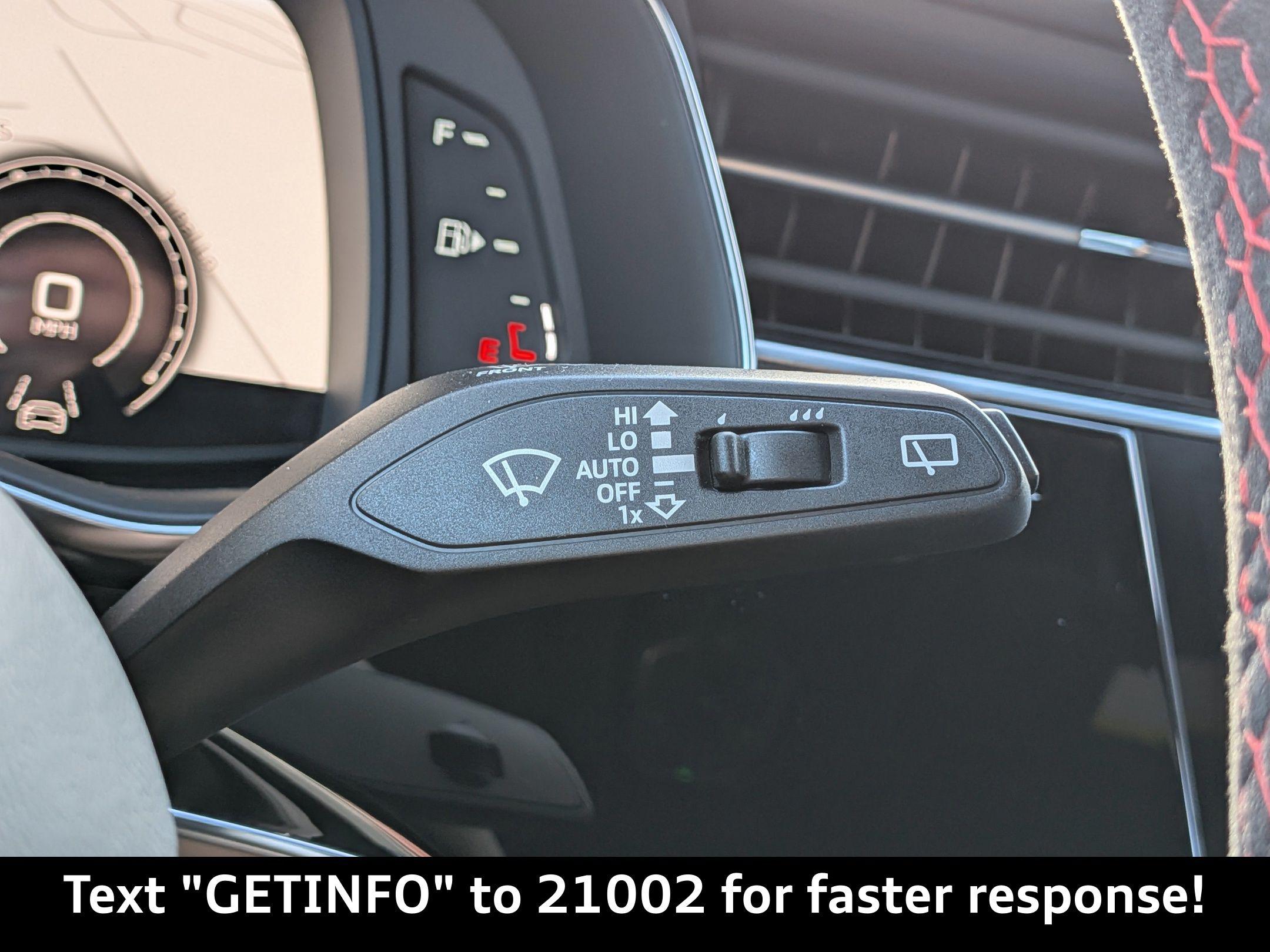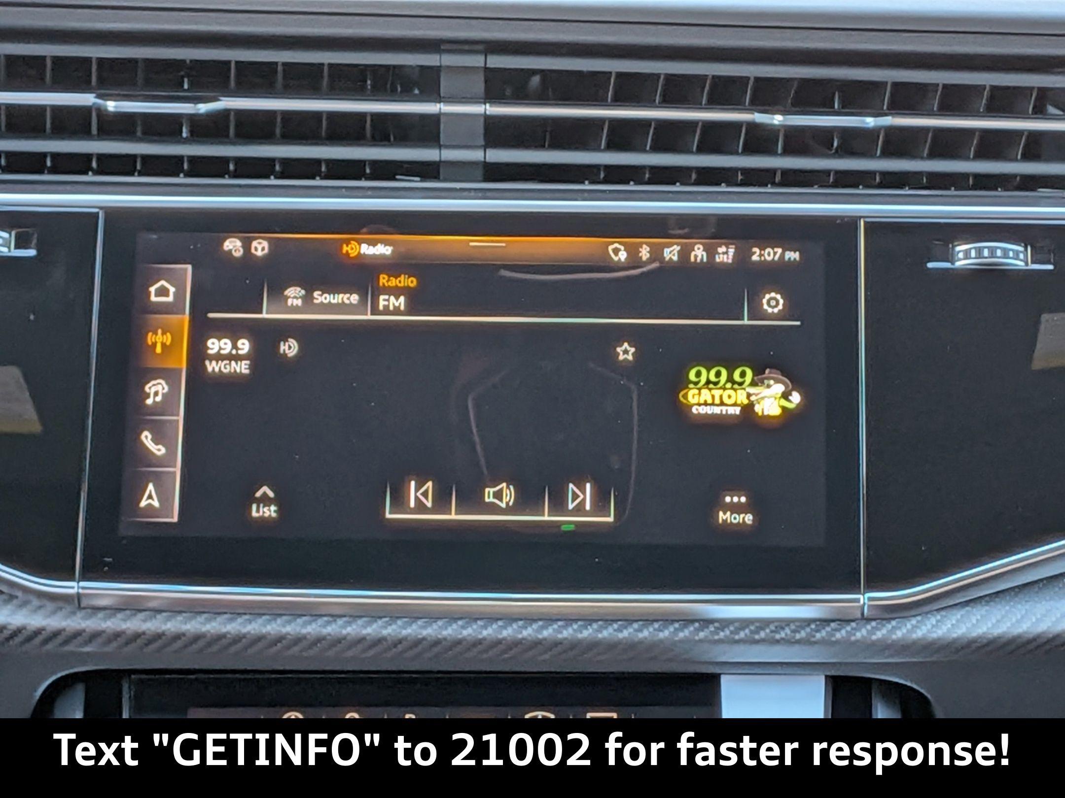 Mythos Black Metallic 2025 Audi RS Q8 performance performance quattro quattro 8-Speed Automatic with Tiptronic 4.0L V8 Turbocharged DOHC 32V LEV3-ULEV125 631hp Passed Rigorous Safety Inspection Performed by Certified Technician, Meticulously Detailed Inside and Out, CLEAN CARFAX, 17 Speakers, 21"" Alloy wheels, 4-Wheel Disc Brakes, ABS brakes, Adaptive suspension, Air Conditioning, AM/FM radio: SiriusXM w/360L, Auto High-beam Headlights, Auto-dimming door mirrors, Auto-dimming Rear-View mirror, Auto-leveling suspension, Automatic temperature control, Bang & Olufsen Premium Sound System with 3D Sound, Brake assist, Bumpers: body-color, Ceramic disc brakes: front and rear, Compass, Delay-off headlights, Driver door bin, Driver vanity mirror, Dual front impact airbags, Dual front side impact airbags, Electronic Stability Control, Emergency communication system: Audi connect CARE, Exterior Parking Camera Rear, Four wheel independent suspension, Front anti-roll bar, Front Bucket Seats, Front Center Armrest, Front dual zone A/C, Front fog lights, Front reading lights, Fully automatic headlights, Garage door transmitter: HomeLink, Headlight cleaning, Heated and Ventilated Sports Seats Plus, Heated door mirrors, Heated front seats, Heated steering wheel, Illuminated entry, Leather Shift Knob, Leather steering wheel, Low tire pressure warning, Memory seat, Navigation system: Audi MMI Navigation plus with Touch Response, Occupant sensing airbag, Outside temperature display, Overhead airbag, Overhead console, Panic alarm, Passenger door bin, Passenger vanity mirror, Power door mirrors, Power driver seat, Power Liftgate, Power moonroof: Panoramic, Power passenger seat, Power steering, Power windows, Radio data system, Radio: MMI Navigation Plus, Rain sensing wipers, Rear air conditioning, Rear anti-roll bar, Rear dual zone A/C, Rear fog lights, Rear reading lights, Rear seat center armrest, Rear side impact airbag, Rear Window Blind, Rear window defroster, Rear window wiper, Remote keyless entry, Security system, Speed control, Speed-sensing steering, Split folding rear seat, Spoiler, Steering wheel memory, Steering wheel mounted audio controls, Tachometer, Telescoping steering wheel, Tilt steering wheel, Traction control, Trip computer, Turn signal indicator mirrors, Valcona Leather Seating Surfaces, Variably intermittent wipers, Ventilated front seats, Wheels: 22"" 10-Spoke-Star Design.
