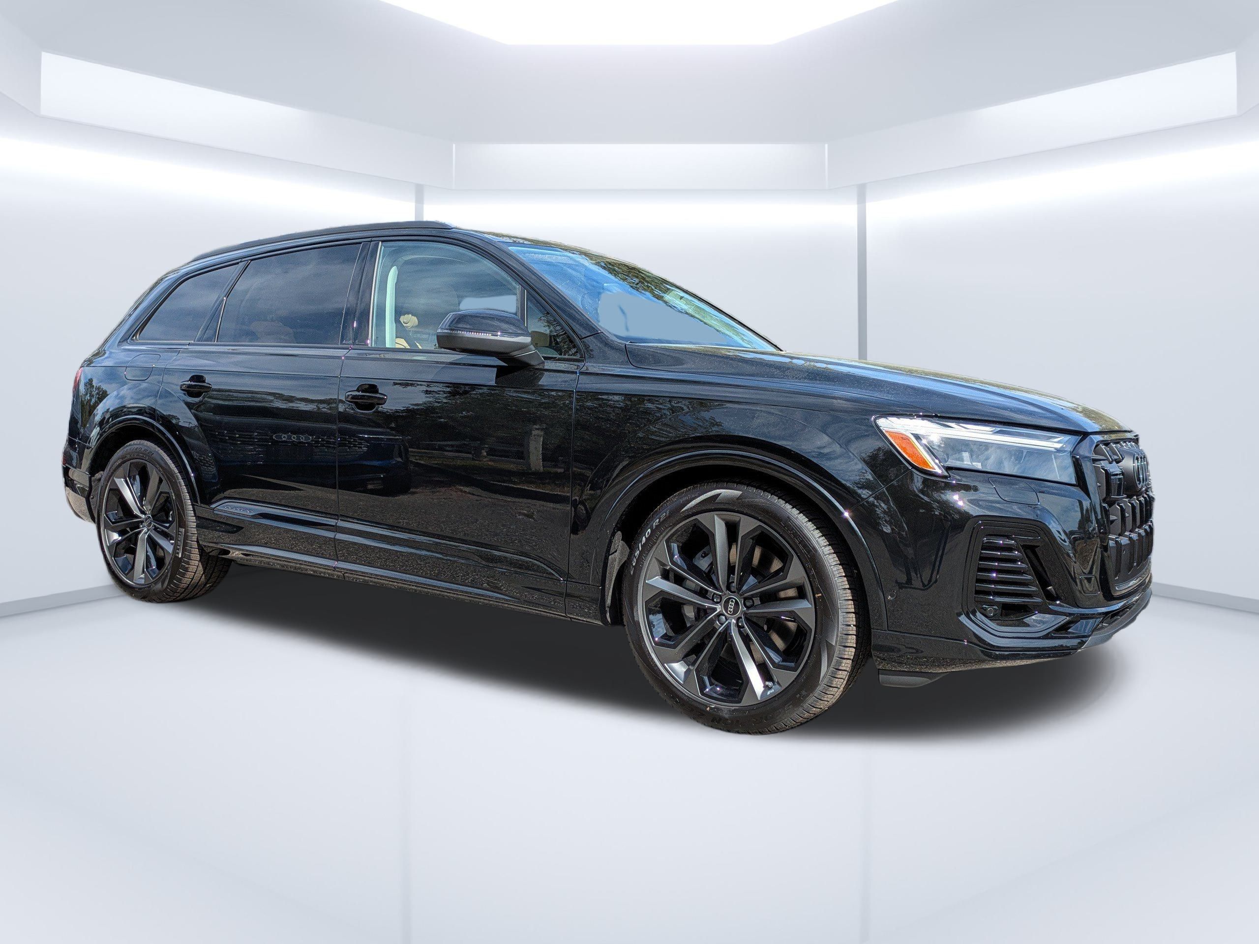 mythos black metallic 2026 Audi Q7 Premium Plus quattro quattro 8-Speed Automatic with Tiptronic 3.0L TFSI Passed Rigorous Safety Inspection Performed by Certified Technician, Meticulously Detailed Inside and Out, CLEAN CARFAX, 10 Speakers, 21"" Alloy wheels, 3rd row seats: bench, 4-Wheel Disc Brakes, ABS brakes, Air Conditioning, AM/FM radio, Auto High-beam Headlights, Auto-dimming door mirrors, Auto-dimming Rear-View mirror, Automatic temperature control, Brake assist, Bumpers: body-color, Compass, Delay-off headlights, Driver door bin, Driver vanity mirror, Dual front impact airbags, Dual front side impact airbags, Electronic Stability Control, Emergency communication system: Audi connect CARE, Exterior Parking Camera Rear, Four wheel independent suspension, Front anti-roll bar, Front Bucket Seats, Front Center Armrest, Front dual zone A/C, Front fog lights, Front reading lights, Fully automatic headlights, Garage door transmitter: HomeLink, Genuine wood door panel insert, Heated door mirrors, Heated Front Bucket Seats, Heated front seats, Illuminated entry, Leather Seating Surfaces, Leather Shift Knob, Leather steering wheel, Low tire pressure warning, Memory seat, Navigation system: Audi MMI Navigation plus with Touch Response, Occupant sensing airbag, Outside temperature display, Overhead airbag, Overhead console, Panic alarm, Passenger door bin, Passenger vanity mirror, Power door mirrors, Power driver seat, Power Liftgate, Power moonroof: Panoramic, Power passenger seat, Power steering, Power windows, Radio data system, Radio: Audi Sound System, Rain sensing wipers, Rear air conditioning, Rear anti-roll bar, Rear fog lights, Rear reading lights, Rear seat center armrest, Rear side impact airbag, Rear window defroster, Rear window wiper, Reclining 3rd row seat, Remote keyless entry, Security system, Speed control, Speed-sensing steering, Split folding rear seat, Spoiler, Steering wheel memory, Steering wheel mounted audio controls, Tachometer, Telescoping steering wheel, Tilt steering wheel, Traction control, Trip computer, Turn signal indicator mirrors, Variably intermittent wipers, Wheels: 19"" 5-Arm-Star Design.Recent Arrival!