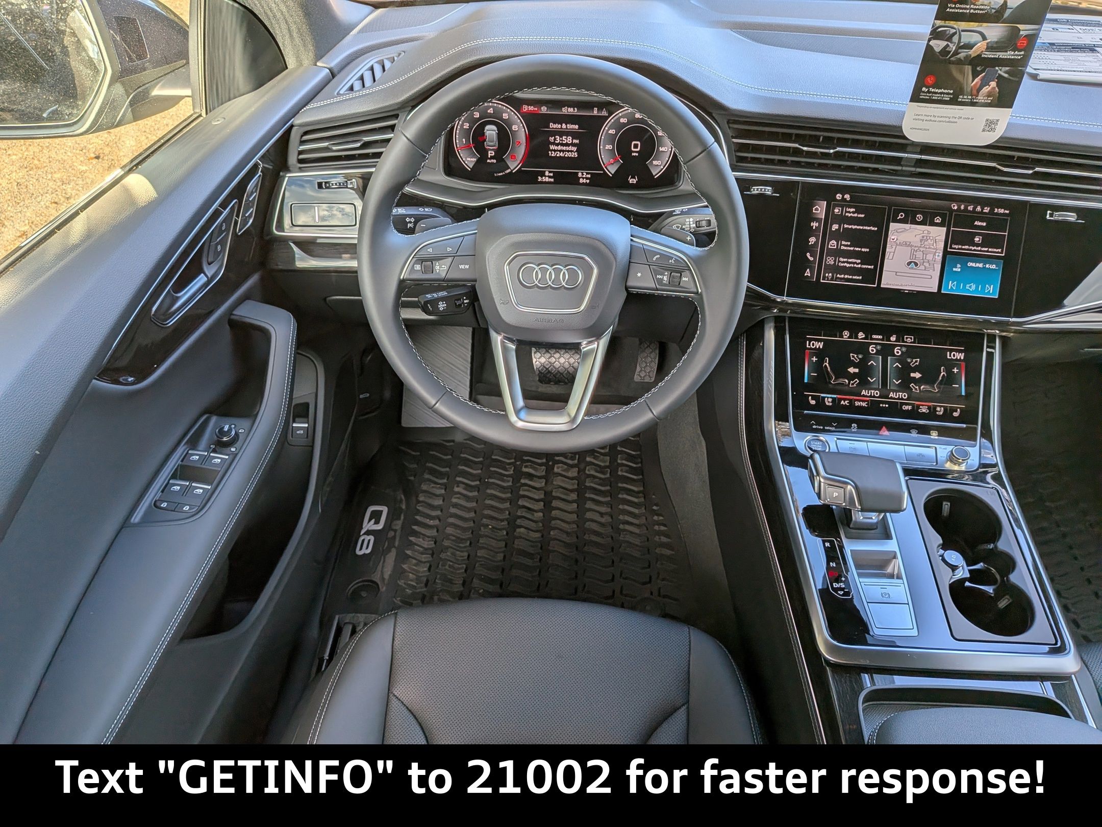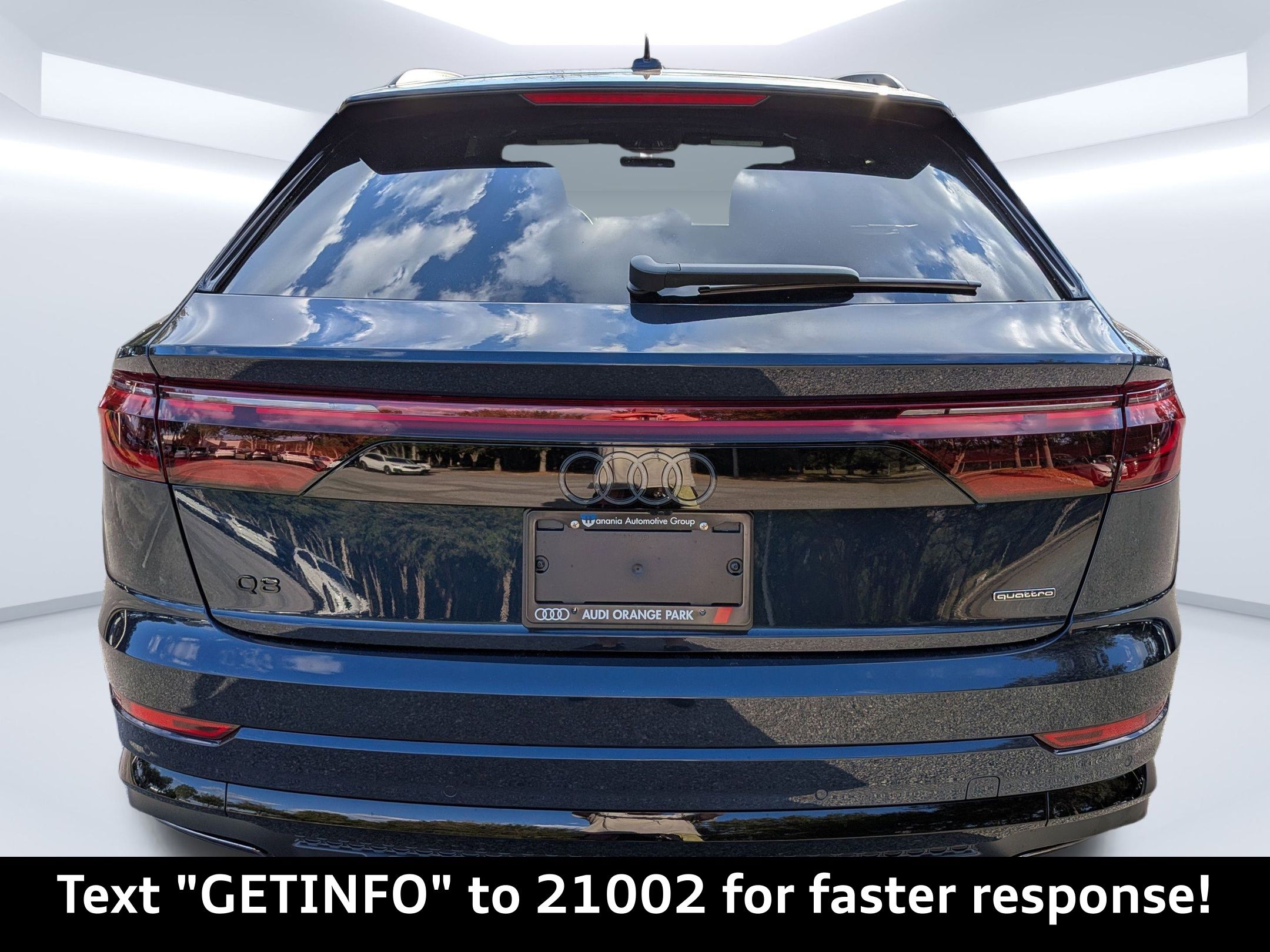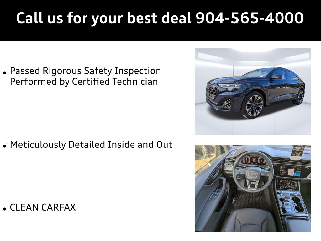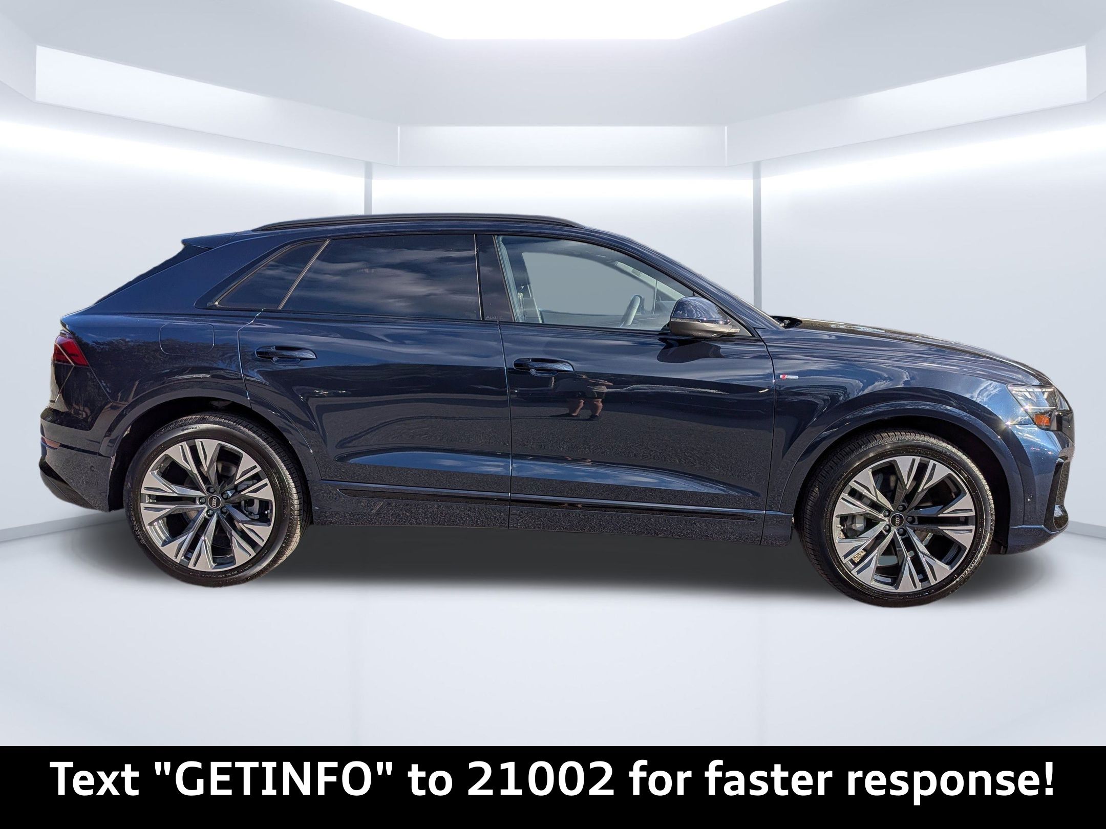 Waitomo Blue Metallic 2026 Audi Q8 Premium Plus quattro quattro 8-Speed Automatic with Tiptronic 3.0L TFSI Passed Rigorous Safety Inspection Performed by Certified Technician, Meticulously Detailed Inside and Out, CLEAN CARFAX, 10 Speakers, 21"" Alloy wheels, 4-Wheel Disc Brakes, ABS brakes, Adaptive suspension, Air Conditioning, AM/FM radio, Audi Sound System, Auto High-beam Headlights, Auto-dimming door mirrors, Auto-dimming Rear-View mirror, Automatic temperature control, Brake assist, Bumpers: body-color, Compass, Delay-off headlights, Driver door bin, Driver vanity mirror, Dual front impact airbags, Dual front side impact airbags, Electronic Stability Control, Emergency communication system: Audi connect CARE, Exterior Parking Camera Rear, Four wheel independent suspension, Front anti-roll bar, Front Bucket Seats, Front Center Armrest, Front dual zone A/C, Front fog lights, Front reading lights, Fully automatic headlights, Garage door transmitter: HomeLink, Genuine wood door panel insert, Heated door mirrors, Heated Front Bucket Seats, Heated front seats, Illuminated entry, Leather Seating Surfaces, Leather Shift Knob, Leather steering wheel, Low tire pressure warning, Memory seat, Navigation system: Audi MMI Navigation plus with Touch Response, Occupant sensing airbag, Outside temperature display, Overhead airbag, Overhead console, Panic alarm, Passenger door bin, Passenger vanity mirror, Power door mirrors, Power driver seat, Power Liftgate, Power moonroof: Panoramic, Power passenger seat, Power steering, Power windows, Radio data system, Radio: Audi MMI Navigation Plus with MMI Touch Response, Rain sensing wipers, Rear air conditioning, Rear anti-roll bar, Rear fog lights, Rear reading lights, Rear seat center armrest, Rear side impact airbag, Rear window defroster, Rear window wiper, Remote keyless entry, Security system, Speed control, Speed-sensing steering, Split folding rear seat, Spoiler, Steering wheel memory, Steering wheel mounted audio controls, Tachometer, Telescoping steering wheel, Tilt steering wheel, Traction control, Trip computer, Turn signal indicator mirrors, Variably intermittent wipers, Wheels: 21"" 5-W-Spoke Design with Bicolor Finish.
