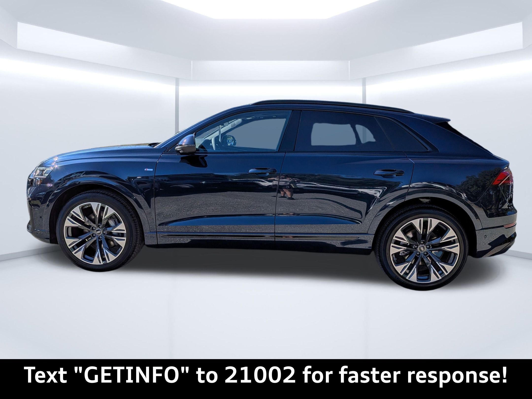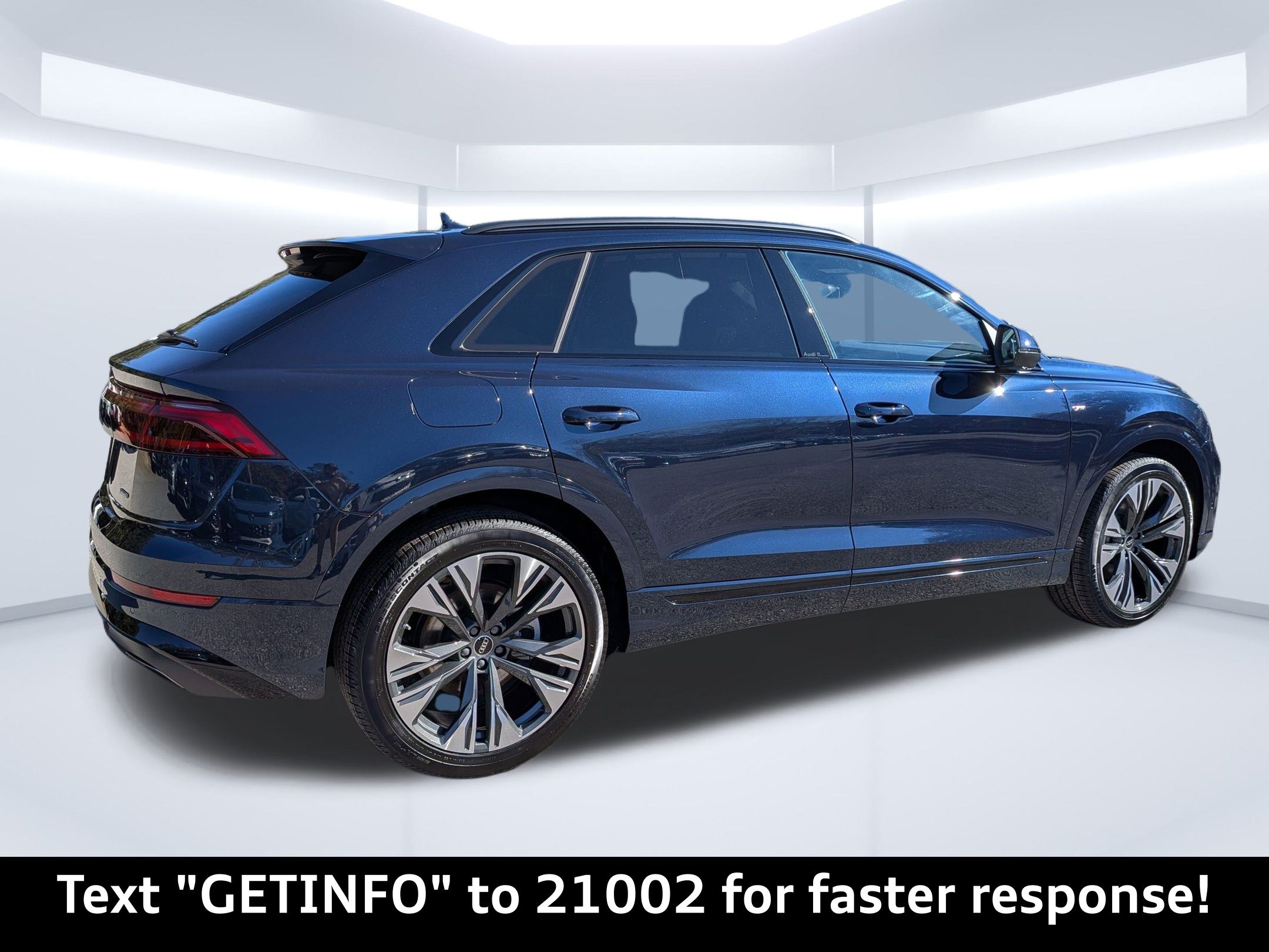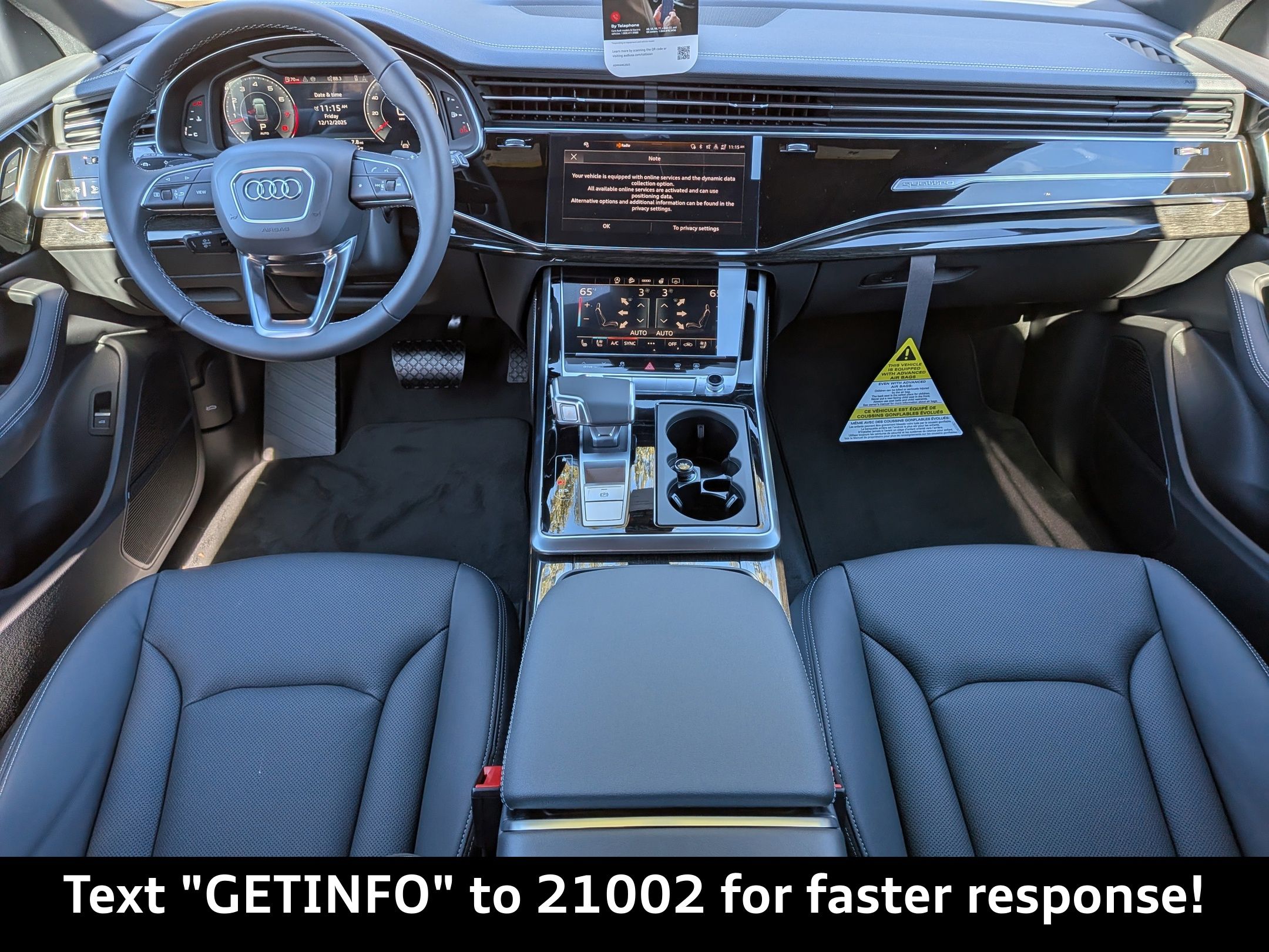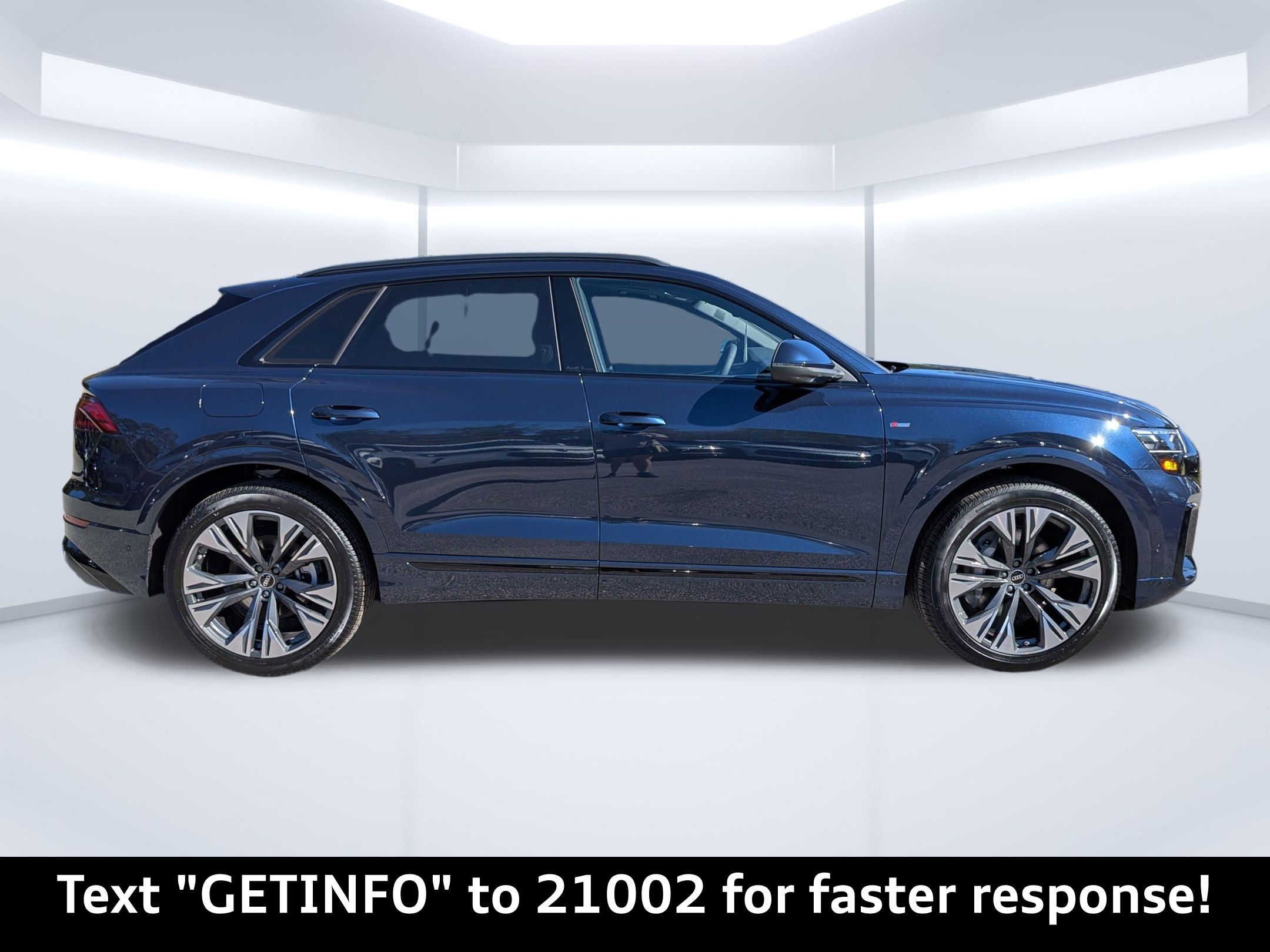 Waitomo Blue Metallic 2026 Audi Q8 Premium Plus quattro quattro 8-Speed Automatic with Tiptronic 3.0L TFSI Passed Rigorous Safety Inspection Performed by Certified Technician, Meticulously Detailed Inside and Out, CLEAN CARFAX, 10 Speakers, 21"" Alloy wheels, 4-Wheel Disc Brakes, ABS brakes, Adaptive suspension, Air Conditioning, AM/FM radio, Audi Sound System, Auto High-beam Headlights, Auto-dimming door mirrors, Auto-dimming Rear-View mirror, Automatic temperature control, Brake assist, Bumpers: body-color, Compass, Delay-off headlights, Driver door bin, Driver vanity mirror, Dual front impact airbags, Dual front side impact airbags, Electronic Stability Control, Emergency communication system: Audi connect CARE, Exterior Parking Camera Rear, Four wheel independent suspension, Front anti-roll bar, Front Bucket Seats, Front Center Armrest, Front dual zone A/C, Front fog lights, Front reading lights, Fully automatic headlights, Garage door transmitter: HomeLink, Genuine wood door panel insert, Heated door mirrors, Heated Front Bucket Seats, Heated front seats, Illuminated entry, Leather Seating Surfaces, Leather Shift Knob, Leather steering wheel, Low tire pressure warning, Memory seat, Navigation system: Audi MMI Navigation plus with Touch Response, Occupant sensing airbag, Outside temperature display, Overhead airbag, Overhead console, Panic alarm, Passenger door bin, Passenger vanity mirror, Power door mirrors, Power driver seat, Power Liftgate, Power moonroof: Panoramic, Power passenger seat, Power steering, Power windows, Radio data system, Radio: Audi MMI Navigation Plus with MMI Touch Response, Rain sensing wipers, Rear air conditioning, Rear anti-roll bar, Rear fog lights, Rear reading lights, Rear seat center armrest, Rear side impact airbag, Rear window defroster, Rear window wiper, Remote keyless entry, Security system, Speed control, Speed-sensing steering, Split folding rear seat, Spoiler, Steering wheel memory, Steering wheel mounted audio controls, Tachometer, Telescoping steering wheel, Tilt steering wheel, Traction control, Trip computer, Turn signal indicator mirrors, Variably intermittent wipers, Wheels: 21"" 5-W-Spoke Design with Bicolor Finish.