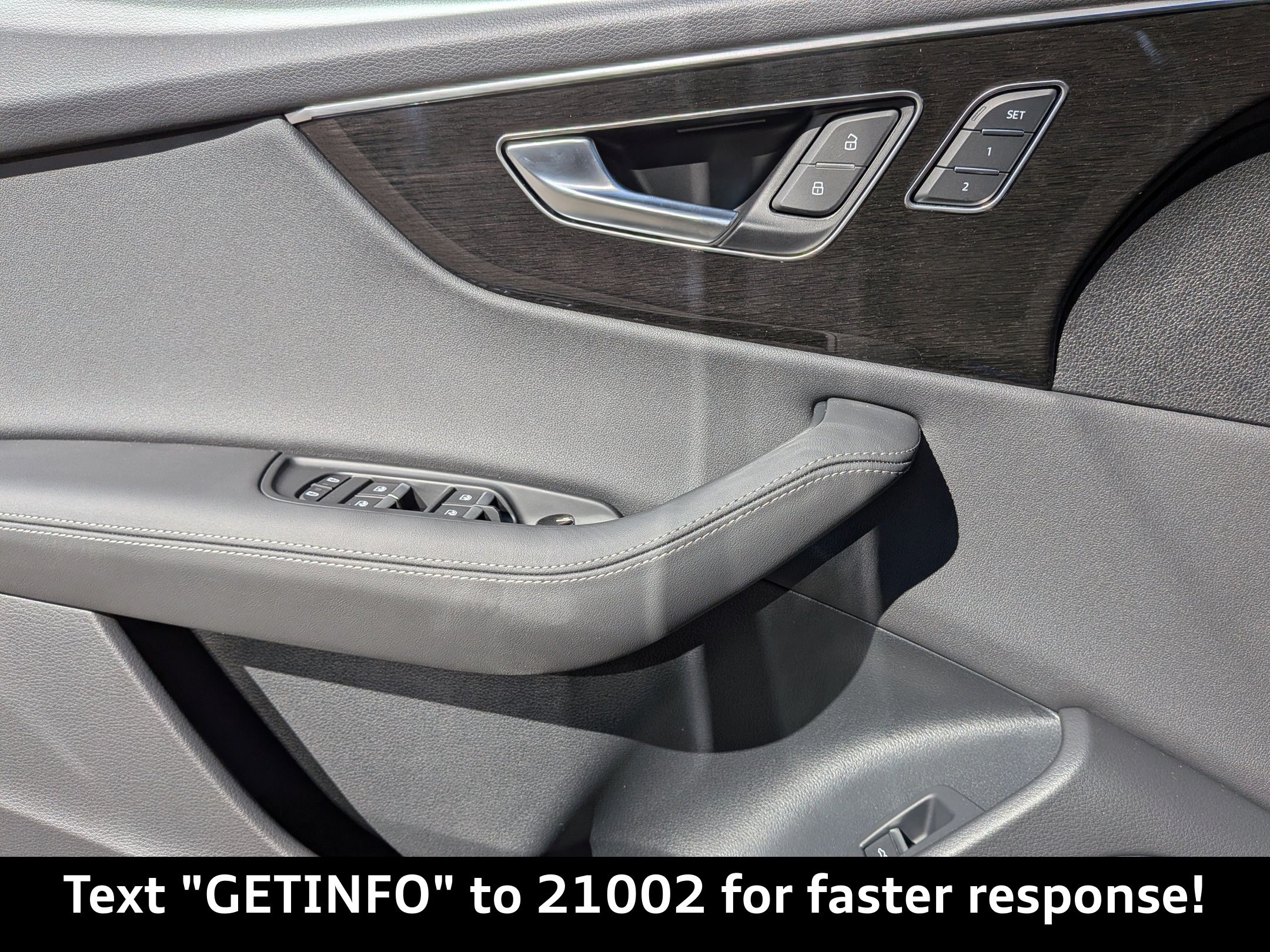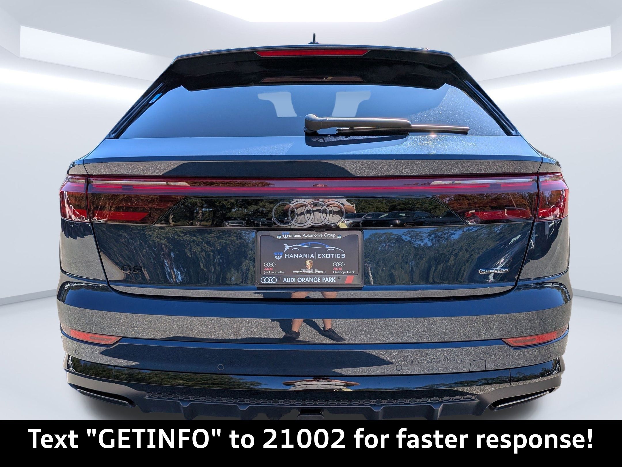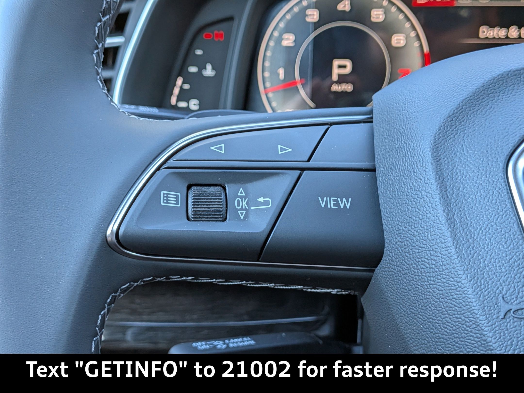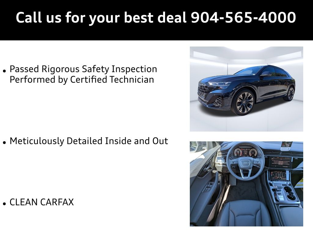 Waitomo Blue Metallic 2026 Audi Q8 Premium Plus quattro quattro 8-Speed Automatic with Tiptronic 3.0L TFSI Passed Rigorous Safety Inspection Performed by Certified Technician, Meticulously Detailed Inside and Out, CLEAN CARFAX, 10 Speakers, 21"" Alloy wheels, 4-Wheel Disc Brakes, ABS brakes, Adaptive suspension, Air Conditioning, AM/FM radio, Audi Sound System, Auto High-beam Headlights, Auto-dimming door mirrors, Auto-dimming Rear-View mirror, Automatic temperature control, Brake assist, Bumpers: body-color, Compass, Delay-off headlights, Driver door bin, Driver vanity mirror, Dual front impact airbags, Dual front side impact airbags, Electronic Stability Control, Emergency communication system: Audi connect CARE, Exterior Parking Camera Rear, Four wheel independent suspension, Front anti-roll bar, Front Bucket Seats, Front Center Armrest, Front dual zone A/C, Front fog lights, Front reading lights, Fully automatic headlights, Garage door transmitter: HomeLink, Genuine wood door panel insert, Heated door mirrors, Heated Front Bucket Seats, Heated front seats, Illuminated entry, Leather Seating Surfaces, Leather Shift Knob, Leather steering wheel, Low tire pressure warning, Memory seat, Navigation system: Audi MMI Navigation plus with Touch Response, Occupant sensing airbag, Outside temperature display, Overhead airbag, Overhead console, Panic alarm, Passenger door bin, Passenger vanity mirror, Power door mirrors, Power driver seat, Power Liftgate, Power moonroof: Panoramic, Power passenger seat, Power steering, Power windows, Radio data system, Radio: Audi MMI Navigation Plus with MMI Touch Response, Rain sensing wipers, Rear air conditioning, Rear anti-roll bar, Rear fog lights, Rear reading lights, Rear seat center armrest, Rear side impact airbag, Rear window defroster, Rear window wiper, Remote keyless entry, Security system, Speed control, Speed-sensing steering, Split folding rear seat, Spoiler, Steering wheel memory, Steering wheel mounted audio controls, Tachometer, Telescoping steering wheel, Tilt steering wheel, Traction control, Trip computer, Turn signal indicator mirrors, Variably intermittent wipers, Wheels: 21"" 5-W-Spoke Design with Bicolor Finish.