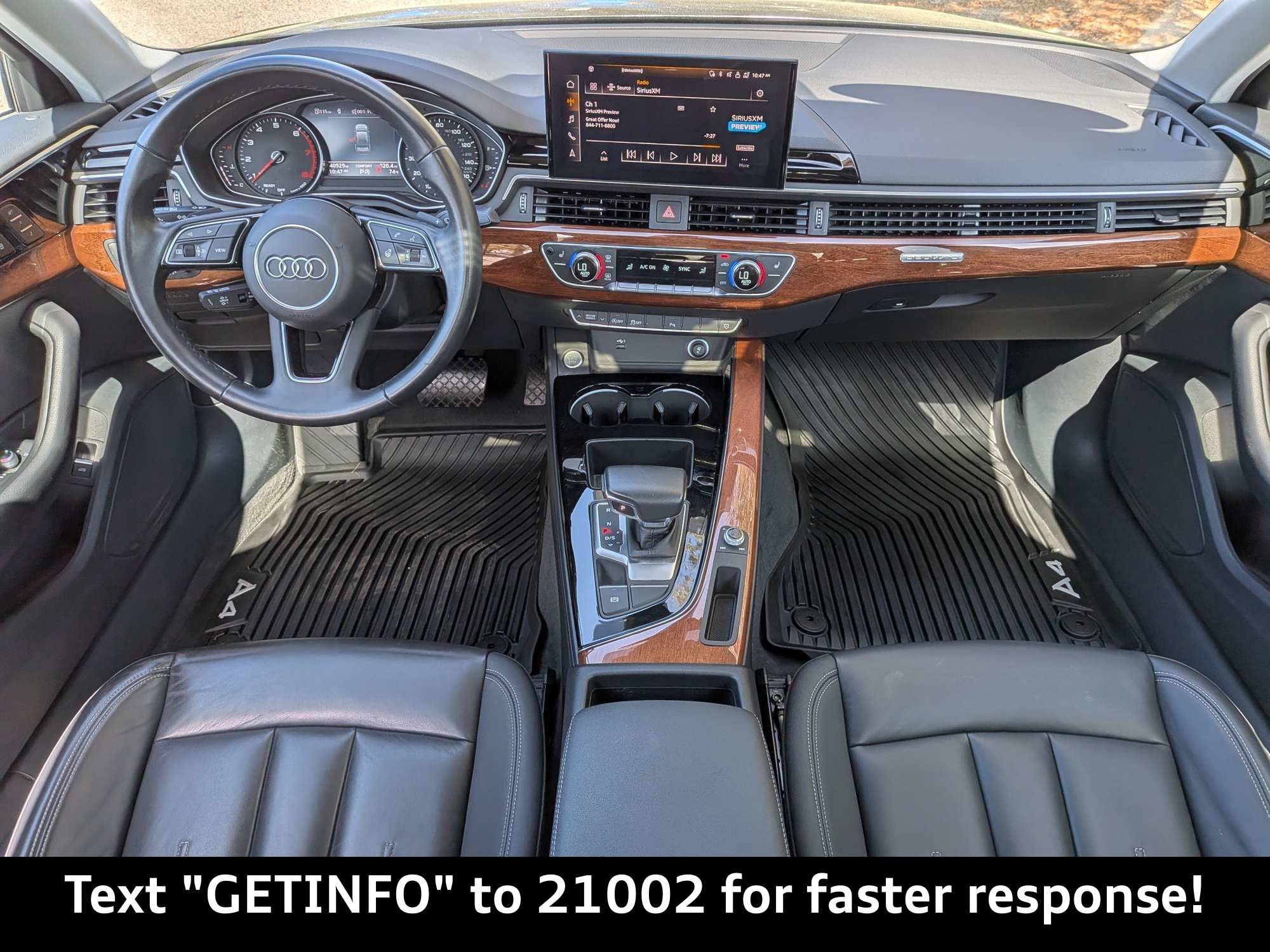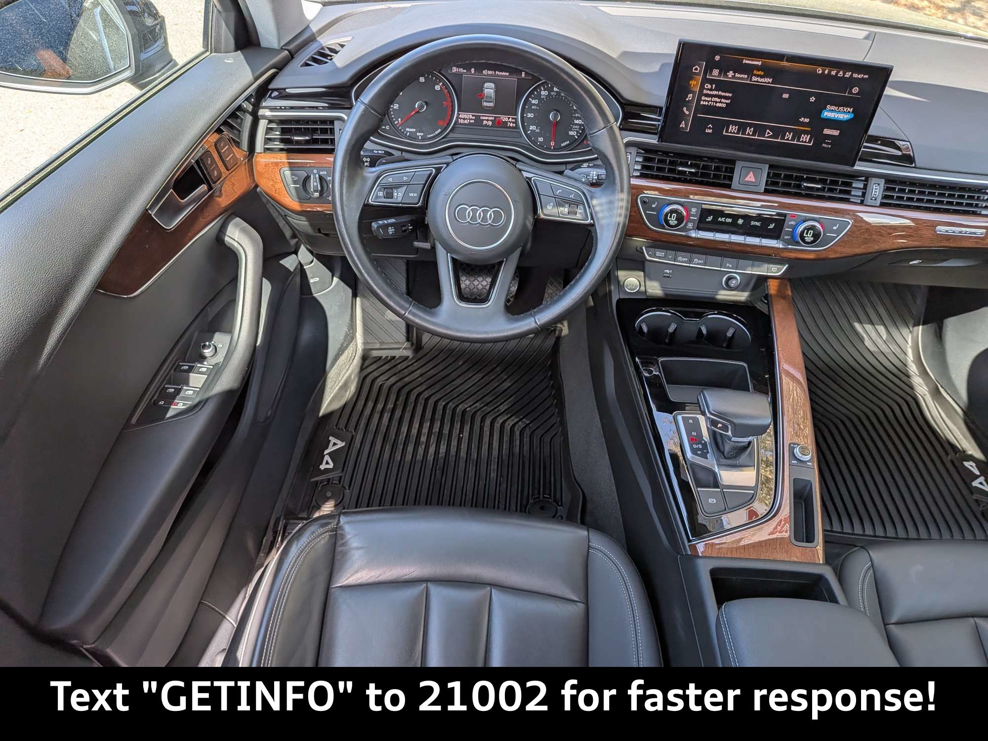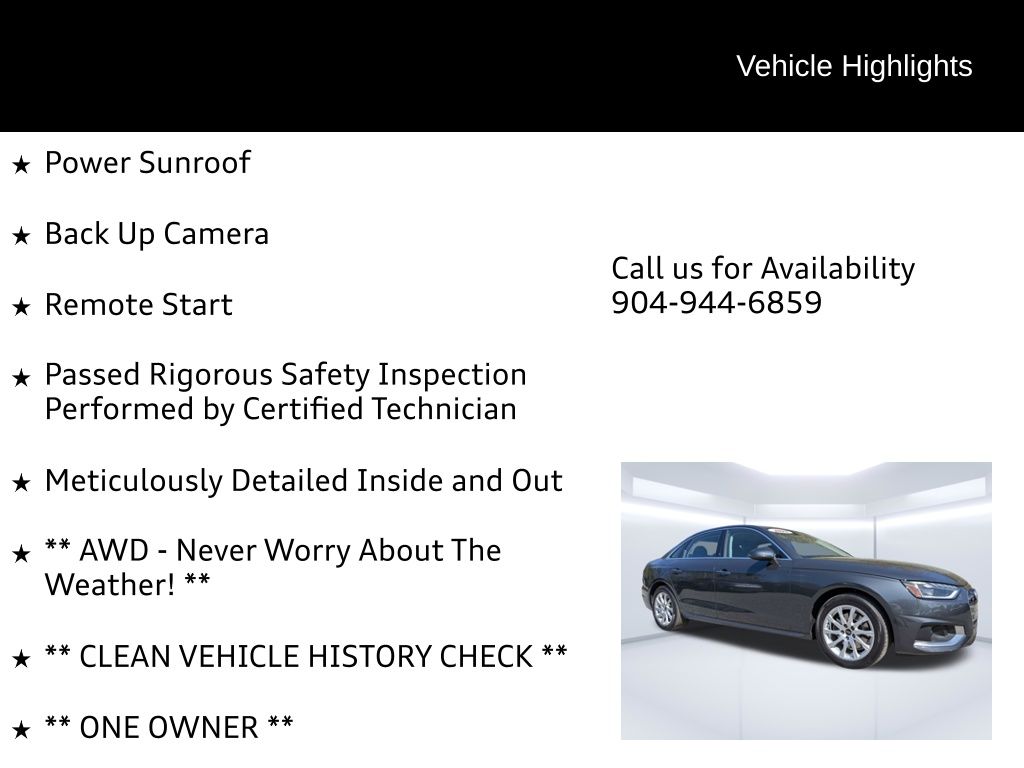Imagine yourself cruising down the oak-lined streets of Mandarin, FL, the sun glinting off the sleek Manhattan Gray Metallic finish of your new Audi A4. Envision the seamless blend of luxury and performance as you navigate the daily commute or embark on a weekend adventure. This 2023 Audi A4 Premium 40 TFSI quattro S tronic is more than just a car; it's a statement of sophisticated living. The heart of this Audi A4 is a potent 2.0L TFSI 4-Cylinder Engine, delivering a responsive and engaging driving experience. Paired with the smooth and efficient 7-Speed S Tronic Transmission, gear changes are seamless, whether you're navigating the bustling streets of Jacksonville or enjoying a spirited drive on the open road. The legendary All-Wheel Drive provides exceptional grip and stability in all conditions, offering confidence and control when the weather turns unpredictable. Audi drive select allows you to tailor the driving experience to your preferences, choosing between comfort, dynamic, and efficiency modes. An Iron engine block ensures durability and longevity, while the Engine oil cooler helps maintain optimal performance even under demanding conditions. Stay connected and entertained with the A4's cutting-edge technology. The Audi smartphone interface seamlessly integrates Apple CarPlay and Android Auto, allowing you to access your favorite apps, music, and contacts with ease. The MMI Touch Display with 10.1-inch Screen provides intuitive control over the vehicle's infotainment system, while the 10 Speakers deliver crystal-clear audio for an immersive listening experience. Navigate to your destination with confidence, and enjoy hands-free calling with Bluetooth wireless device connectivity. The Gauge cluster display size: 7.00 provides essential vehicle information at a glance, while the Exterior temperature display keeps you informed of changing conditions. Step inside the A4's refined cabin and experience a new level of comfort. The Heated Front Bucket Seats provide warmth and support on chilly mornings, while the Leather Seating Surfaces exude luxury and sophistication. Dual-zone front climate control ensures that both driver and passenger can enjoy their preferred temperature. The Power moonroof allows you to let in natural light and fresh air, creating an open and airy atmosphere. The Driver's Seat Memory Function remembers your preferred seating position, while the Audi Advanced Key (Keyless Entry and Start) adds convenience and security. The Aluminum Ellipse Inlays add a touch of modern elegance to the interior. Your safety is paramount, and the Audi A4 is equipped with a comprehensive suite of safety and driver assistance features. Adaptive cruise control maintains a safe following distance from the vehicle ahead, while Audi Side Assist with Pre Sense Rear alerts you to vehicles in your blind spot. Parking System Plus (Front and Rear Acoustic Sensors) makes maneuvering in tight spaces a breeze, while the Anti-Theft Alarm System with Motion Sensors provides added security. Automatic Emergency Braking can help prevent or mitigate collisions, while the advanced airbag system provides comprehensive protection in the event of an accident. The Audi A4's exterior is both elegant and athletic. The Manhattan Gray Metallic paint finish exudes sophistication, while the 17-inch 10-Spoke Design Wheels add a touch of sporty flair. LED low and high beam headlights provide excellent visibility, while the Power-Folding, Auto-Dimming Exterior Mirrors with Memory add convenience and style. The First-row sunroof allows you to enjoy the open air, while the sleek body lines create a dynamic and eye-catching silhouette. The Ambient lighting enhances the overall aesthetic, creating a welcoming and refined atmosphere. Here are some of the standout features that make the 2023 Audi A4 Premium 40 TFSI quattro S tronic a truly exceptional vehicle: Audi Orange Park is conveniently located for residents of Saint Johns, FL, Fleming Island, FL, Mandarin, FL, Jacksonville, FL, and Orange Park, FL. We invite you to visit our showroom at 7230 Blanding Blvd, Jacksonville, FL 32244, or call us at (904) 565-4000 to schedule a test drive. Our friendly and knowledgeable staff is here to help you find the perfect Audi to fit your needs and lifestyle. You can also apply for credit or get a trade-in value online. We look forward to welcoming you to Audi Orange Park! Get Directions to Audi Orange Park Build Codes: WPD | SIDE | 7X2 | MEM | EXMIRR | ALARM | SIRIUS | STEER | ADCC | KEY | STDEN | STDRD | STDST | STDTM | STDTR | STDWL | ZY2023 Audi A4 Premium 40 TFSI quattro S tronic: Elevate Your Drive