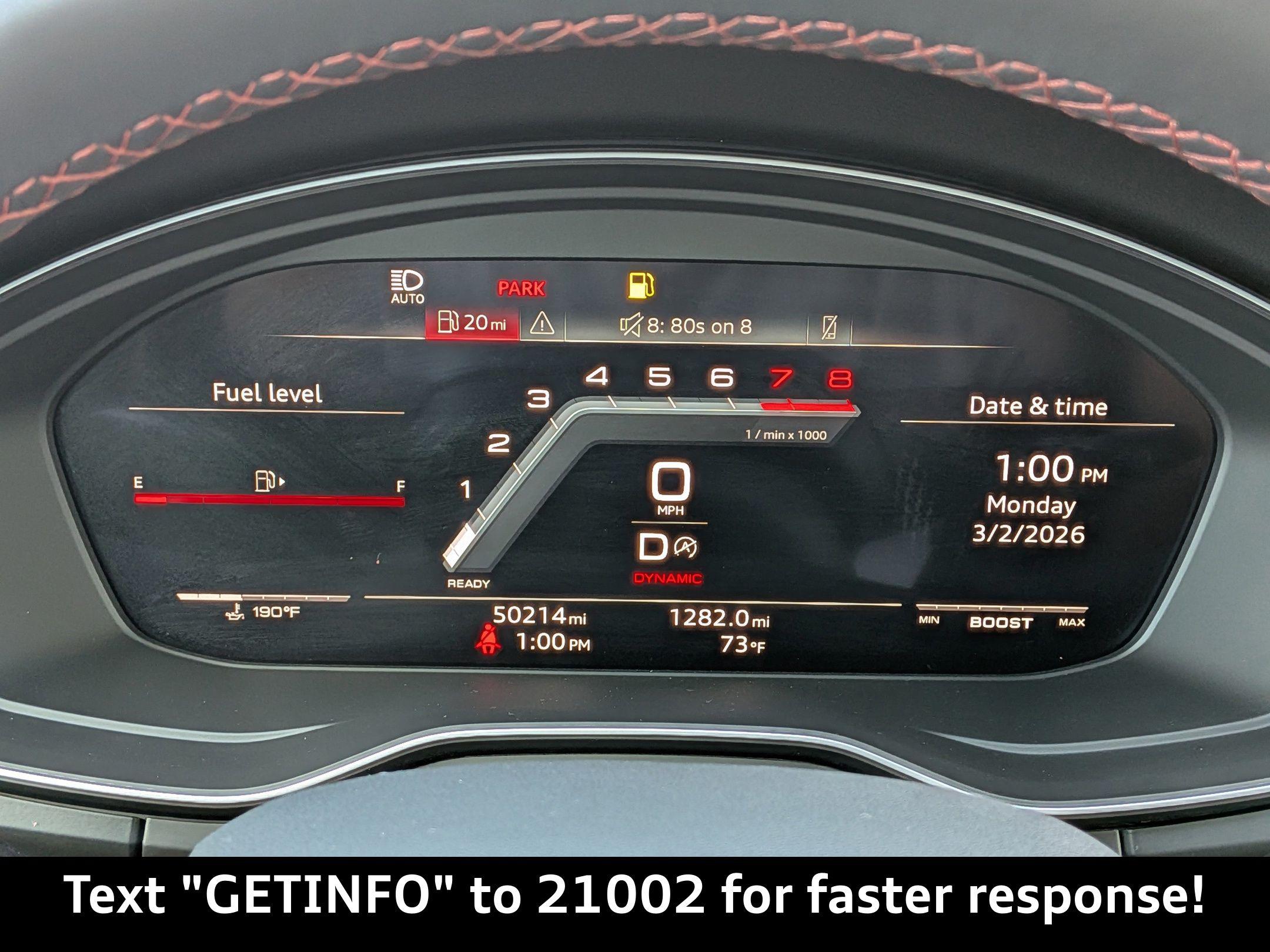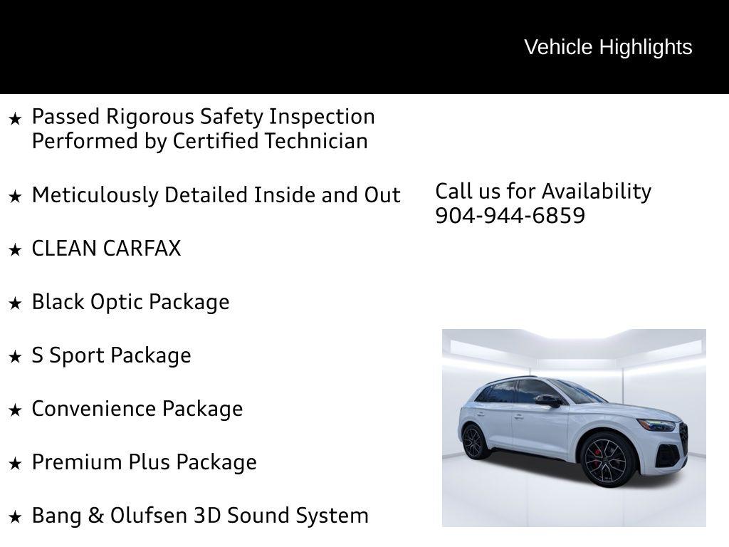 Imagine navigating the oak-lined streets of Mandarin, the St. Johns River glinting in the distance, as you head out for a Saturday morning round of golf. This meticulously maintained 2023 Audi SQ5 Premium Plus, bathed in Ibis White with a striking Magma Red interior, isn't just an SUV—it's a statement. Whether it's a smooth weekday commute or a weekend adventure, this Audi is ready. With its All-Wheel Drive and potent turbocharged engine, the SQ5 offers exhilarating performance and confident handling, perfect for exploring the scenic backroads near Saint Johns or effortlessly cruising down Blanding Boulevard. The Premium Plus trim adds a touch of elevated luxury, ensuring every journey is as comfortable as it is thrilling. From its advanced technology to its refined interior, this SQ5 is designed to elevate every aspect of your driving experience. The 2023 Audi SQ5 Premium Plus is engineered to deliver exhilarating performance and confident handling in any situation. At its heart lies a potent 3.0L TFSI 6-Cylinder engine producing 349 horsepower, providing ample power for effortless merging onto I-95 or spirited drives along the scenic A1A. The advanced aluminum engine block ensures optimal weight distribution, contributing to the vehicle's agile feel. Coupled with the responsive 8-Speed Tiptronic automatic transmission, gear changes are seamless and precise, whether you're navigating the stop-and-go traffic of Jacksonville or enjoying a weekend excursion. The legendary quattro all-wheel drive system provides exceptional grip and stability, inspiring confidence in challenging weather conditions or when venturing off the beaten path near Fleming Island. The Audi drive select system allows you to tailor the driving experience to your preferences, with selectable modes for optimized performance, comfort, or efficiency. The available Sport Adaptive Air Suspension further enhances ride quality and handling, automatically adjusting to changing road conditions. For those seeking enhanced control, the electro-mechanical limited slip differential optimizes power delivery to the wheels with the most traction. Whether you're towing a small boat for a day on the St. Johns River or simply appreciating the responsive handling on a winding road near Mandarin, the SQ5 delivers a dynamic and engaging driving experience. The New Vehicles start-stop engine technology helps to maximize fuel efficiency during city driving, while the robust cooling system ensures consistent performance even under demanding conditions. Stay connected and entertained in the 2023 Audi SQ5. The centerpiece is a vibrant 10.1-inch touchscreen display, offering intuitive control over vehicle functions and infotainment. Seamlessly integrate your smartphone with Apple CarPlay and Android Auto for navigation, music streaming, and hands-free calling. The Audi Virtual Cockpit, a 12.3-inch digital instrument cluster, puts vital driving information and customizable displays right in your line of sight. Enjoy crystal-clear audio through the available Bang & Olufsen 3D Premium Sound System, perfect for enjoying your favorite playlists on your commute from Mandarin. With multiple USB ports located throughout the cabin, keeping your devices charged on long trips is a breeze. Voice-activated controls let you manage music, navigation, and more, keeping your focus on the road whether you're headed to the beaches near Jacksonville or exploring the scenic routes around Saint Johns. Bluetooth connectivity allows for wireless audio streaming and hands-free calls. Call us at (904) 565-4000 or Get Directions to Audi Orange Park Slide into the exquisitely crafted cabin of this 2023 Audi SQ5, where luxury meets practicality. Sink into the Fine Nappa Leather Seats, enjoying personalized comfort with the Heated Front Sport Seats and available lumbar support. The tri-zone automatic climate control ensures everyone stays comfortable, whether you're navigating Jacksonville traffic or embarking on a weekend getaway. The SQ5 offers a versatile interior, perfect for hauling groceries from Publix or sports gear after a day at the beach. The 40/20/40 split-folding rear seats provide flexible cargo configurations, easily accessible via the Power Liftgate. Convenience is paramount, with features like keyless entry, push-button start, and a Heated Steering Wheel for those cooler mornings. Memory settings for the driver's seat and mirrors ensure your preferred driving position is always at the ready. The thoughtful design extends to the rear passengers, with dedicated climate controls and under-seat ducts maintaining optimal comfort throughout the cabin. Enjoy the convenience of multiple 12V power outlets for all your devices. Peace of mind comes standard in the 2023 Audi SQ5. Whether you're navigating the bustling streets of Jacksonville or cruising along the First Coast Expressway, a comprehensive suite of safety features works diligently to protect you and your loved ones. The Audi pre sense city system provides forward collision mitigation, while Audi side assist offers blind spot monitoring for confident lane changes. Adaptive cruise control with stop and go functionality makes highway driving effortless, automatically adjusting your speed to maintain a safe following distance. Maneuvering in tight spots is simplified with the Top View Camera System, providing an aerial view of your surroundings. Parking sensors add another layer of safety, alerting you to potential obstacles. Inside, a network of six airbags, including front, side, and overhead airbags, provides comprehensive protection in the event of a collision. Electronic Stability Control and 4-wheel ABS brakes further enhance control in challenging conditions. With these advanced safety technologies, you can confidently embrace every journey, knowing that the SQ5 is engineered to prioritize your well-being. Parts Department The 2023 Audi SQ5 Premium Plus makes a bold statement, whether navigating the ups