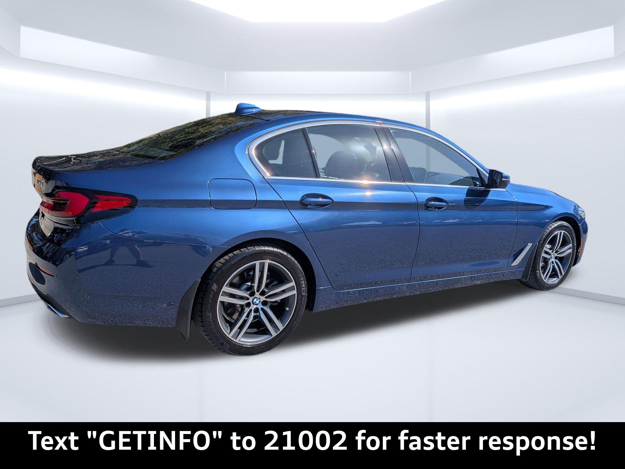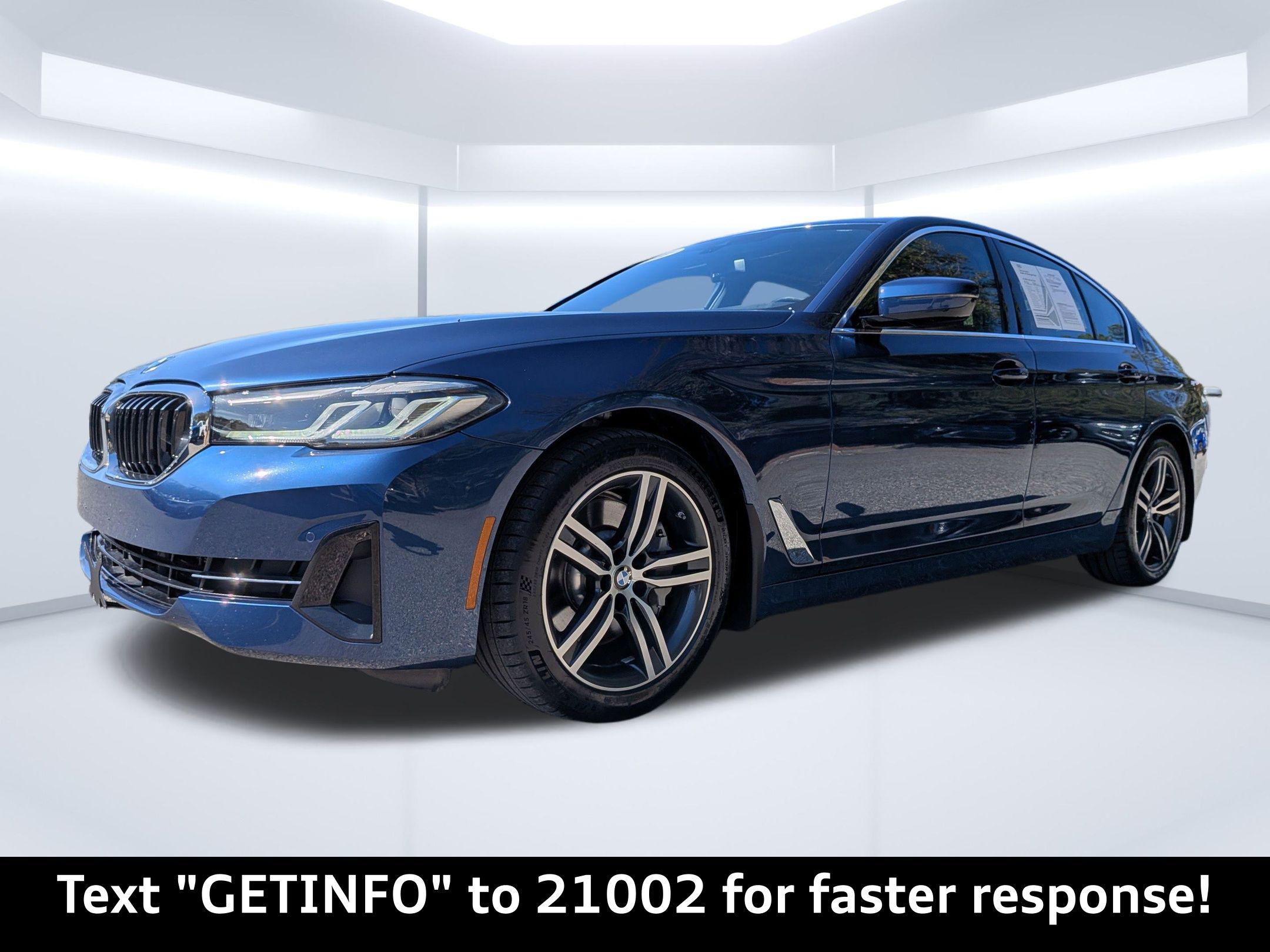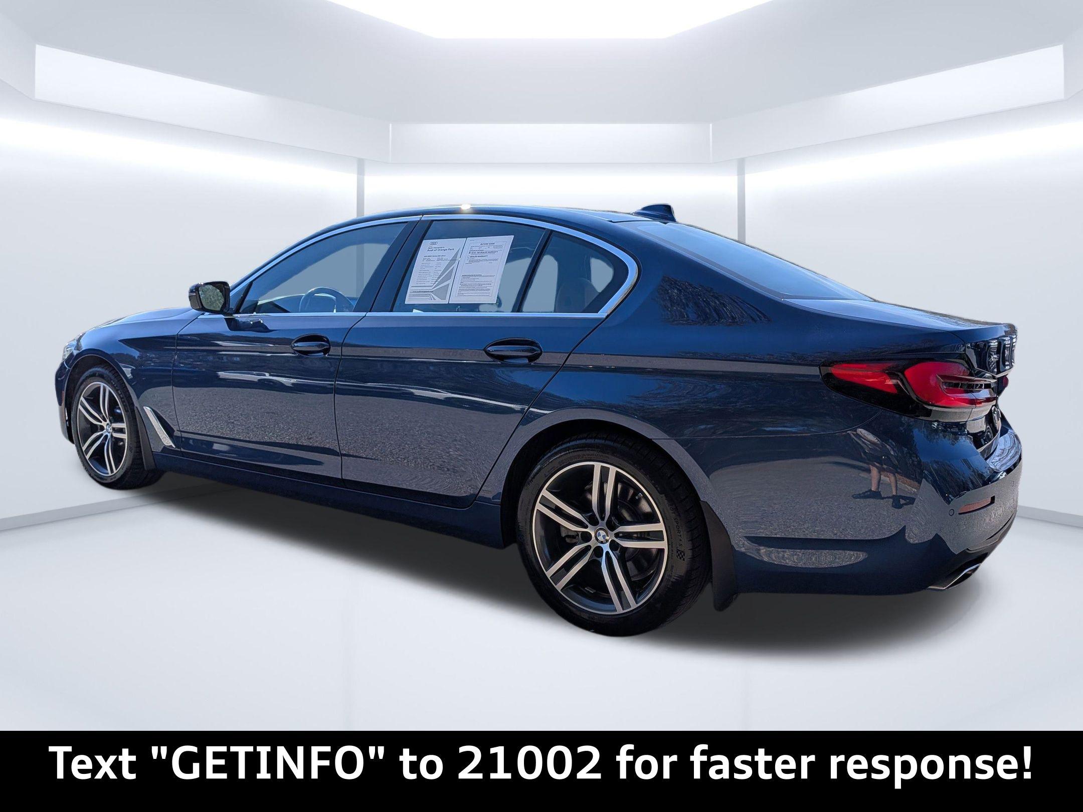 Experience the perfect blend of luxury, performance, and technology with the 2023 BMW 530 i xDrive, available now at Audi Orange Park. Located conveniently at 7230 Blanding Blvd, Jacksonville, FL 32244, this sophisticated sedan is designed to cater to the dynamic lifestyle of Florida's discerning drivers. Whether you're navigating the bustling streets of Jacksonville or cruising along the scenic coastal highways, this vehicle offers an unparalleled driving experience. Under the hood, the 2023 BMW 530 i xDrive boasts a robust 2L I-4 TwinPower Turbo engine with 248 horsepower, paired with an 8-speed Sport Automatic Transmission. Its xDrive All-Wheel Drive system ensures superior handling and stability, making it ideal for everything from weekday commutes to weekend getaways. The four-wheel independent suspension and adaptive headlights mean you’re ready for any journey, be it a short drive to the office or a road trip to the nearby beaches. This BMW is packed with cutting-edge technology that enhances every drive. The Live Cockpit Pro with Navigation and 12.3-inch touchscreen display keep you connected with real-time traffic updates, ensuring you never miss a beat. Enjoy seamless integration with Apple CarPlay and Android Auto Compatibility, allowing you to access your favorite apps and music effortlessly. The BMW Intelligent Personal Assistant adds a touch of futurism, responding to your voice commands for climate control and navigation. Safety is paramount in the 530 i xDrive, equipped with Active Blind Spot Detection, Frontal Collision Warning, and Lane Departure Warning. The Park Distance Control and rearview camera make parking in tight urban spaces a breeze. Inside, indulge in comfort with heated front seats and a heated steering wheel, perfect for those cooler Florida mornings. The SensaTec leatherette upholstery and Gray Poplar Wood Trim create an inviting cabin ambiance. The stunning Phytonic Blue Metallic exterior paired with 18-inch Double-Spoke Burnished Orbit Gray Wheels ensures you make a statement wherever you go. The power moonroof invites the Florida sunshine in, enhancing your drive with a touch of nature. With runflat tires and rain-sensing wipers, you're prepared for any weather Jacksonville throws your way. This meticulously detailed vehicle is ready for you at Audi Orange Park. Don’t miss your chance to own the 2023 BMW 530 i xDrive. Call us at 904-565-4000 to schedule your test drive today or visit our dealership by clicking Get Directions for a firsthand experience of this exceptional vehicle.Discover the 2023 BMW 530 i xDrive: Elevate Your Drive in Jacksonville