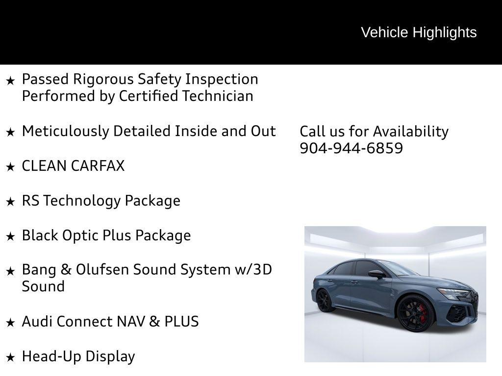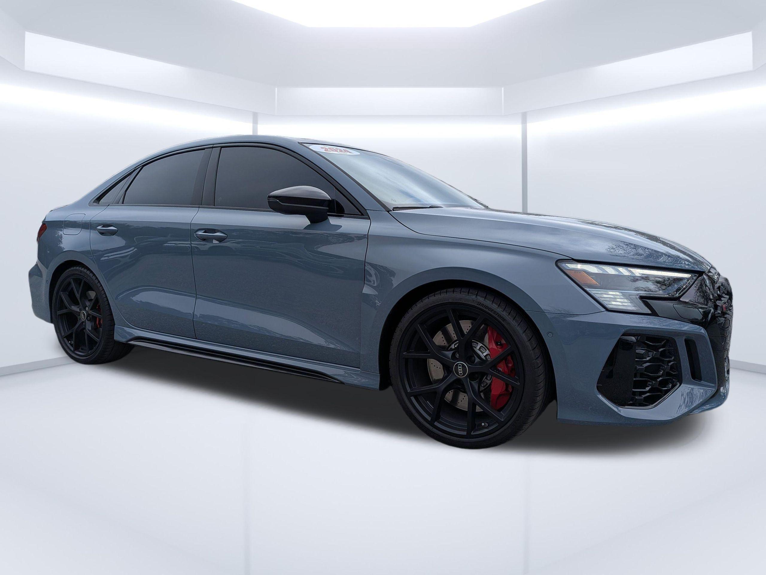 Discover the essence of performance and luxury with the 2024 Audi RS 3 Sedan TFSI quattro S tronic, now available at Audi Orange Park. Perfectly engineered for the dynamic lifestyle of Jacksonville, FL, this sedan effortlessly combines power, precision, and elegance, making it the ultimate choice for those who refuse to compromise. Under the hood, the 2.5L TFSI 5-Cylinder DOHC engine unleashes an exhilarating 401 horsepower, ensuring that every drive is a thrilling experience. The 7-speed S Tronic Dual-Clutch Automatic Transmission paired with Audi's renowned quattro all-wheel drive system delivers seamless power distribution and exceptional traction, whether you're cruising down Jacksonville Beach or navigating the bustling city streets. The adaptive suspension and electro-mechanical limited slip differential ensure a smooth and controlled ride, making even the most mundane commutes something to look forward to. Stay connected and entertained with the Audi MMI Navigation Plus, featuring a vivid 10.1-inch primary display and the intuitive Audi virtual cockpit plus. Enjoy seamless integration with Apple CarPlay and Android Auto, while the Bang & Olufsen Sound System with 3D Sound transforms every playlist into an immersive audio experience. The head-up display keeps vital information within your line of sight, allowing you to focus on the road ahead. Safety is paramount in the RS 3 Sedan, which comes equipped with Audi pre sense basic and front forward collision mitigation, lane departure warning, and adaptive cruise control with lane guidance. Navigate with confidence using the rearview camera and Audi park assist for effortless parking in crowded spots. Inside, the cabin is a sanctuary of luxury, featuring fine Nappa leather seat trim and heated front S Sport seats to ensure comfort on those early morning drives to Amelia Island or St. Augustine. The striking Kemora Gray Metallic exterior is complemented by the aggressive black optic plus package and carbon package, giving the RS 3 a commanding presence. 19-inch 5-Y-Spoke Design wheels with a matte black finish and red painted brake calipers add a touch of sportiness, while the RS sport exhaust system with black tips announces your arrival with a distinctive growl. Embrace the luxury and performance of the 2024 Audi RS 3 Sedan, a vehicle as versatile as your lifestyle. Explore the possibilities by visiting Audi Orange Park, conveniently located at 7230 Blanding Blvd, Jacksonville, FL 32244. Ready to make it yours? Start your journey by completing our Credit Application. For more information, call us at 904-565-4000 or visit us in person. Experience the Audi RS 3 Sedan today and redefine what it means to drive.Experience the Thrill: 2024 Audi RS 3 Sedan TFSI quattro S tronic