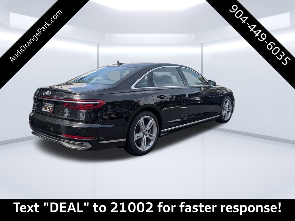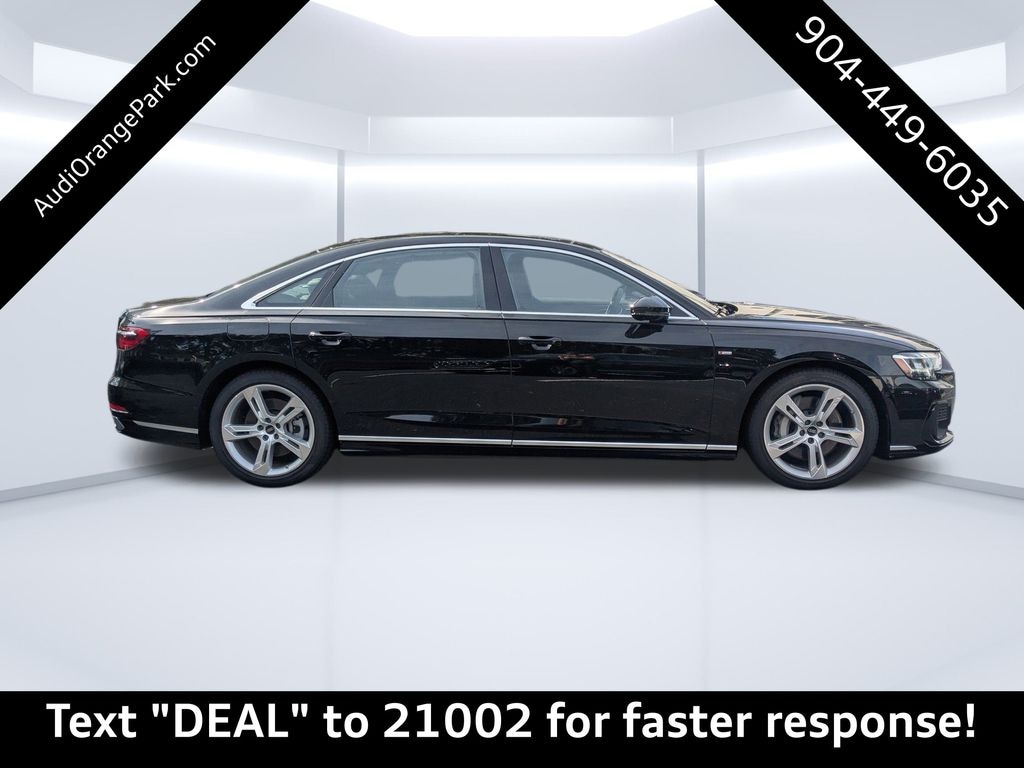 Mythos Black Metallic 2025 Audi A8 L 55 quattro quattro 8-Speed Automatic with Tiptronic 3.0L V6 Turbocharged DOHC 24V LEV3-ULEV70 335hp Passed Rigorous Safety Inspection Performed by Certified Technician, Meticulously Detailed Inside and Out, Adaptive Cruise Assist w/Lane Guidance, Alu-Optic Buttons, Audi Side Assist w/Pre Sense Rear, Dual-Pane Acoustic Glass for Side Windows, Dynamic All-Wheel-Steering, Executive Package, Extended Leather Package, Front Seat Massage Function, HD Matrix-Design LED Headlights, Head-Up Display, Headlight Washers, Heated Front Seat Armrests, Heated Rear Seats, Intersection Assist, LED Interior Lighting Plus Package, Luxury Package, Remote Park Assist Plus, Valcona Leather Seat Upholstery, Wheels: 20'' 5-Spoke Design, 17 Speakers, 22-Way Multi-Contour Comfort Front Seats, 4-Wheel Disc Brakes, ABS brakes, Adaptive suspension, Air Conditioning, AM/FM radio: SiriusXM, Auto High-beam Headlights, Auto tilt-away steering wheel, Auto-dimming door mirrors, Auto-dimming Rear-View mirror, Auto-leveling suspension, Automatic temperature control, Bang & Olufsen Premium Sound System w/3D Sound, Brake assist, Bumpers: body-color, Compass, Delay-off headlights, Driver door bin, Driver vanity mirror, Dual front impact airbags, Dual front side impact airbags, Electronic Stability Control, Emergency communication system: Audi connect CARE, PRIME & PLUS, Exterior Parking Camera Rear, Four wheel independent suspension, Front anti-roll bar, Front Bucket Seats, Front Center Armrest w/Storage, Front dual zone A/C, Front fog lights, Front reading lights, Garage door transmitter: HomeLink, Genuine wood door panel insert, Head restraints memory, Heated door mirrors, Heated front seats, HVAC memory, Illuminated entry, Knee airbag, Leather Shift Knob, Leather steering wheel, Low tire pressure warning, Memory seat, Navigation system: MMI Navigation plus, Occupant sensing airbag, Outside temperature display, Overhead airbag, Overhead console, Panic alarm, Passenger door bin, Passenger vanity mirror, Power 2nd-Row Moonroof, Power adjustable front head restraints, Power door mirrors, Power driver seat, Power moonroof, Power passenger seat, Power steering, Power windows, Radio data system, Radio: Audi MMI Navigation Plus, Rain sensing wipers, Rear air conditioning, Rear anti-roll bar, Rear dual zone A/C, Rear fog lights, Rear reading lights, Rear seat center armrest, Rear side impact airbag, Rear Window Blind, Rear window defroster, Remote keyless entry, Seatbelt memory, Security system, Speed control, Speed-sensing steering, Speed-Sensitive Wipers, Steering wheel memory, Steering wheel mounted audio controls, Tachometer, Telescoping steering wheel, Tilt steering wheel, Traction control, Trip computer, Turn signal indicator mirrors, Valetta Leather Seat Upholstery, Variably intermittent wipers, Ventilated front seats, CLEAN CARFAX, Adaptive Cruise Assist w/Lane Guidance, Alu-Optic Buttons, Audi Side Assist w/Pre Sense Rear, Dual-Pane Acoustic Glass for Side Windows, Dynamic All-Wheel-Steering, Executive Package, Extended Leather Package, Front Seat Massage Function, HD Matrix-Design LED Headlights, Head-Up Display, Headlight Washers, Heated Front Seat Armrests, Heated Rear Seats, Intersection Assist, LED Interior Lighting Plus Package, Luxury Package, Remote Park Assist Plus, Valcona Leather Seat Upholstery, Wheels: 20'' 5-Spoke Design.20/26 City/Highway MPG