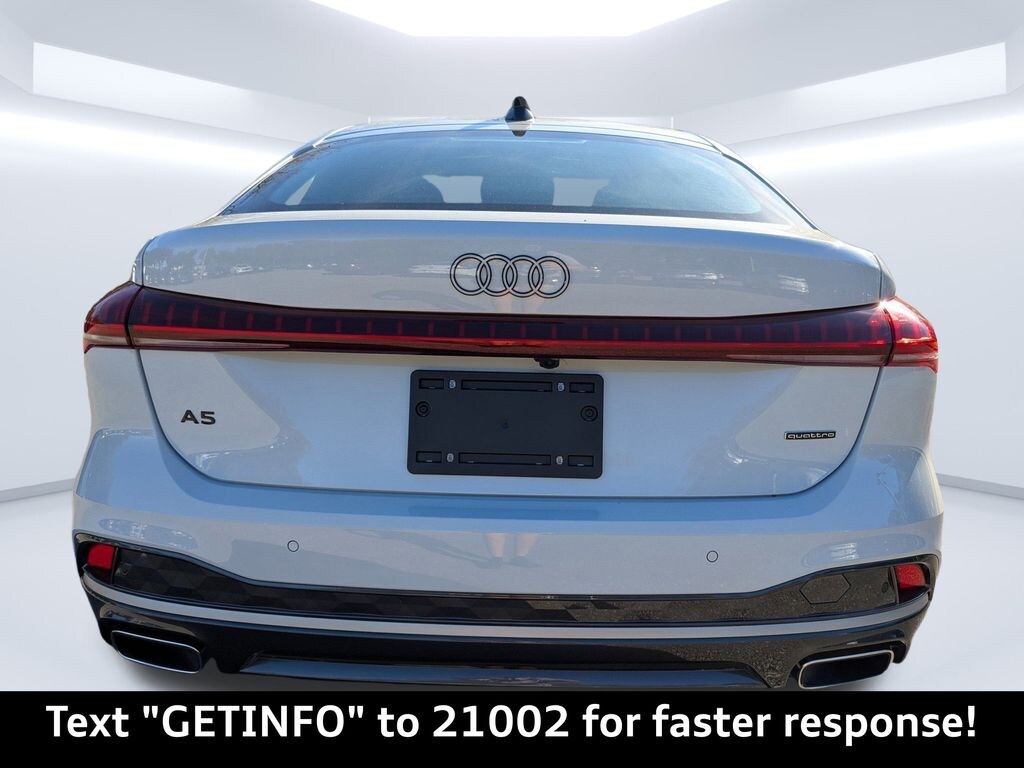 Glacier White Metallic 2025 Audi All-new A5 Premium Plus quattro quattro 7-Speed Automatic S tronic 2.0L 4-Cylinder TFSI Passed Rigorous Safety Inspection Performed by Certified Technician, Meticulously Detailed Inside and Out, 19'' Wheel Package, Adaptive Cruise Assist, Animation for Taillights, Bang & Olufsen Sound System w/3D Sound, Beige Warm Weather Package, Brown Applewood Natural Wood Inlays, Dynamic Interaction Light, Head-Up Display, Heated & Ventilated Front Sport Seats, Heated Steering Wheel w/Hands-On Detection, LED Headlights Plus w/Digital DRL, LED Interior Lighting Pro Package, Manual Rear Side Window Sunshades, Panoramic Glass Roof w/Variable Light Control, Park Assist Plus, Premium Plus, Top View Camera System, USB Power Delivery (2x60W Front & 2x100W Rear), Wheels: 19'' 5-Arm-Aero Design Bi-Color Finish, 10 Speakers, 4-Wheel Disc Brakes, ABS brakes, Air Conditioning, Anti-whiplash front head restraints, Auto High-beam Headlights, Auto-dimming door mirrors, Auto-dimming Rear-View mirror, Automatic temperature control, Brake assist, Bumpers: body-color, Compass, Delay-off headlights, Driver door bin, Driver vanity mirror, Dual front impact airbags, Dual front side impact airbags, Electronic Stability Control, Emergency communication system: Audi connect CARE, Exterior Parking Camera Rear, Four wheel independent suspension, Front anti-roll bar, Front Bucket Seats, Front Center Armrest, Front dual zone A/C, Front fog lights, Front reading lights, Garage door transmitter: HomeLink, Genuine wood dashboard insert, Genuine wood door panel insert, Heated door mirrors, Heated Front Bucket Seats, Heated front seats, Illuminated entry, Knee airbag, Leather Seating Surfaces, Leather steering wheel, Low tire pressure warning, Memory seat, Navigation system: MMI Navigation plus, Occupant sensing airbag, Outside temperature display, Overhead airbag, Overhead console, Panic alarm, Passenger door bin, Passenger vanity mirror, Power adjustable front head restraints, Power door mirrors, Power driver seat, Power Liftgate, Power passenger seat, Power steering, Power windows, Radio data system, Radio: Audi Sound System, Rain sensing wipers, Rear air conditioning, Rear anti-roll bar, Rear reading lights, Rear seat center armrest, Rear window defroster, Remote keyless entry, Security system, Speed control, Speed-sensing steering, Speed-Sensitive Wipers, Split folding rear seat, Steering wheel mounted audio controls, Tachometer, Telescoping steering wheel, Tilt steering wheel, Traction control, Trip computer, Turn signal indicator mirrors, Variably intermittent wipers, CLEAN CARFAX, 19'' Wheel Package, Adaptive Cruise Assist, Animation for Taillights, Bang & Olufsen Sound System w/3D Sound, Beige Warm Weather Package, Brown Applewood Natural Wood Inlays, Dynamic Interaction Light, Head-Up Display, Heated & Ventilated Front Sport Seats, Heated Steering Wheel w/Hands-On Detection, LED Headlights Plus w/Digital DRL, LED Interior Lighting Pro Package, Manual Rear Side Window Sunshades, Panoramic Glass Roof w/Variable Light Control, Park Assist Plus, Premium Plus, Top View Camera System, USB Power Delivery (2x60W Front & 2x100W Rear), Wheels: 19'' 5-Arm-Aero Design Bi-Color Finish.22/31 City/Highway MPG