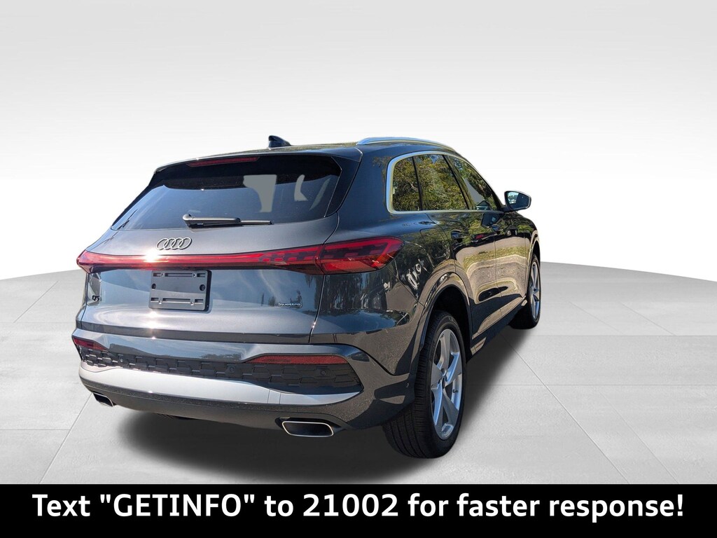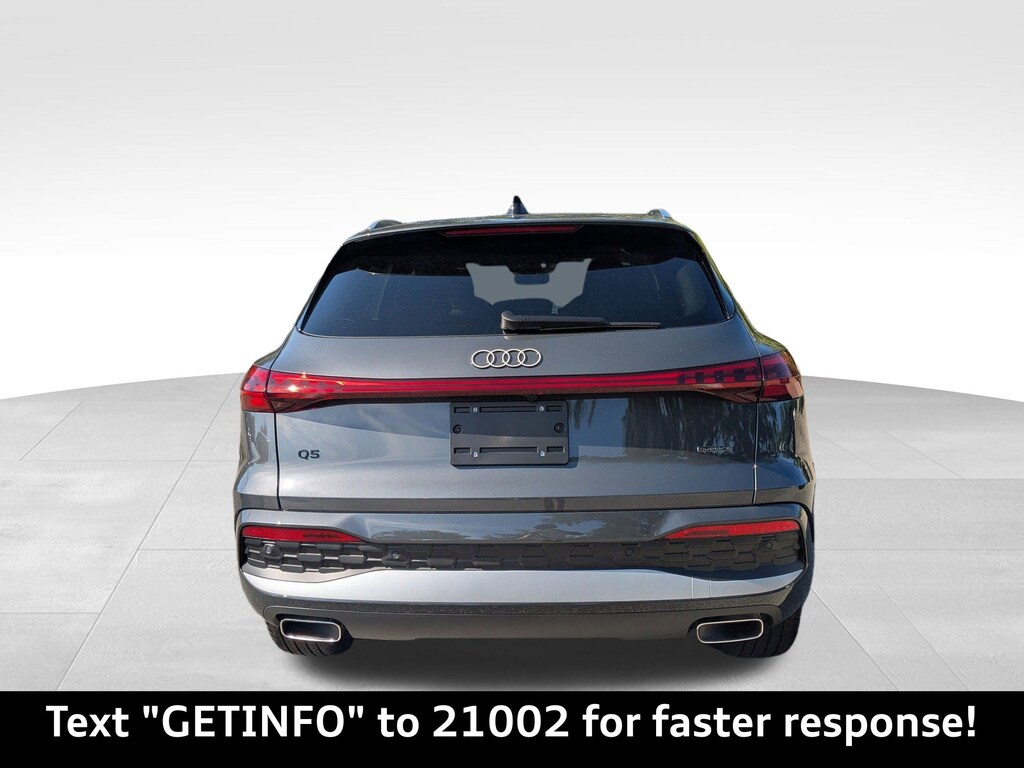 Tambora Gray Metallic 2025 Audi All-new Q5 Premium Plus quattro quattro 7-Speed Automatic S tronic 2.0L 4-Cylinder TFSI Passed Rigorous Safety Inspection Performed by Certified Technician, Meticulously Detailed Inside and Out, 10 Speakers, 21'' Alloy wheels, 4-Wheel Disc Brakes, ABS brakes, Air Conditioning, Auto High-beam Headlights, Auto tilt-away steering wheel, Auto-dimming door mirrors, Auto-dimming Rear-View mirror, Automatic temperature control, Brake assist, Bumpers: body-color, Compass, Delay-off headlights, Driver door bin, Driver vanity mirror, Dual front impact airbags, Dual front side impact airbags, Electronic Stability Control, Emergency communication system: Audi connect CARE, Exterior Parking Camera Rear, Four wheel independent suspension, Front anti-roll bar, Front Bucket Seats, Front Center Armrest, Front dual zone A/C, Front fog lights, Front reading lights, Garage door transmitter: HomeLink, Genuine wood console insert, Genuine wood dashboard insert, Genuine wood door panel insert, Heated door mirrors, Heated Front Bucket Seats, Heated front seats, Illuminated entry, Leather Seating Surfaces, Leather steering wheel, Low tire pressure warning, Memory seat, Navigation system: Audi Navigation Plus, Occupant sensing airbag, Outside temperature display, Overhead airbag, Overhead console, Panic alarm, Passenger door bin, Passenger vanity mirror, Power door mirrors, Power driver seat, Power Liftgate, Power passenger seat, Power steering, Power windows, Radio data system, Radio: MMI Navigation Plus, Rain sensing wipers, Rear air conditioning, Rear anti-roll bar, Rear fog lights, Rear reading lights, Rear seat center armrest, Rear window defroster, Rear window wiper, Remote keyless entry, Roof rack, Security system, Speed control, Speed-sensing steering, Speed-Sensitive Wipers, Split folding rear seat, Spoiler, Steering wheel mounted audio controls, Tachometer, Telescoping steering wheel, Tilt steering wheel, Traction control, Trip computer, Turn signal indicator mirrors, Variably intermittent wipers, Wheels: 18'' 5-Arm-Twist Design, CLEAN CARFAX.22/30 City/Highway MPG