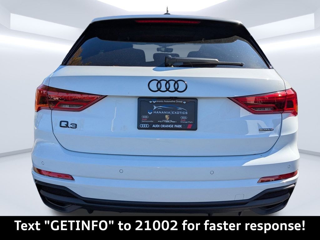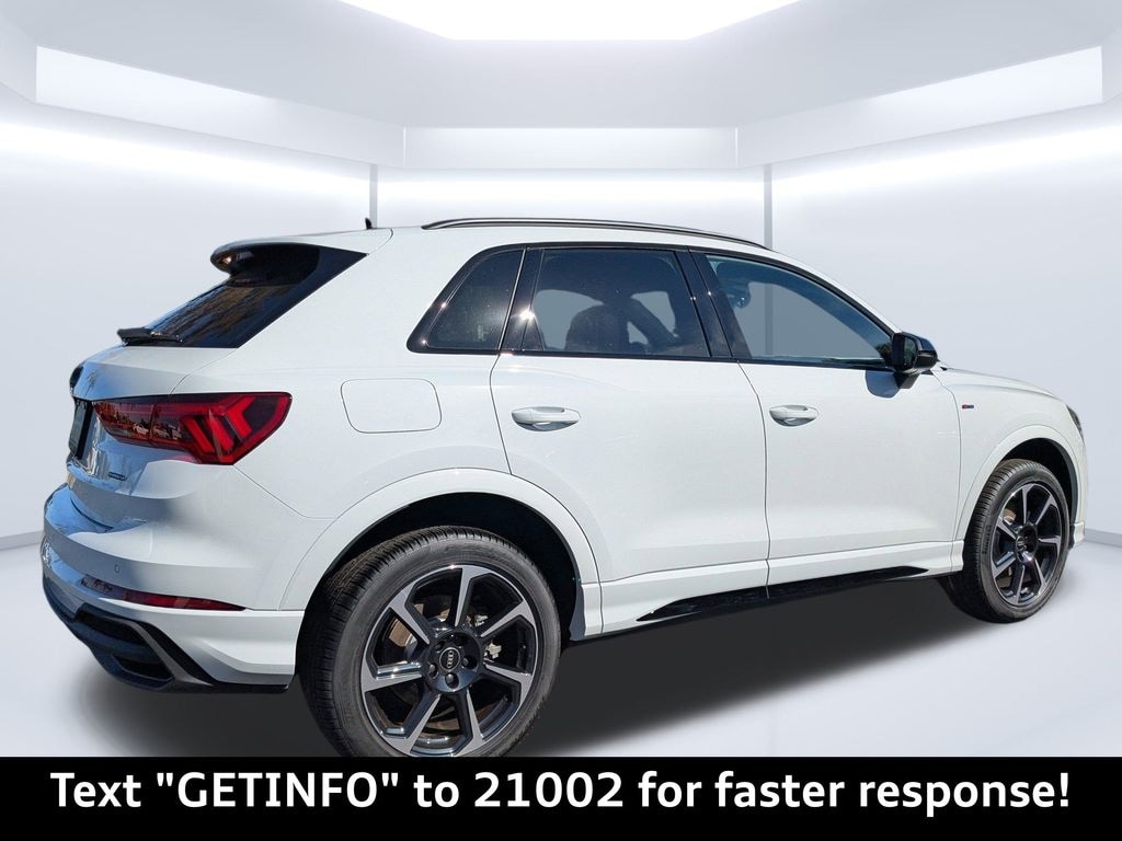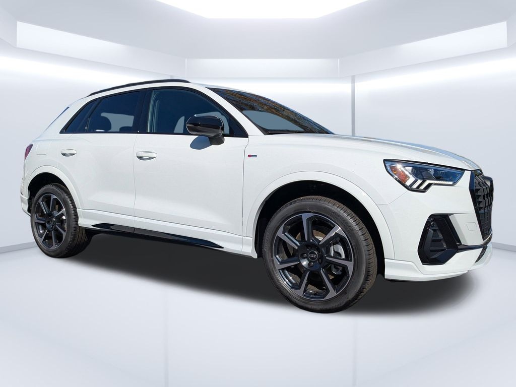 Glacier White Metallic 2025 Audi Q3 S line Premium Plus S Line quattro quattro 8-Speed Automatic with Tiptronic 2.0L 4-Cylinder TFSI Passed Rigorous Safety Inspection Performed by Certified Technician, Meticulously Detailed Inside and Out, Alarm w/Motion Sensor, Audi Advanced Key, Auto-Dimming Power-Folding Exterior Mirrors, Auto-Dimming Rear-View Mirror, Black Exterior Trim, Black Optic Sport Package, Black Roof Rails, Convenience Package, Driver Seat Memory, Garage Door Opener (HomeLink), LED Interior Lighting Package, LED Interior Lighting Plus Package, Premium Plus Package, SiriusXM w/360L (3 Months Trial), SONOS Premium Sound System w/3D Sound, Sport Front Bucket Seats, Top View Camera System, Wheels: 19'' 5-Double-Arm Design, Wireless Phone Charging Pad, 10 Speakers, 21'' Alloy wheels, 4-Wheel Disc Brakes, ABS brakes, Air Conditioning, AM/FM radio, Audi smartphone interface (Apple CarPlay/Android Auto), Auto High-beam Headlights, Automatic temperature control, Brake assist, Bumpers: body-color, Delay-off headlights, Driver door bin, Driver vanity mirror, Dual front impact airbags, Dual front side impact airbags, Electronic Stability Control, Emergency communication system: Audi connect CARE, Exterior Parking Camera Rear, Four wheel independent suspension, Front anti-roll bar, Front Bucket Seats, Front Center Armrest, Front dual zone A/C, Front fog lights, Front reading lights, Fully automatic headlights, Heated door mirrors, Heated Front Bucket Seats, Heated front seats, Illuminated entry, Knee airbag, Leather Seating Surfaces, Leather Shift Knob, Leather steering wheel, Low tire pressure warning, Occupant sensing airbag, Outside temperature display, Overhead airbag, Overhead console, Panic alarm, Passenger door bin, Passenger vanity mirror, Power door mirrors, Power driver seat, Power Liftgate, Power moonroof: Panoramic, Power passenger seat, Power steering, Power windows, Radio data system, Radio: Audi Sound System, Rain sensing wipers, Rear air conditioning, Rear anti-roll bar, Rear fog lights, Rear reading lights, Rear seat center armrest, Rear window defroster, Rear window wiper, Remote keyless entry, Speed control, Speed-sensing steering, Split folding rear seat, Spoiler, Steering wheel mounted audio controls, Tachometer, Telescoping steering wheel, Tilt steering wheel, Traction control, Trip computer, Turn signal indicator mirrors, Variably intermittent wipers, Wheels: 18'' 5-V-Spoke-S Design, CLEAN CARFAX, Alarm w/Motion Sensor, Audi Advanced Key, Auto-Dimming Power-Folding Exterior Mirrors, Auto-Dimming Rear-View Mirror, Black Exterior Trim, Black Optic Sport Package, Black Roof Rails, Convenience Package, Driver Seat Memory, Garage Door Opener (HomeLink), LED Interior Lighting Package, LED Interior Lighting Plus Package, Premium Plus Package, SiriusXM w/360L (3 Months Trial), SONOS Premium Sound System w/3D Sound, Sport Front Bucket Seats, Top View Camera System, Wheels: 19'' 5-Double-Arm Design, Wireless Phone Charging Pad.20/28 City/Highway MPG