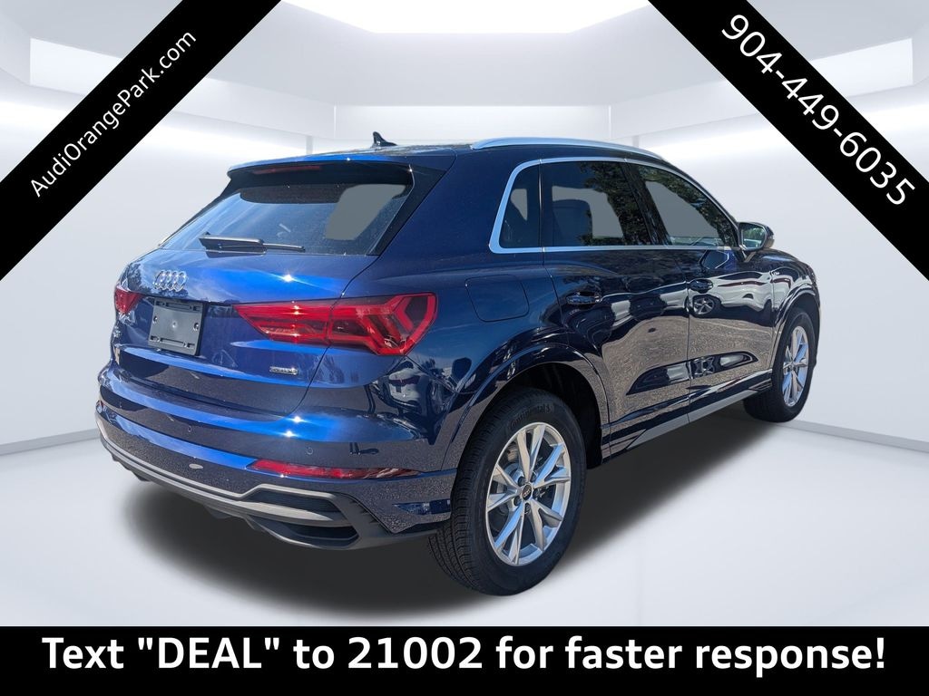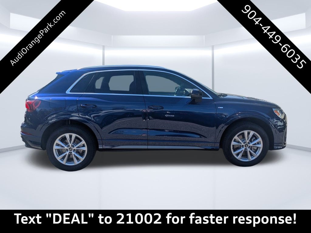 Navarra Blue Metallic 2025 Audi Q3 S line Premium Plus S Line quattro quattro 8-Speed Automatic with Tiptronic 2.0L 4-Cylinder TFSI Passed Rigorous Safety Inspection Performed by Certified Technician, Meticulously Detailed Inside and Out, 10 Speakers, 21'' Alloy wheels, 4-Wheel Disc Brakes, ABS brakes, Air Conditioning, AM/FM radio, Audi smartphone interface (Apple CarPlay/Android Auto), Auto High-beam Headlights, Automatic temperature control, Brake assist, Bumpers: body-color, Delay-off headlights, Driver door bin, Driver vanity mirror, Dual front impact airbags, Dual front side impact airbags, Electronic Stability Control, Emergency communication system: Audi connect CARE, Exterior Parking Camera Rear, Four wheel independent suspension, Front anti-roll bar, Front Bucket Seats, Front Center Armrest, Front dual zone A/C, Front fog lights, Front reading lights, Fully automatic headlights, Heated door mirrors, Heated Front Bucket Seats, Heated front seats, Illuminated entry, Knee airbag, Leather Seating Surfaces, Leather Shift Knob, Leather steering wheel, Low tire pressure warning, Occupant sensing airbag, Outside temperature display, Overhead airbag, Overhead console, Panic alarm, Passenger door bin, Passenger vanity mirror, Power door mirrors, Power driver seat, Power Liftgate, Power moonroof: Panoramic, Power passenger seat, Power steering, Power windows, Radio data system, Radio: Audi Sound System, Rain sensing wipers, Rear air conditioning, Rear anti-roll bar, Rear fog lights, Rear reading lights, Rear seat center armrest, Rear window defroster, Rear window wiper, Remote keyless entry, Speed control, Speed-sensing steering, Split folding rear seat, Spoiler, Steering wheel mounted audio controls, Tachometer, Telescoping steering wheel, Tilt steering wheel, Traction control, Trip computer, Turn signal indicator mirrors, Variably intermittent wipers, Wheels: 18'' 5-V-Spoke-S Design, CLEAN CARFAX.20/28 City/Highway MPG