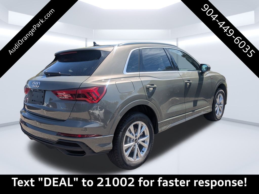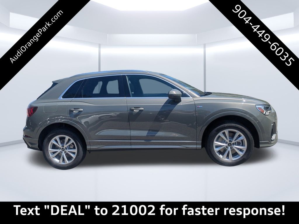 Gray 2025 Audi Q3 S line Premium S Line quattro quattro 8-Speed Automatic with Tiptronic 2.0L 4-Cylinder TFSI Passed Rigorous Safety Inspection Performed by Certified Technician, Meticulously Detailed Inside and Out, 10 Speakers, 21'' Alloy wheels, 4-Wheel Disc Brakes, ABS brakes, Air Conditioning, AM/FM radio, Audi smartphone interface (Apple CarPlay/Android Auto), Auto High-beam Headlights, Automatic temperature control, Brake assist, Bumpers: body-color, Delay-off headlights, Driver door bin, Driver vanity mirror, Dual front impact airbags, Dual front side impact airbags, Electronic Stability Control, Emergency communication system: Audi connect CARE, Exterior Parking Camera Rear, Four wheel independent suspension, Front anti-roll bar, Front Bucket Seats, Front Center Armrest, Front dual zone A/C, Front fog lights, Front reading lights, Fully automatic headlights, Heated door mirrors, Heated Front Bucket Seats, Heated front seats, Illuminated entry, Knee airbag, Leather Seating Surfaces, Leather Shift Knob, Leather steering wheel, Low tire pressure warning, Occupant sensing airbag, Outside temperature display, Overhead airbag, Overhead console, Panic alarm, Passenger door bin, Passenger vanity mirror, Power door mirrors, Power driver seat, Power Liftgate, Power moonroof: Panoramic, Power passenger seat, Power steering, Power windows, Radio data system, Radio: Audi Sound System, Rain sensing wipers, Rear air conditioning, Rear anti-roll bar, Rear fog lights, Rear reading lights, Rear seat center armrest, Rear window defroster, Rear window wiper, Remote keyless entry, Speed control, Speed-sensing steering, Split folding rear seat, Spoiler, Steering wheel mounted audio controls, Tachometer, Telescoping steering wheel, Tilt steering wheel, Traction control, Trip computer, Turn signal indicator mirrors, Variably intermittent wipers, Wheels: 18'' 5-V-Spoke-S Design, CLEAN CARFAX.20/28 City/Highway MPG