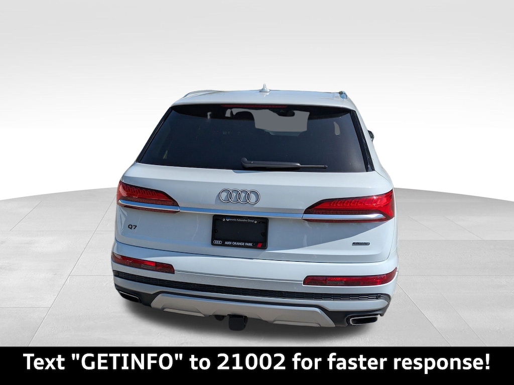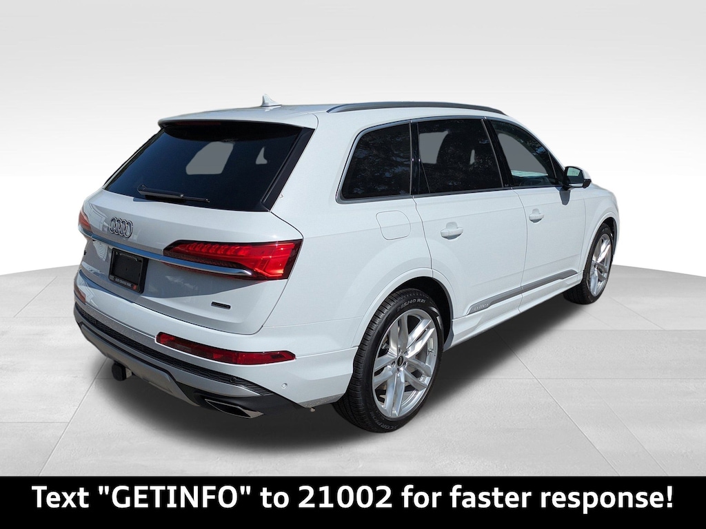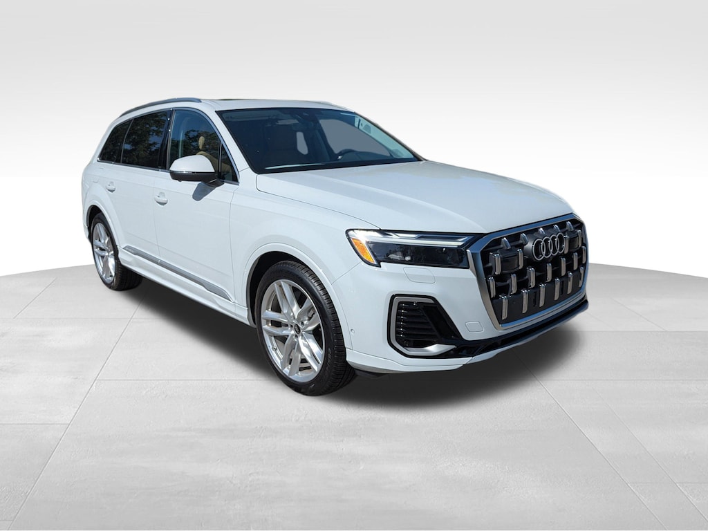 Glacier White Metallic 2025 Audi Q7 Premium Plus quattro quattro 8-Speed Automatic with Tiptronic 3.0L TFSI Passed Rigorous Safety Inspection Performed by Certified Technician, Meticulously Detailed Inside and Out, Bang & Olufsen Premium Sound System w/3D Sound, Comfort Adaptive Air Suspension, Control Buttons in Gloss Black w/Haptic Feedback, Convenience Package, Dual-Pane Acoustic Glass for Side Windows, Executive Package (DISC), Executive Plus Package, Four-Zone Automatic Climate Control, Front Seats w/Ventilation, Heated Rear Seats, Heated Steering Wheel, Illuminated Door Sills, LED Interior Lighting Package Plus, Power Soft-Closing Doors, Premium Plus Package, Rear Door/Side Windows & Tailgate Sunshades, Top View Camera System, Traffic Sign Recognition, Wheels: 20'' 5-Double-Spoke, Wireless Phone Charging Pad, 10 Speakers, 21'' Alloy wheels, 3rd row seats: bench, 4-Wheel Disc Brakes, ABS brakes, Air Conditioning, Auto High-beam Headlights, Auto-dimming door mirrors, Auto-dimming Rear-View mirror, Automatic temperature control, Brake assist, Bumpers: body-color, Compass, Delay-off headlights, Driver door bin, Driver vanity mirror, Dual front impact airbags, Dual front side impact airbags, Electronic Stability Control, Emergency communication system: Audi connect CARE, Exterior Parking Camera Rear, Four wheel independent suspension, Front anti-roll bar, Front Bucket Seats, Front Center Armrest, Front dual zone A/C, Front fog lights, Front reading lights, Fully automatic headlights, Garage door transmitter: HomeLink, Genuine wood door panel insert, Heated door mirrors, Heated Front Bucket Seats, Heated front seats, Illuminated entry, Leather Seating Surfaces, Leather Shift Knob, Leather steering wheel, Low tire pressure warning, Memory seat, Navigation system: Audi MMI Navigation plus with Touch Response, Occupant sensing airbag, Outside temperature display, Overhead airbag, Overhead console, Panic alarm, Passenger door bin, Passenger vanity mirror, Power door mirrors, Power driver seat, Power Liftgate, Power moonroof: Panoramic, Power passenger seat, Power steering, Power windows, Radio data system, Radio: Audi Sound System, Rain sensing wipers, Rear air conditioning, Rear anti-roll bar, Rear fog lights, Rear reading lights, Rear seat center armrest, Rear side impact airbag, Rear window defroster, Rear window wiper, Reclining 3rd row seat, Remote keyless entry, Security system, Speed control, Speed-sensing steering, Split folding rear seat, Spoiler, Steering wheel memory, Steering wheel mounted audio controls, Tachometer, Telescoping steering wheel, Tilt steering wheel, Traction control, Trip computer, Turn signal indicator mirrors, Variably intermittent wipers, Wheels: 19'' 5-Arm-Star Design, CLEAN CARFAX, Bang & Olufsen Premium Sound System w/3D Sound, Comfort Adaptive Air Suspension, Control Buttons in Gloss Black w/Haptic Feedback, Convenience Package, Dual-Pane Acoustic Glass for Side Windows, Executive Package (DISC), Executive Plus Package, Four-Zone Automatic Climate Control, Front Seats w/Ventilation, Heated Rear Seats, Heated Steering Wheel, Illuminated Door Sills, LED Interior Lighting Package Plus, Power Soft-Closing Doors, Premium Plus Package, Rear Door/Side Windows & Tailgate Sunshades, Top View Camera System, Traffic Sign Recognition, Wheels: 20'' 5-Double-Spoke, Wireless Phone Charging Pad.